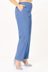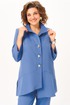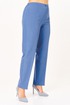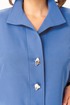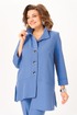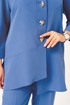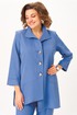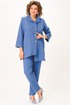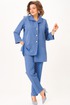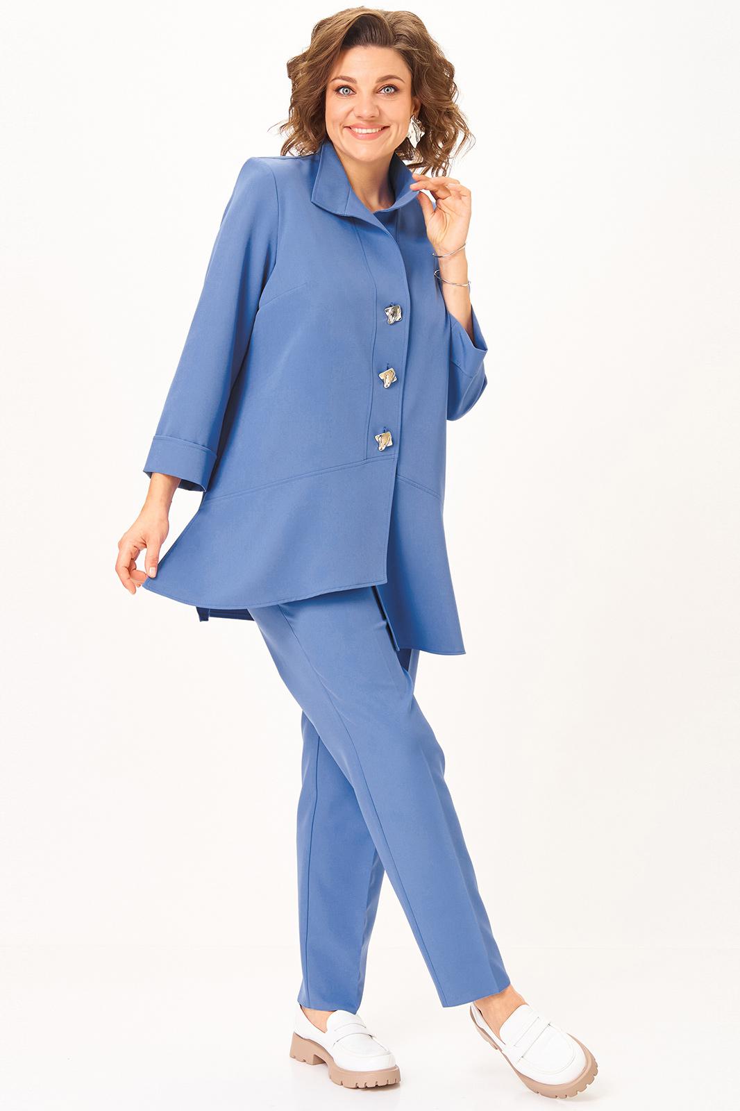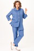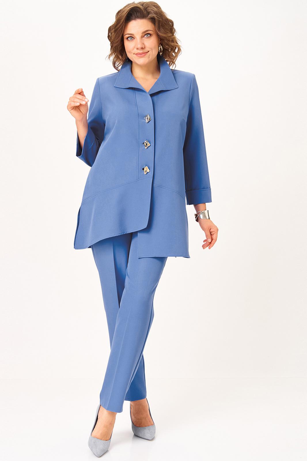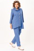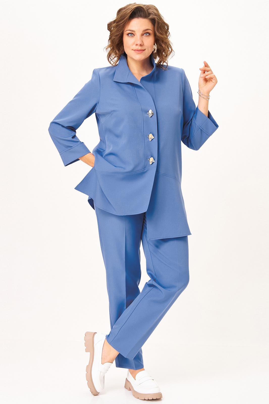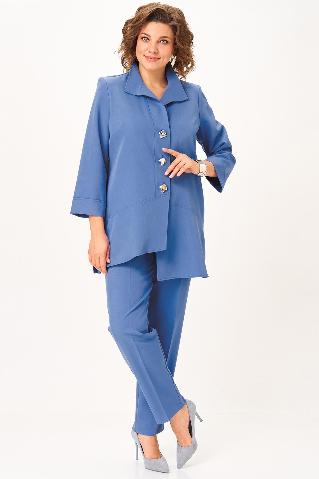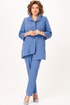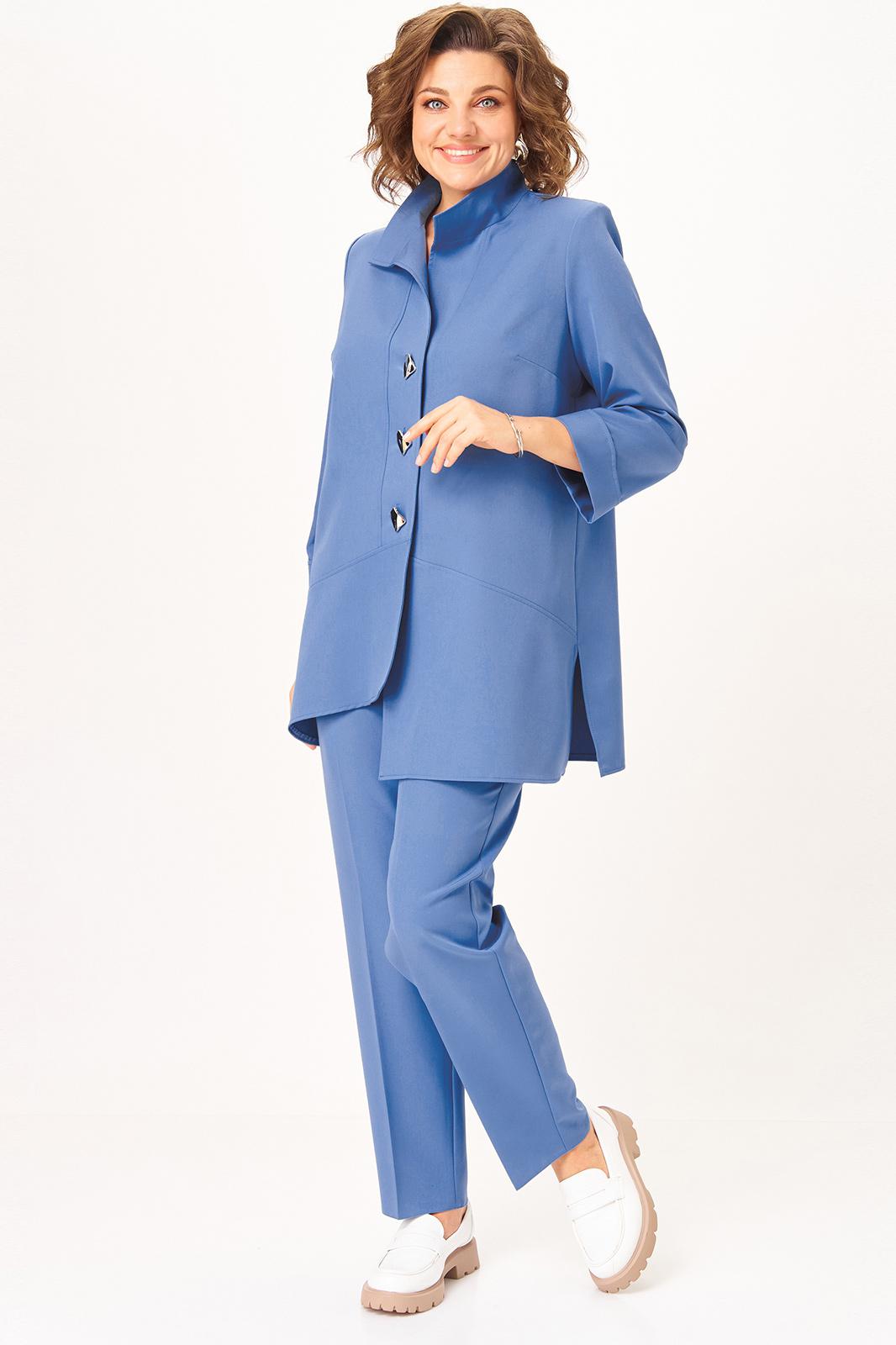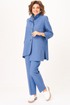 Комплект женский, состоящий из туники и брюк. Туника А-образного силуэта с центральной застежкой на планку до подреза на 3 декоративные петли-пуговицы. Перед с нагрудной вытачкой и фигурными подрезами. Спинка с горизонтальной кокеткой и двумя складками. В боковых швах обработаны разрезы. Низ переда ассиметричен и слегка разведен. Рукава втачные одношовные длиной 3/4 с защипом, имитирующим манжет. Воротник-стойка. Брюки классического кроя, зауженные к низу с притачным поясом сзади на резинке. Застежка на тесьму-молнию в среднем шве передних половинок и 1 петлю-пуговицу по поясу. На брюках заутюжены канты.