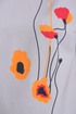 Костюм женский двухпредметный, состоящий из блузки и брюк. Блузка прямого силуэта, декорированная печатью с нагрудными вытачками, выходящими из боковых швов. Горловина по переду овальной формы, а по спинке имеет V-образный вырез. Рукав втачной короткий одношовный. Спинка с горизонтальной кокеткой. Низ переда имеет фантазийную форму, по спинке удлинённую. Брюки слегка зауженные к низу, с притачным поясом на резинке по задним половинкам и с застёжкой на тесьму-молнию и 1 петлю-пуговицу по поясу. Тесьма - молния обработана в средних срезах передних половинок брюк. Длина блузки по спинке - 58 см. Длина рукава - 28,5 см. Длина брюк по боковому шву - 99 см.