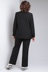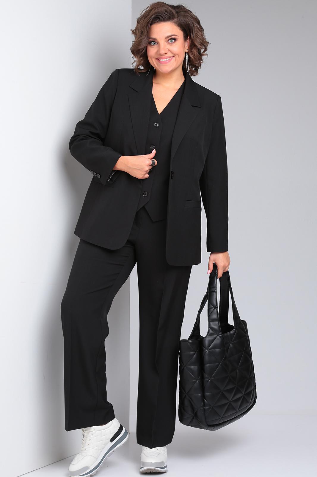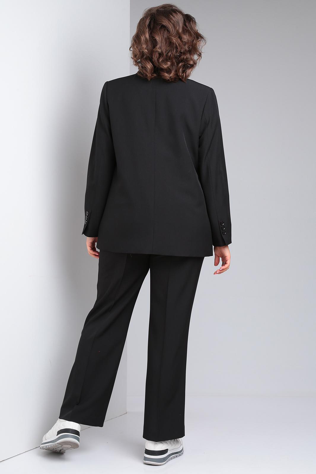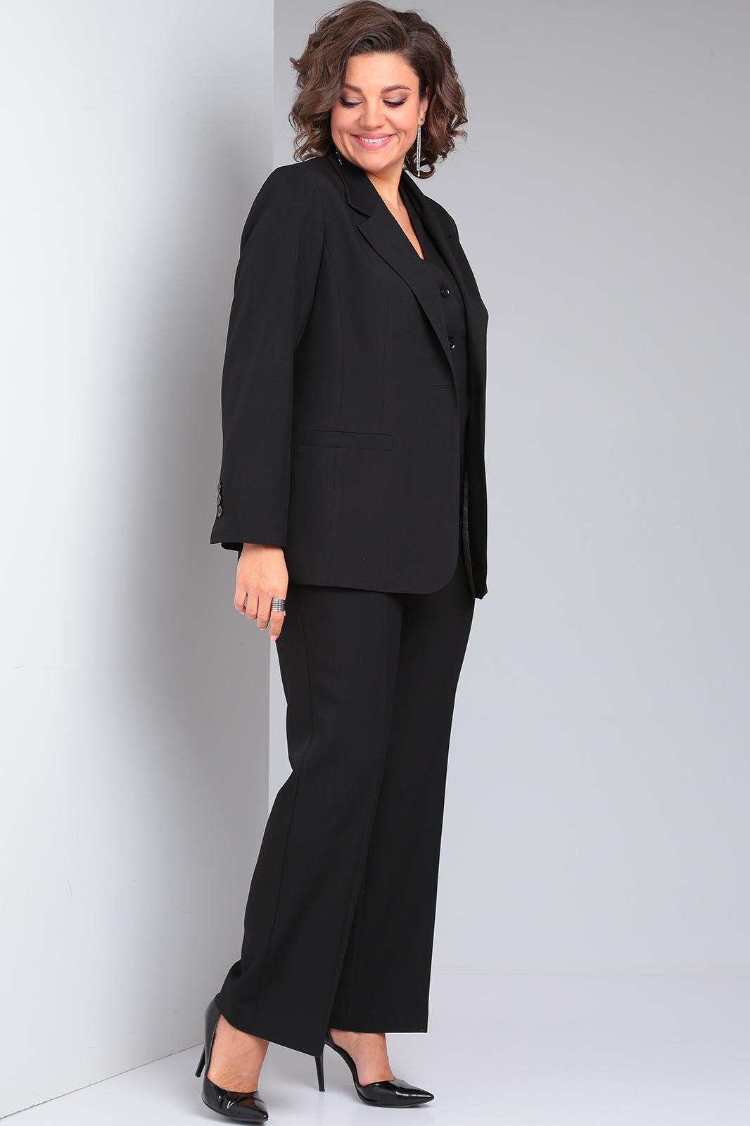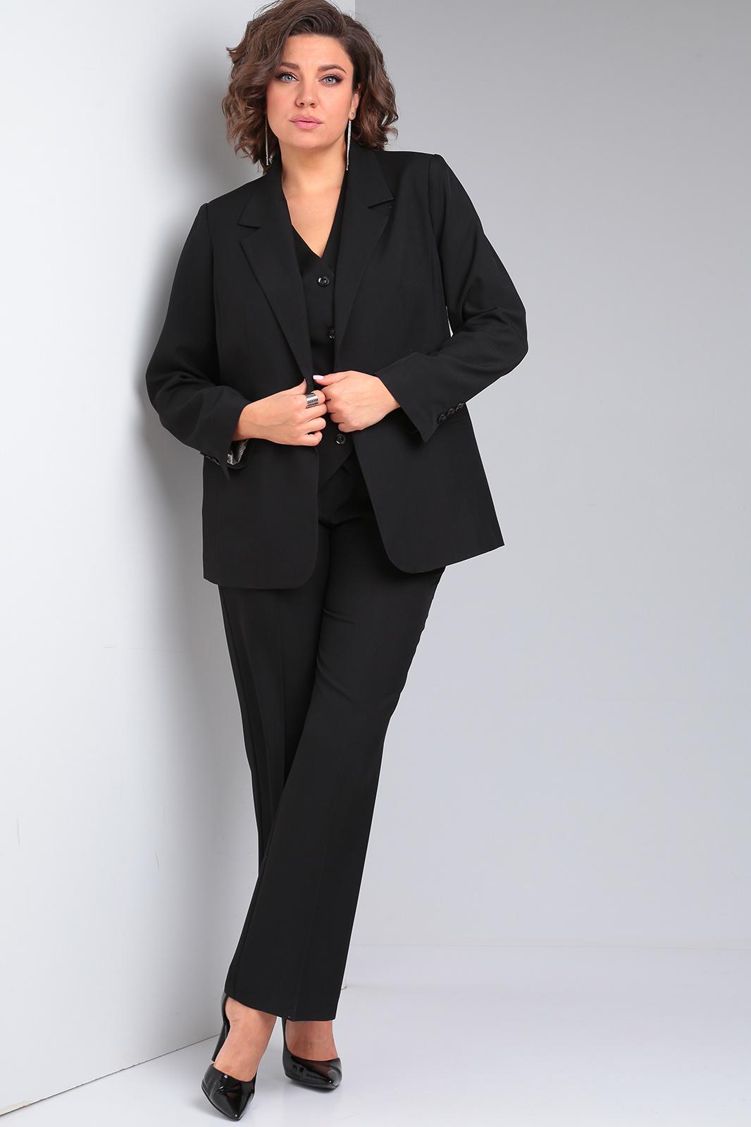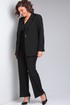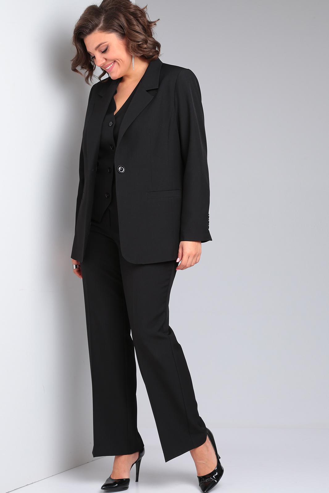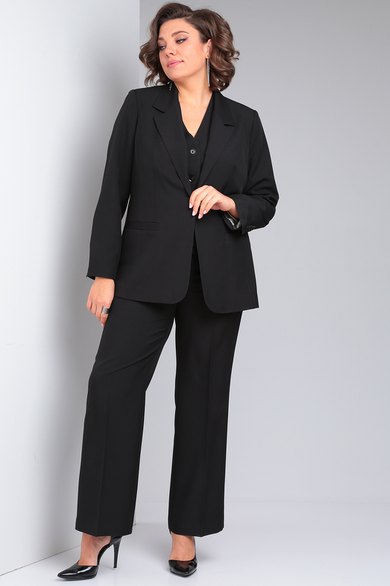 Костюм женский 3-х предметный, полуприлегающего силуэта. Состоит из жакета и жилета на подкладке и брюк. Жакет с воротником пиджачного типа, центральной застёжкой на 1 петлю и 1 пуговицу. Перед с рельефными швами от пройм до низа и талиевыми вытачками и прорезными карманами с листочками с втачными концами. Спинка со средним швом. Рукав втачной, двухшовный, длинный со шлицей. Жилет с рельефными швами от пройм до низа по переду и спинке, с центральной застёжкой на 4 петли и 4 пуговицы. Перед с прорезными карманами с листочками с втачными концами. Брюки с застёжкой на тесьму молнию в средних срезах передних половинок, с притачным поясом на 1 петлю и 1 пуговицу и резинкой по задним половинкам, с карманами наклонными к боковым швам. По передним и задним половинкам заутюженные канты. Длина жакета по спинке - 71 см. Длина рукава - 61 см. Длина жилета по спинке - 54 см. Длина брюк по боковому шву - 101 см.