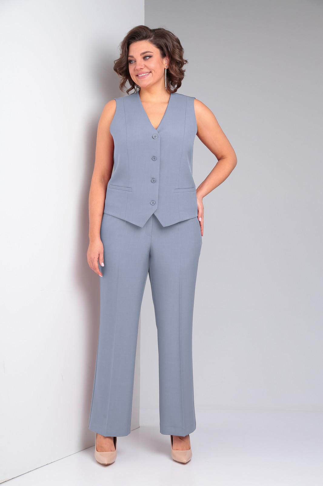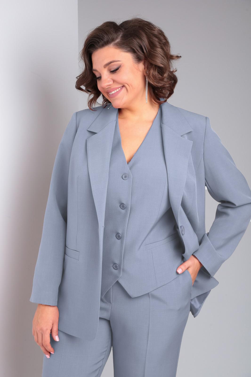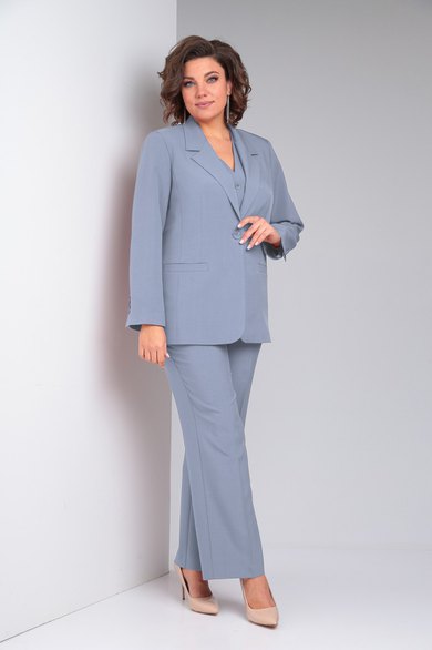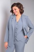 Костюм женский 3-х предметный, полуприлегающего силуэта. Состоит из жакета и жилета на подкладке и брюк. Жакет с воротником пиджачного типа, центральной застёжкой на 1 петлю и 1 пуговицу. Перед с рельефными швами от пройм до низа и талиевыми вытачками и прорезными карманами с листочками с втачными концами. Спинка со средним швом. Рукав втачной, двухшовный, длинный со шлицей. Жилет с рельефными швами от пройм до низа по переду и спинке, с центральной застёжкой на 4 петли и 4 пуговицы. Перед с прорезными карманами с листочками с втачными концами. Брюки с застёжкой на тесьму молнию в средних срезах передних половинок, с притачным поясом на 1 петлю и 1 пуговицу и резинкой по задним половинкам, с карманами наклонными к боковым швам. По передним и задним половинкам заутюженные канты. Длина жакета по спинке - 71 см. Длина рукава - 61 см. Длина жилета по спинке - 54 см. Длина брюк по боковому шву - 101 см.