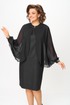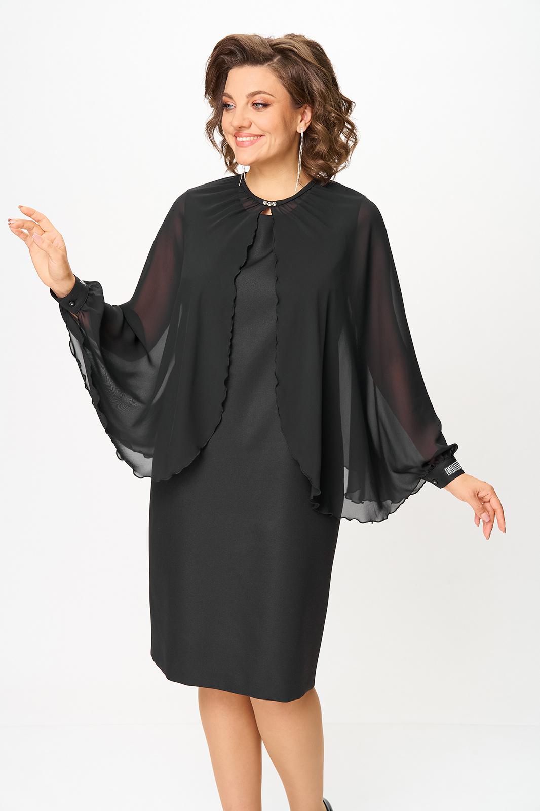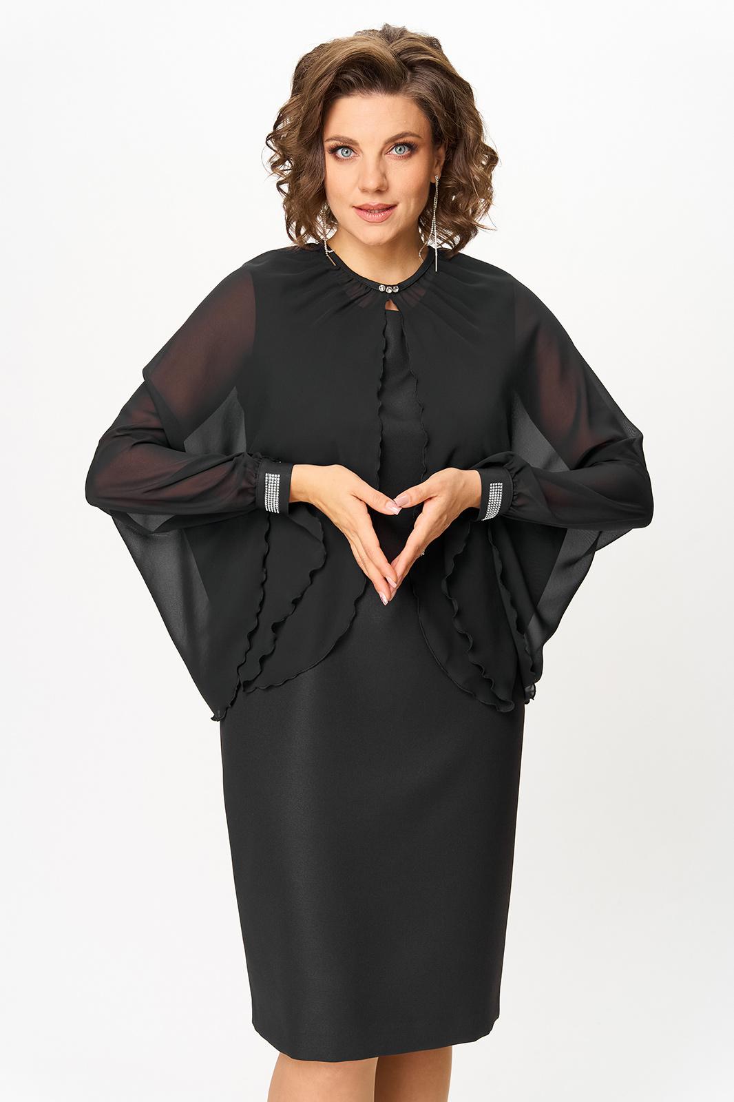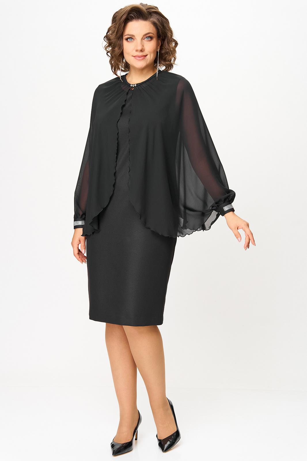 Комплект женский двухпредметный, состоящий из платья и болеро. Платье полуприлегающего силуэта, зауженное к низу. С кокетками и нагрудными вытачками, выходящими из пройм. Спинка со средним швом, в котором обработана шлица и застежка на потайную тесьму-молнию. Болеро из шифона с овальной присборенной горловиной, обработанной бейкой, украшенной по переду пришивными камнями, а сзади застегивающейся навесной петлей и пуговицей. В болеро цельнокроенные со спинкой и передом длинные рукава, заканчивающиеся манжетой с петлей и пуговицей и стыкующиеся по центру переда и спинки. Фигурные края изделия обработаны на флеш.