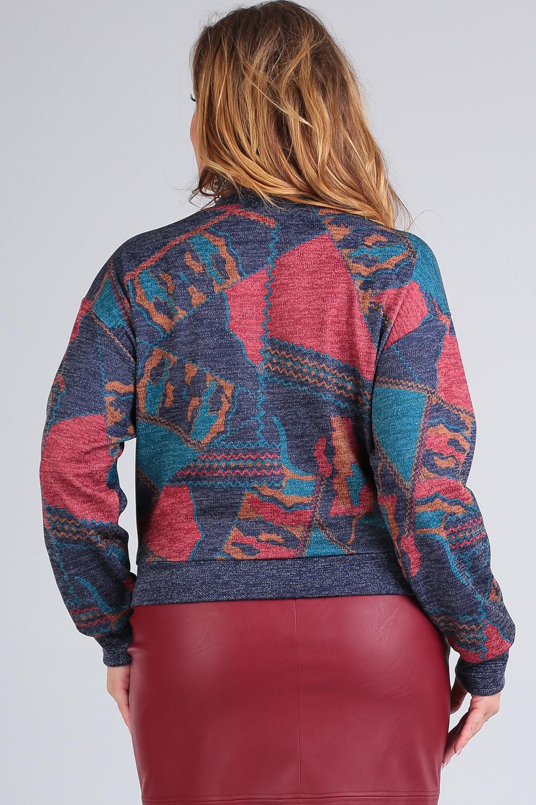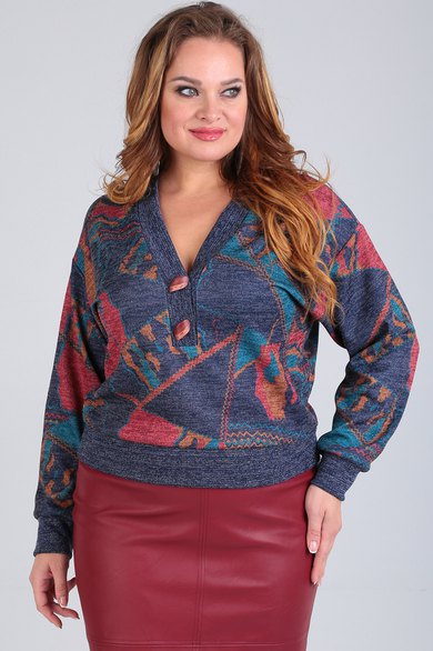 Трикотажный джемпер с втачными рукавами, с имитацией застежки на 2 пуговицы. Без воротника и карманов. Длина изделия ниже линии талии, частично прикрывает бедра. По низу рукавов и низу изделия имитация резинки из основного материала.