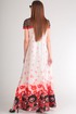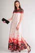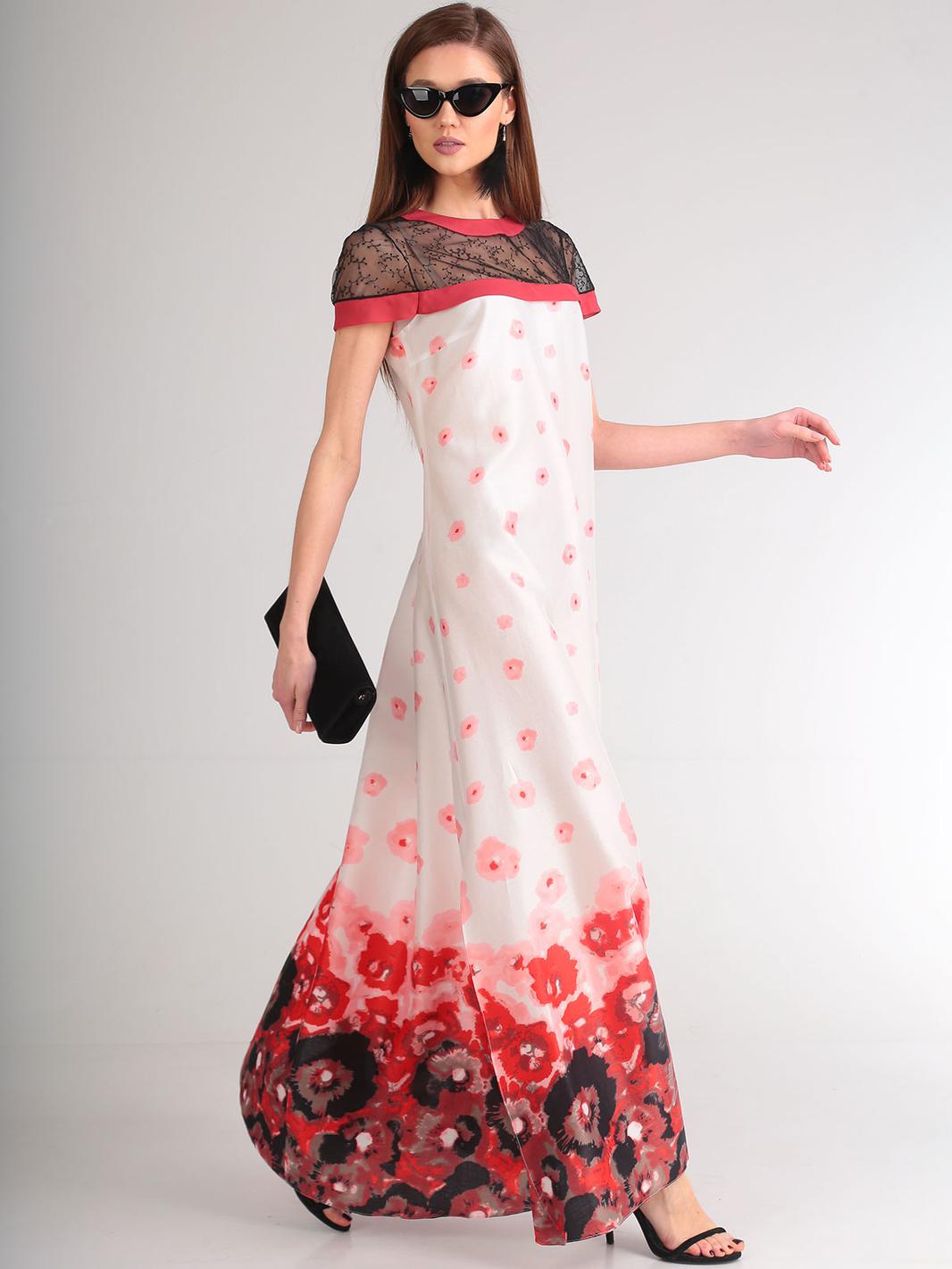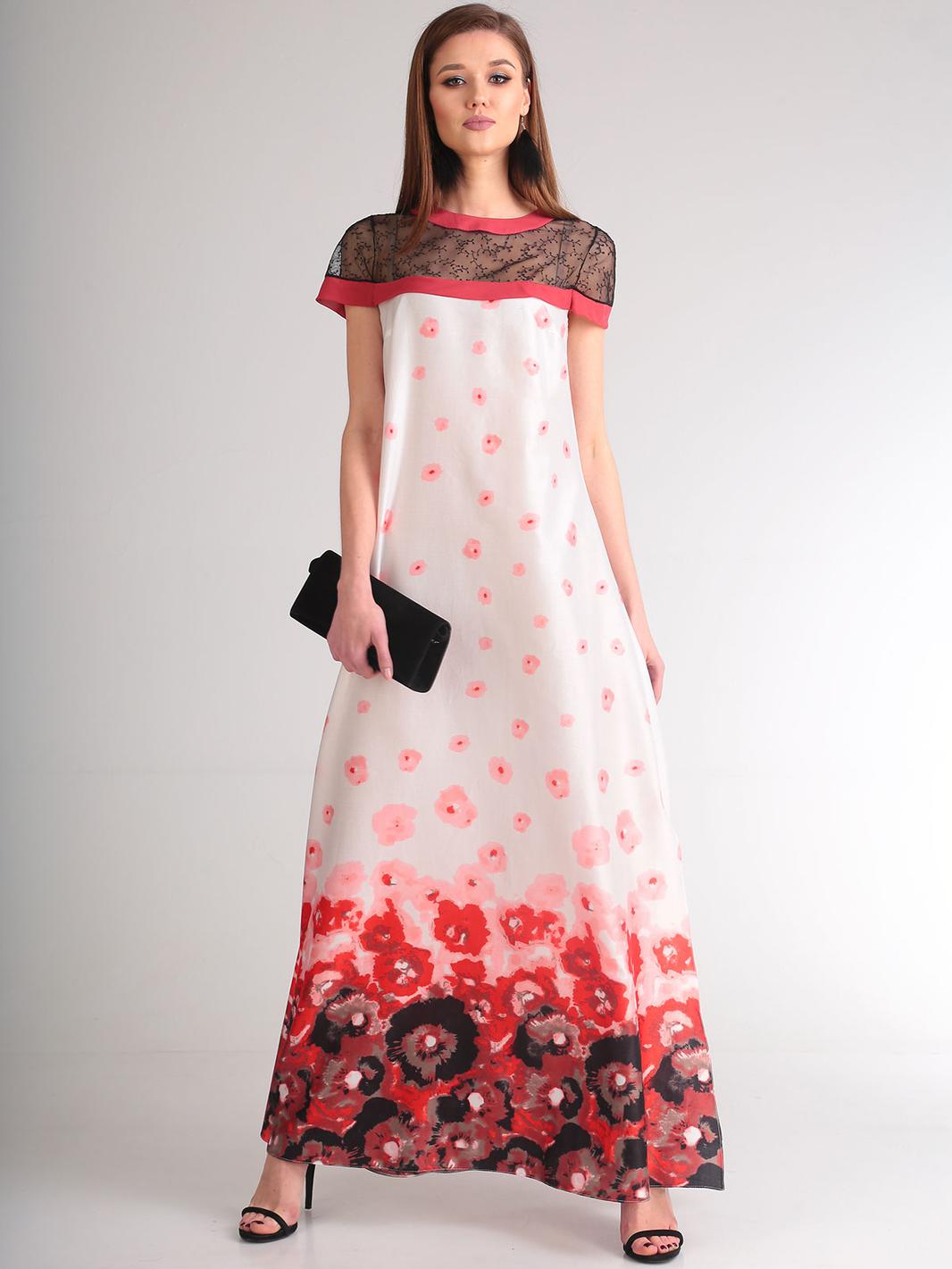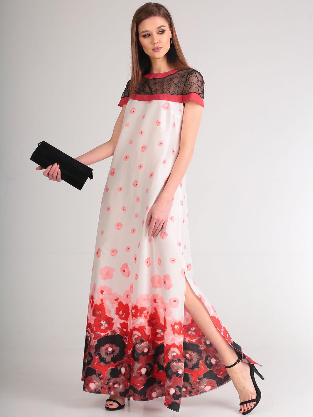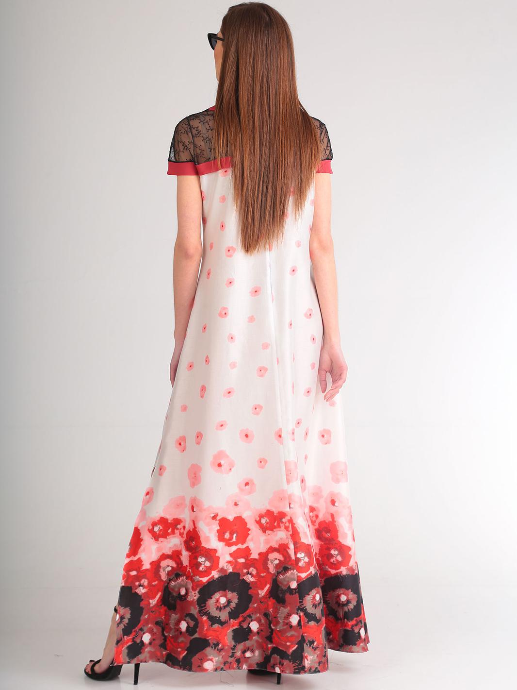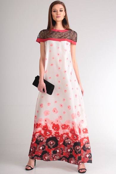 Платье женское, свободного кроя.Горловина округлой формы с планкой из отделочной ткани.По переду и спинке изделия кокетка из отделочной ткани.Рукав короткий,втачной ,одношовный.По кругу верхней части изделия обработана вставка из отделочной ткани.Спинка со средним швом и потайной молнией.В боковых швах изделия обработаны разрезы.Длина изделия по среднему шву спинки 146см.