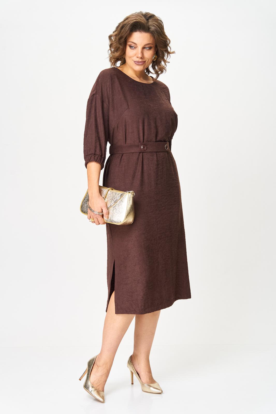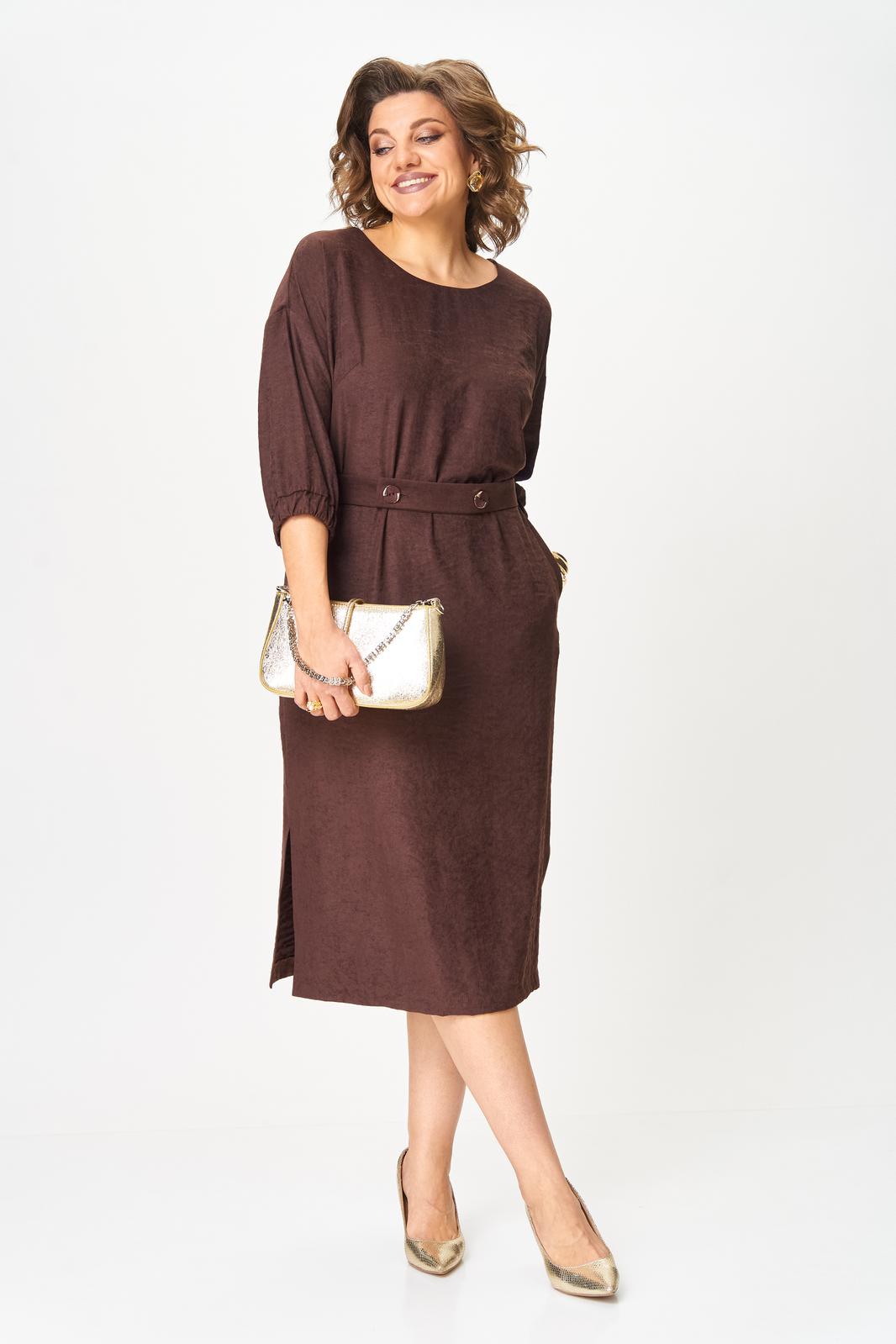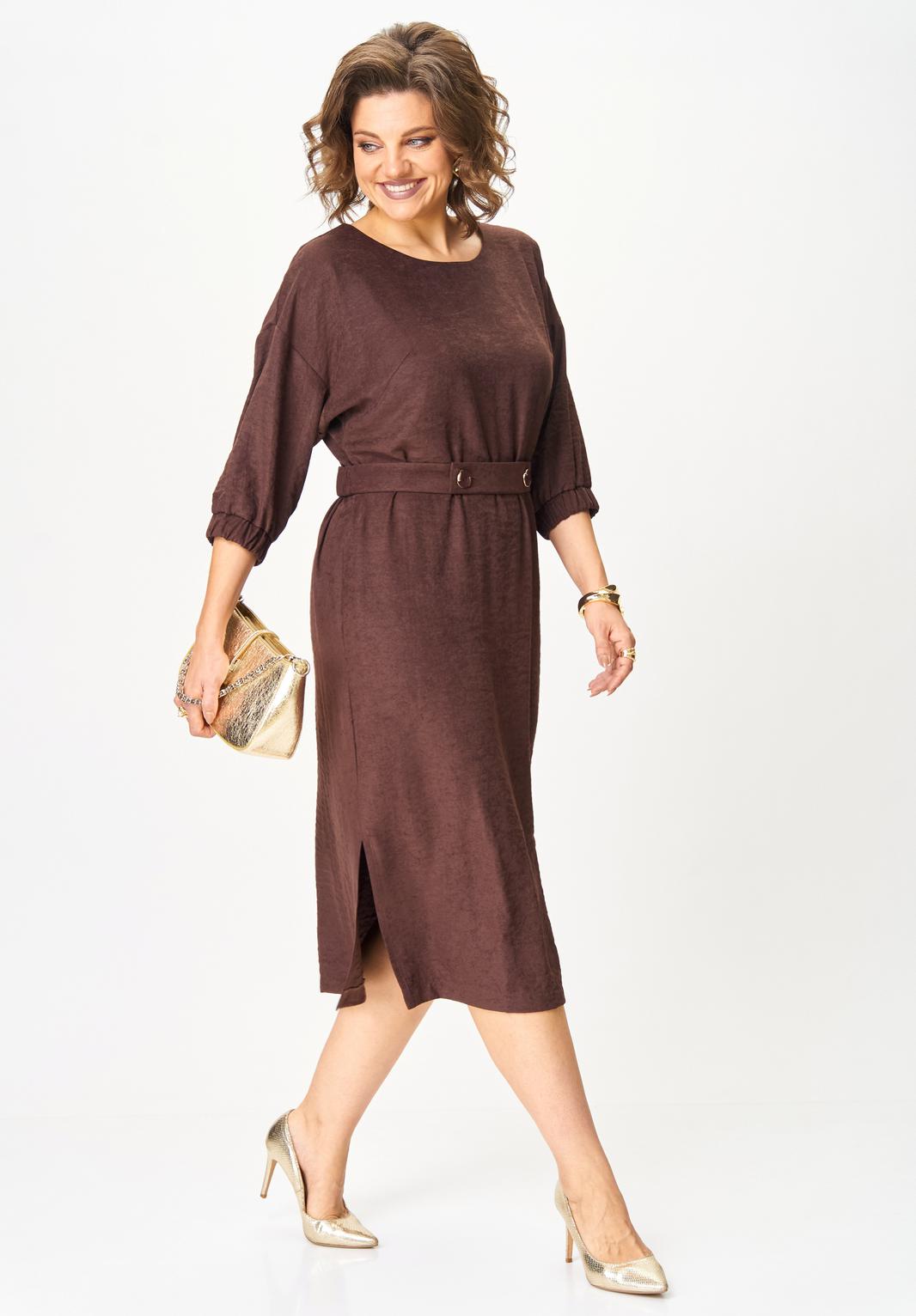 В осенних коллекциях особенно заметна тенденция к практичности и комфортности. Важно использовать одежду, которая не только выглядит шикарно, но и позволяет чувствовать себя уверенно в течение всего дня. При создании данного платья сделали ставку на мягкую ткань с приятной на ощупь бархатистой фактурой, изготовленной на основе лиоцелла, полученного из листьев эвкалипта. Изделие благородного шоколадного цвета излучает непринужденную элегантность. Модель со спущенной линией плеч и круглым вырезом оставили без какого либо декора, но дополнили поясом из этой же ткани (задняя часть пояса с эластичной тесьмой, передняя с застежкой на петли и пуговицы). Платье прямого кроя, длины миди с боковыми разрезами, которые добавляют динамичности силуэту и слегка раскрывают ножки, привлекая внимание к грациозности движений. Рукав 3/4, по низу манжета с эластичной тесьмой. В боковых швах в области бедер для удобства и комфорта обработаны карманы В этом платье вы будете выглядеть неотразимо и со вкусом, отражая истинный дух современной моды!