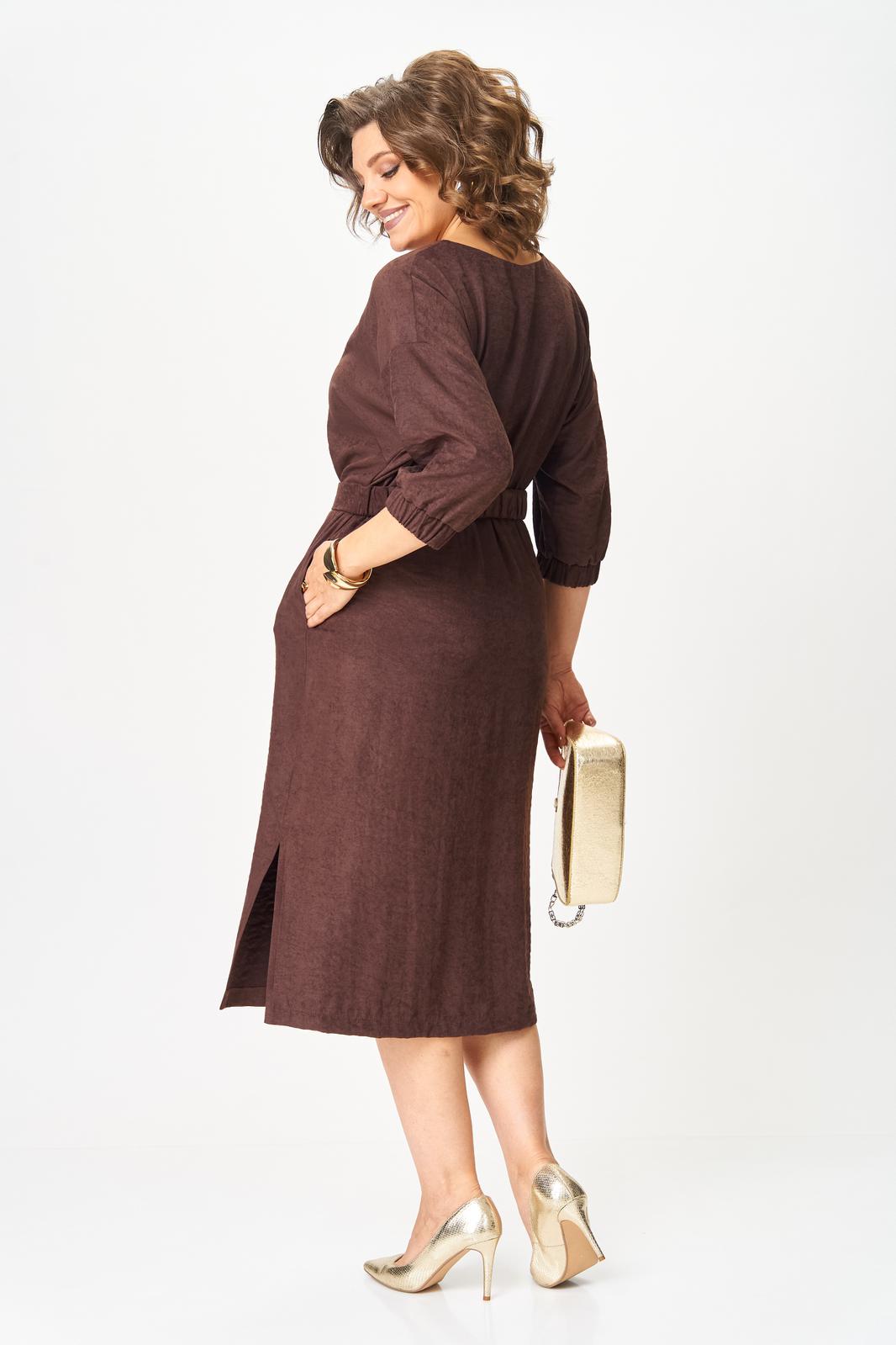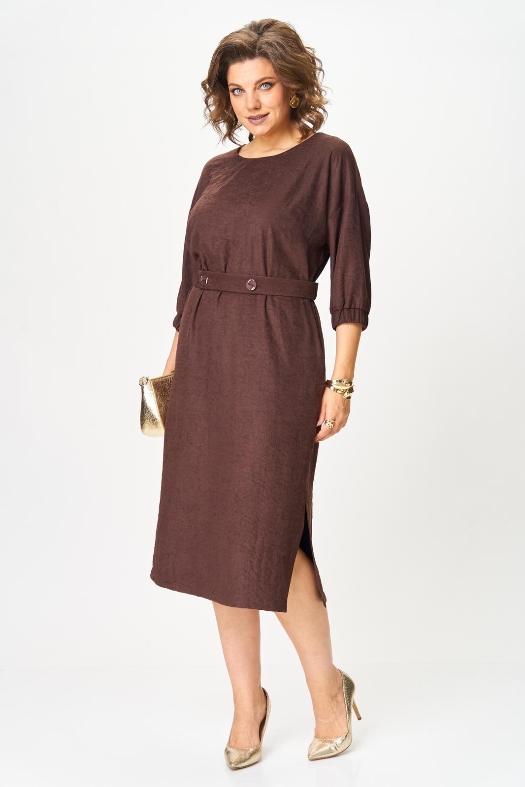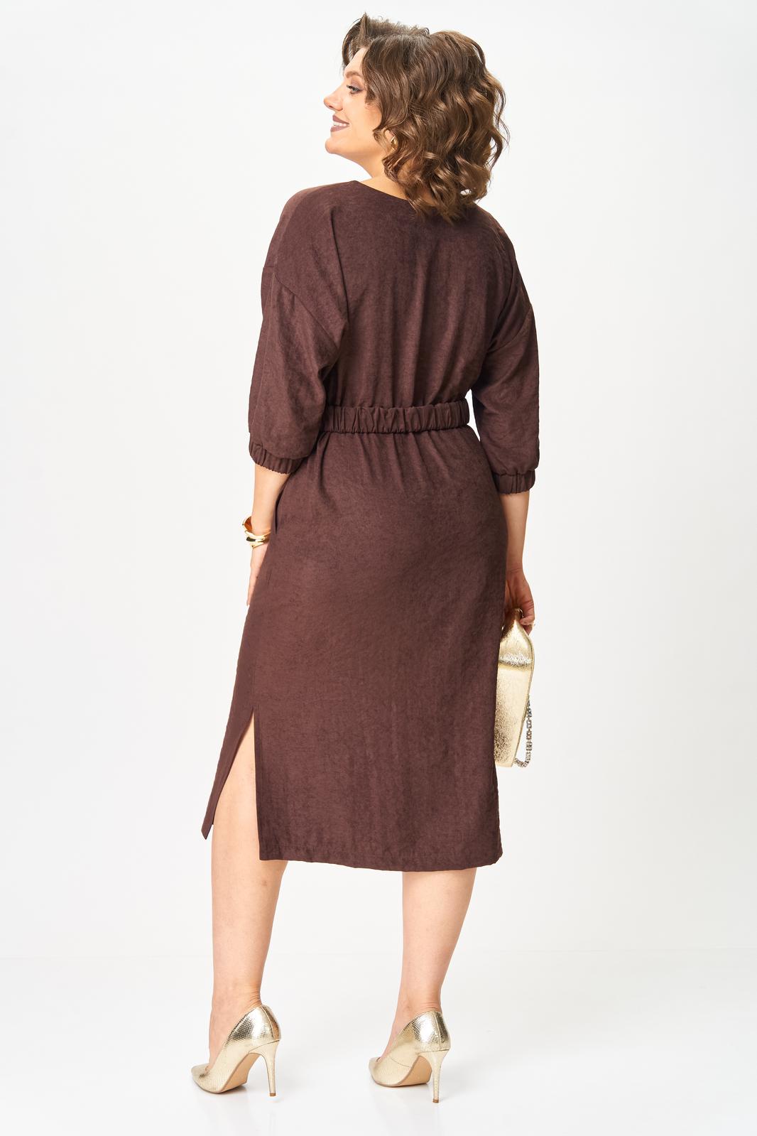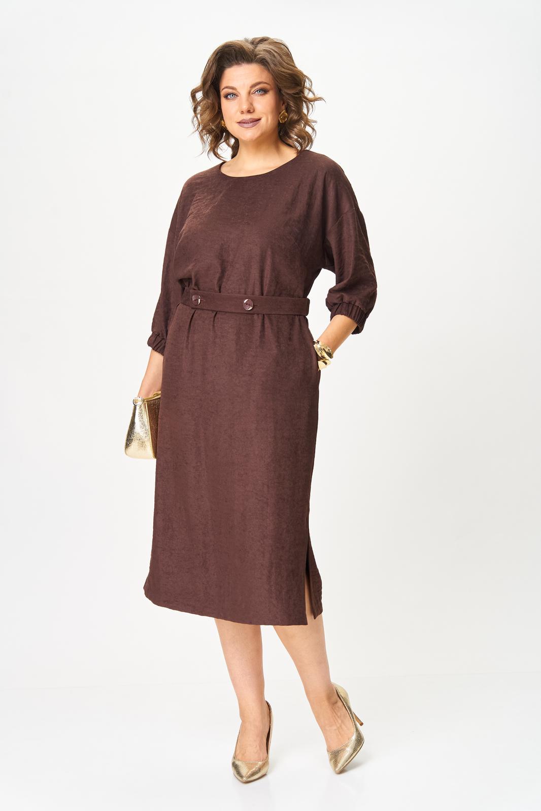 В осенних коллекциях особенно заметна тенденция к практичности и комфортности. Важно использовать одежду, которая не только выглядит шикарно, но и позволяет чувствовать себя уверенно в течение всего дня. При создании данного платья сделали ставку на мягкую ткань с приятной на ощупь бархатистой фактурой, изготовленной на основе лиоцелла, полученного из листьев эвкалипта. Изделие благородного шоколадного цвета излучает непринужденную элегантность. Модель со спущенной линией плеч и круглым вырезом оставили без какого либо декора, но дополнили поясом из этой же ткани (задняя часть пояса с эластичной тесьмой, передняя с застежкой на петли и пуговицы). Платье прямого кроя, длины миди с боковыми разрезами, которые добавляют динамичности силуэту и слегка раскрывают ножки, привлекая внимание к грациозности движений. Рукав 3/4, по низу манжета с эластичной тесьмой. В боковых швах в области бедер для удобства и комфорта обработаны карманы В этом платье вы будете выглядеть неотразимо и со вкусом, отражая истинный дух современной моды!