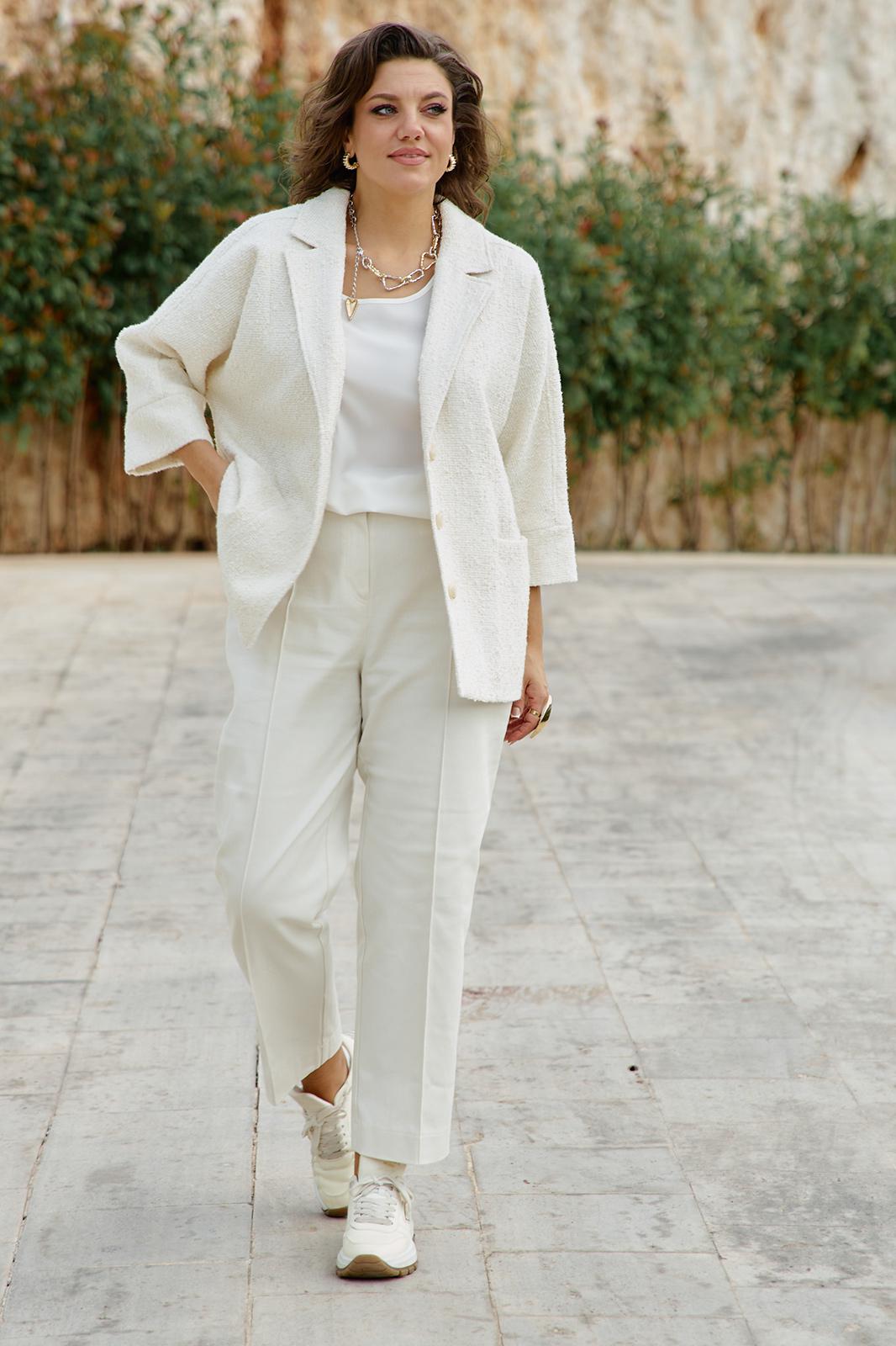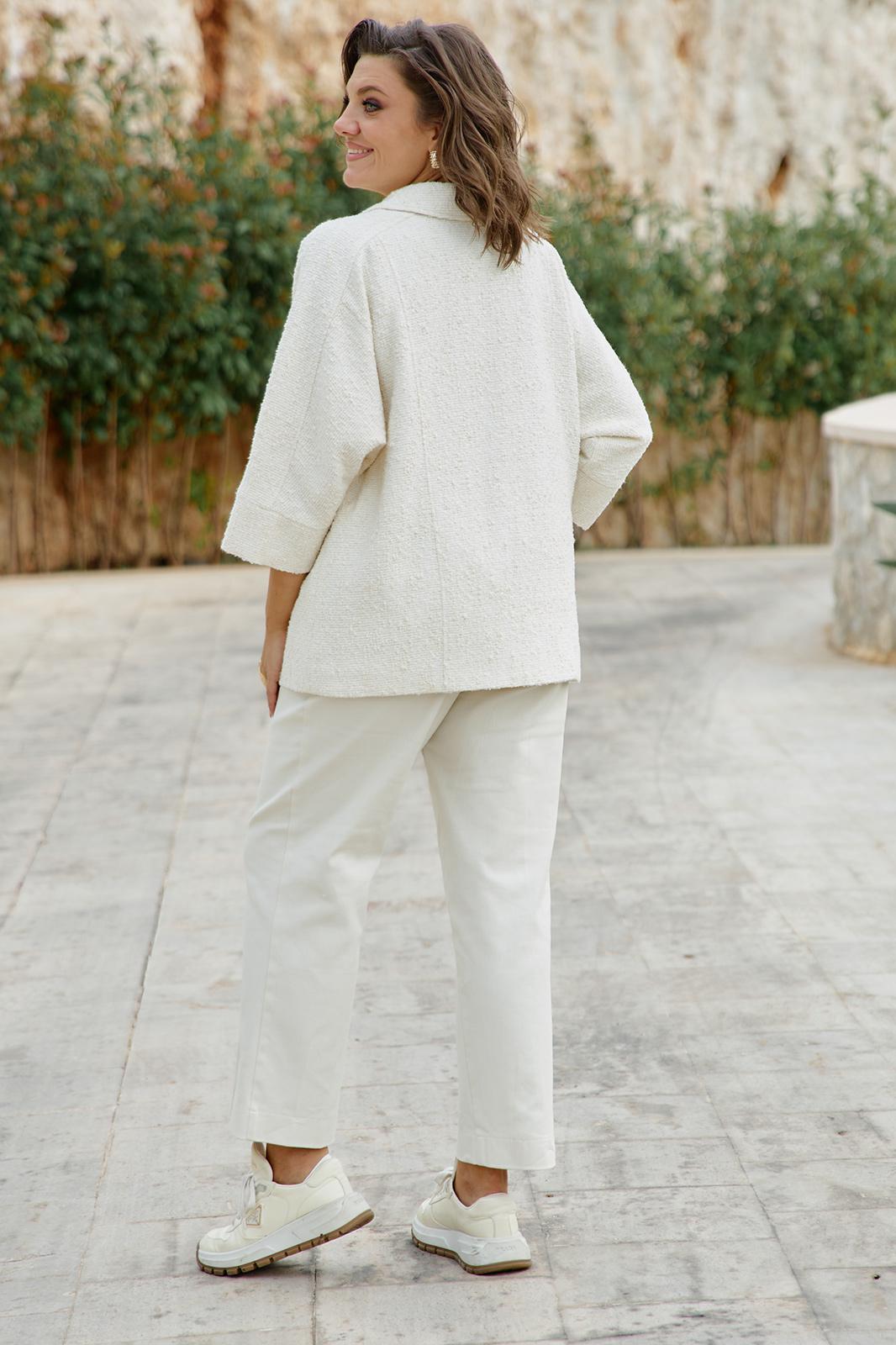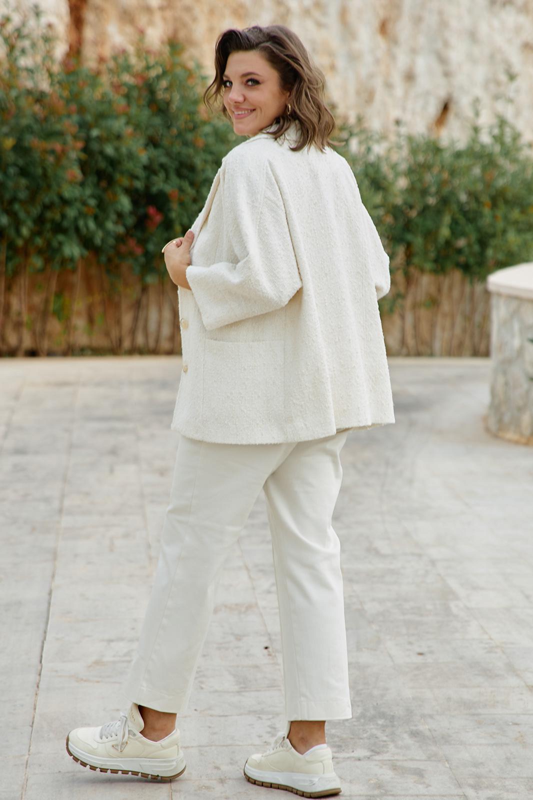 Брюки молочного оттенка — это про лёгкость решений. Они дарят ощущение чистоты и порядка, но без строгости. Это вещь для тех, кто ценит уютную элегантность и хочет выглядеть продуманно, но непринуждённо. Служат основой для минималистичных ансамблей и для более смелых цветовых сочетаний, универсальны — выглядят органично и летом, и в межсезонье. Брюки призаужены к низу, по переду застрочен кант, в брюках прорезные карманы по верхней части, застежка на молнию в гульфике и джинсовую пуговицу по центру пояса. Пояс притачной, на резинке по бокам. На задней части брюк фигурная кокетка и накладные карманы. Длина брюк 98 см.