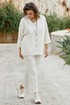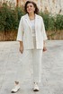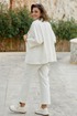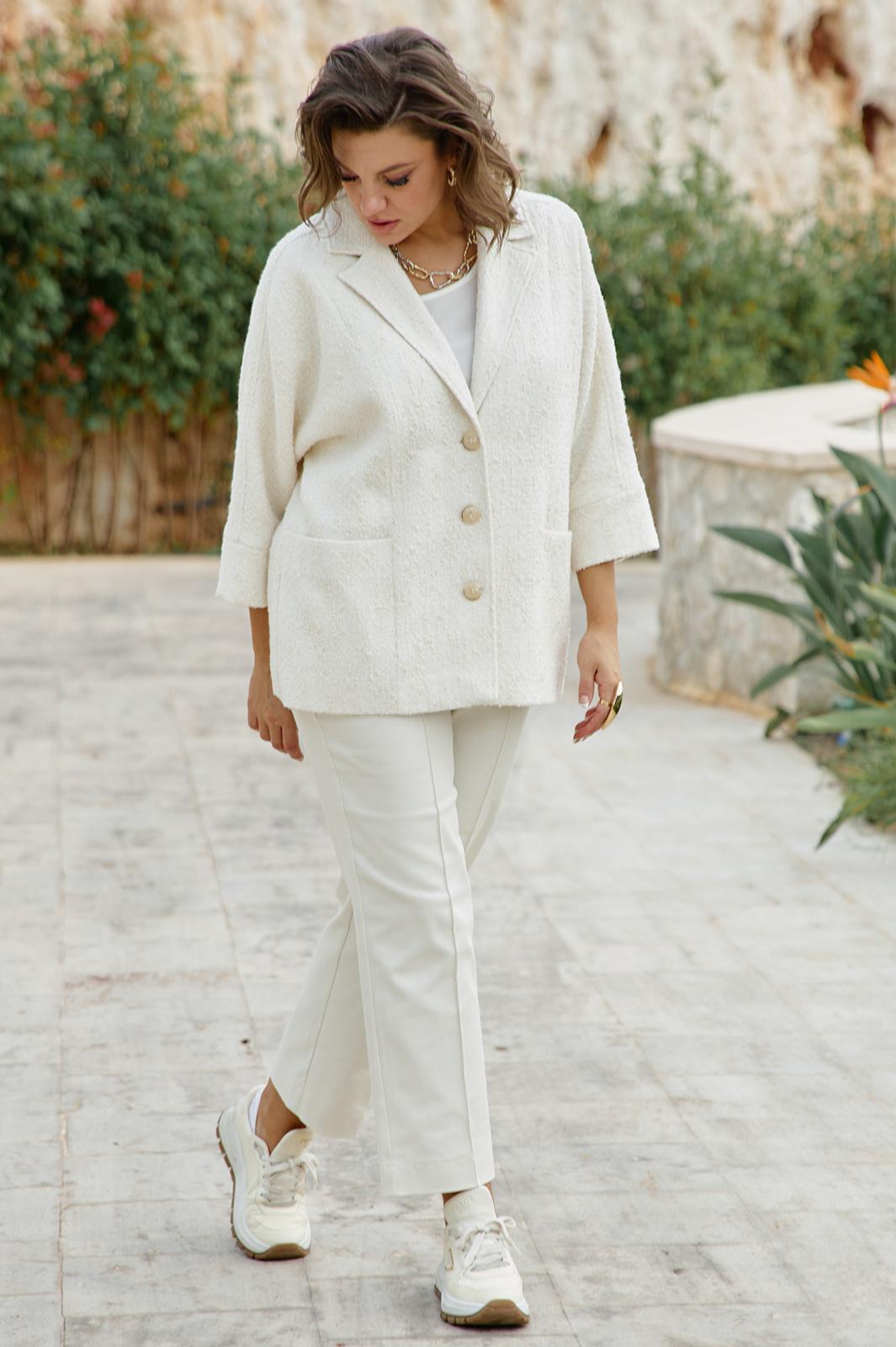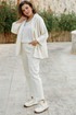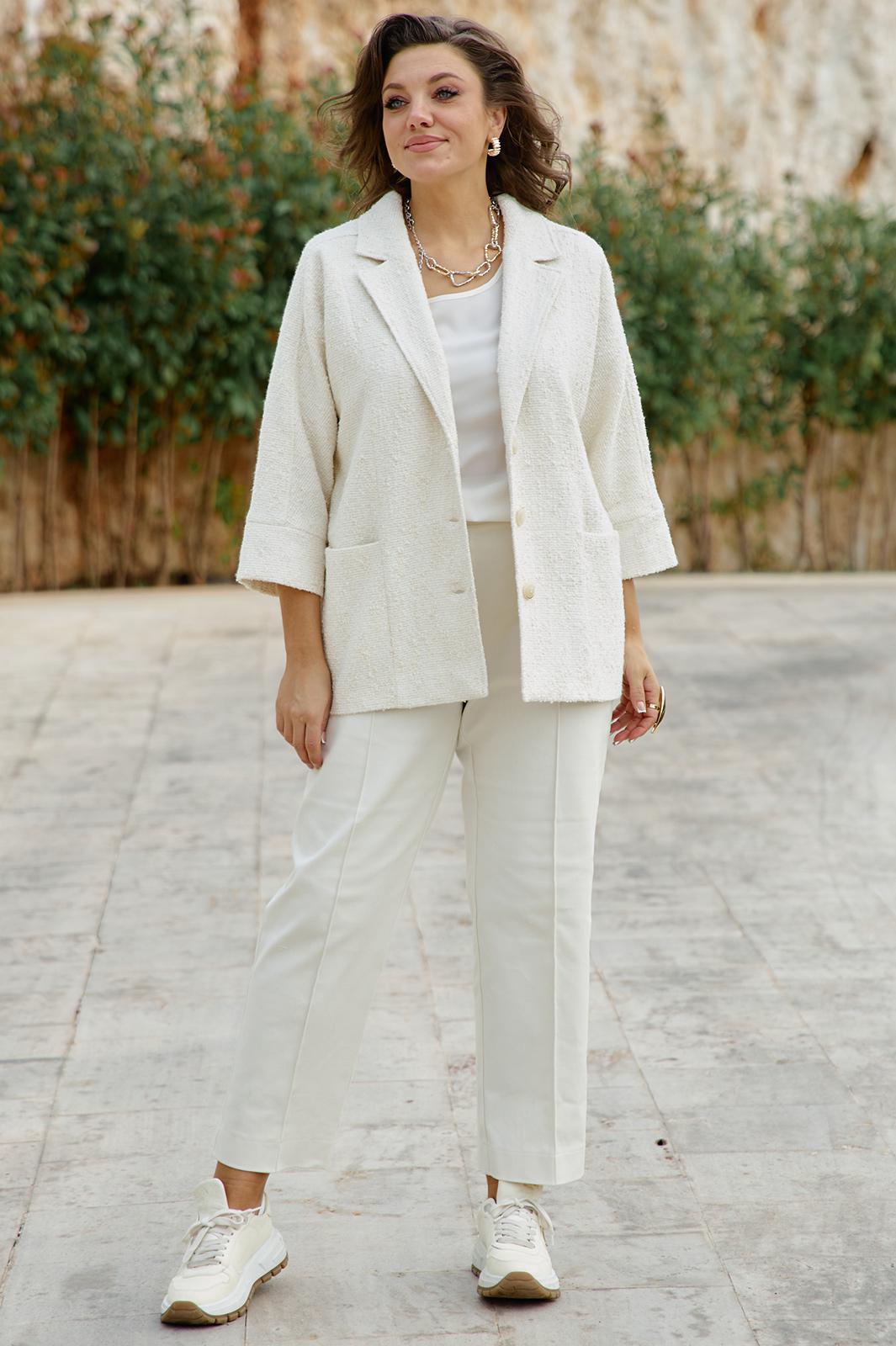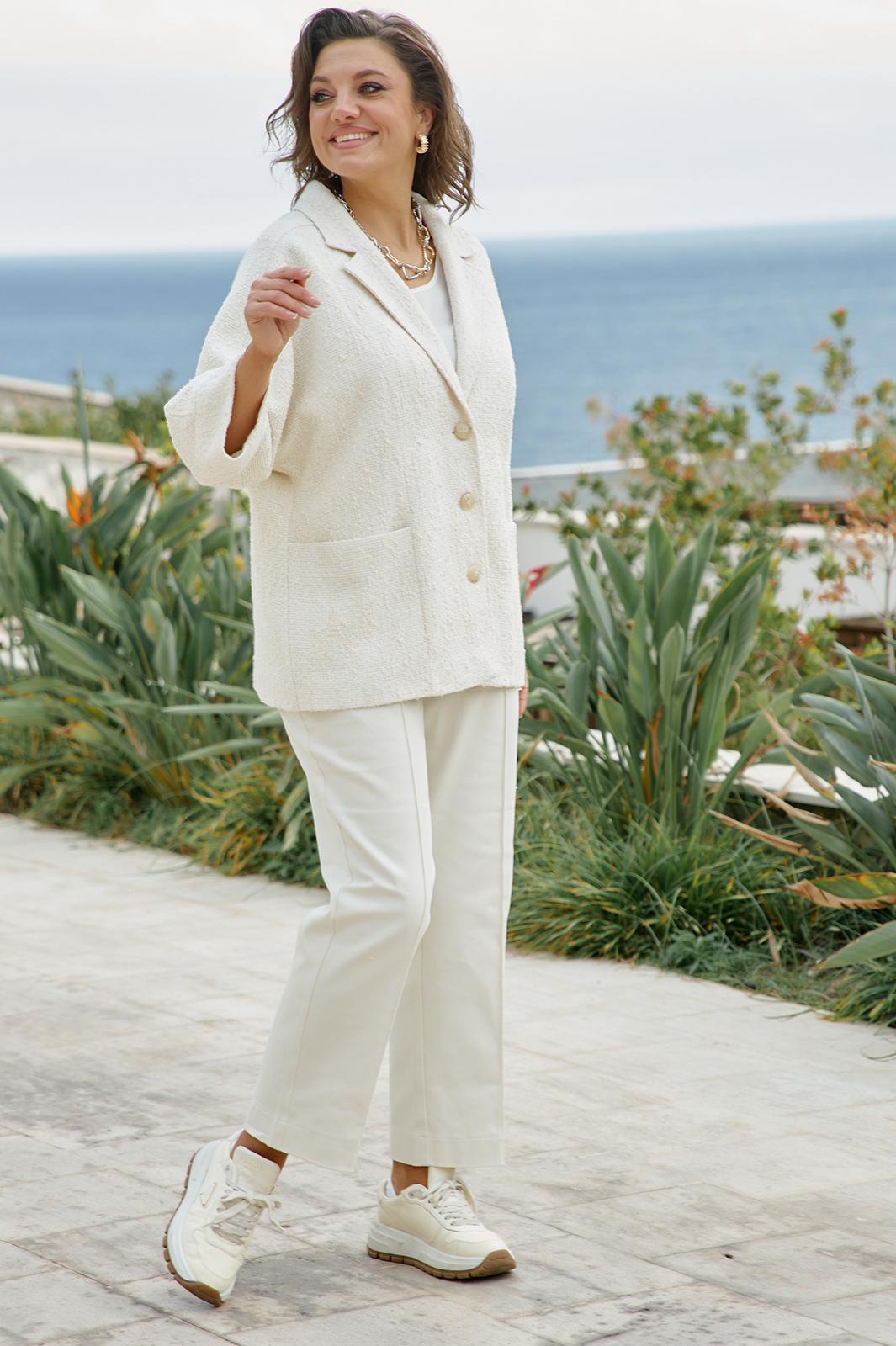 Брюки молочного оттенка — это про лёгкость решений. Они дарят ощущение чистоты и порядка, но без строгости. Это вещь для тех, кто ценит уютную элегантность и хочет выглядеть продуманно, но непринуждённо. Служат основой для минималистичных ансамблей и для более смелых цветовых сочетаний, универсальны — выглядят органично и летом, и в межсезонье. Брюки призаужены к низу, по переду застрочен кант, в брюках прорезные карманы по верхней части, застежка на молнию в гульфике и джинсовую пуговицу по центру пояса. Пояс притачной, на резинке по бокам. На задней части брюк фигурная кокетка и накладные карманы. Длина брюк 98 см.