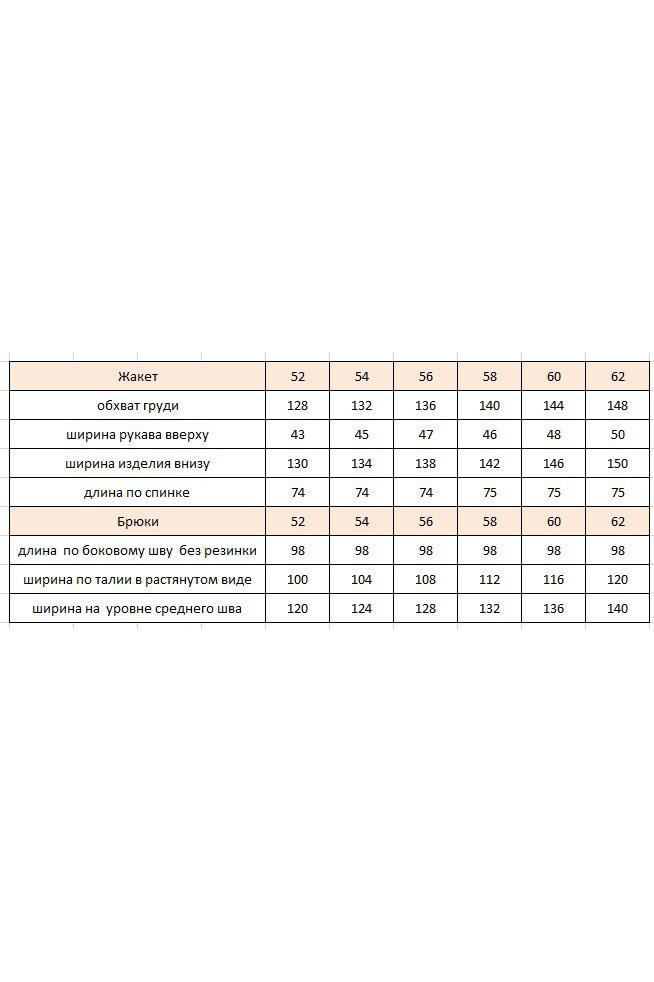 Комплект двух-предметный, состоящий и жакета и брюк-джинс. Жакет прямого силуэта, с двубортной, косой потайной застёжкой по борту, на 3 пришивные пуговицы. По правой полочке отрезная планка, по низу переда подрез с карманом и косой нагрудной выточкой. Линия плеча спущена, горловина V-образная. Спинка с кокеткой и вертикальными рельефами. Рукав втачной одношовный, длина 3/4 . Жакет на подкладке. Брюки-джинсы заужены к низу, по переду отрезная боковая фигурная деталь, с джинсовыми карманами по верхней части, застежка на молнию и джинсовую пуговицу. Притачной пояс на резинке по бокам. На задней части брюк фигурная кокетка, двойная отделочная строчка проходит по карманам, кокетке и гульфику, а также по боковой части переда брюк. Длина жакета 74 см (р 52-56), 75 см (р 58-62). Длина рукава 31,5 см (р 52-56), 30 см (р 58-62). Длина брюк по боковому шву 98 см.
