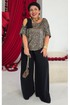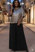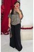 Это стильный и современный ансамбль, который состоит из блузы и брюк. Изысканный женский комплект идеален для торжественных мероприятий, он станет жемчужиной вашего гардероба. Брючный комплект можно дополнить минималистичными украшениями, которые подчеркнут утончённость, завершая этот элегантный, но уверенный образ. Сочетание классического чёрного цвета со сверкающими пайетками в одном образе превратит обыденное событие в настоящий феерический праздник! Блуза (состав: 100% полиэстер) выполнена из мерцающих пайеток богатого кофейного оттенка создаёт невероятно праздничный образ. Блуза свободного силуэта с асимметричной формой горловины: одно плечо открыто, расположен декоративный элемент чёрного цвета из отделочной ткани. Рукав цельнокроеный. Спинка без особенностей. Блуза на подкладке. Брюки (состав: 100% полиэстер) свободного кроя выполнены из плотной, матовой ткани чёрного цвета. Их широкий фасон и высокая посадка на талии создают элегантный и удлинённый силуэт, а также контрастируют с лёгким и воздушным верхом. Пояс в брюках притачной со вставкой эластичной тесьмы-резинки в бочках. По переду брюк от пояса застрачивается складка. В среднем шве брюк застёжка на потайную тесьму молнию и пуговицу в поясе. Длина блузы 56,5 см (р 52-56), 57,5 см (р 58-62), длина рукава 36,5 см (р 52-56), 37,5 см (р 58-62). Длина брюк 108 см.