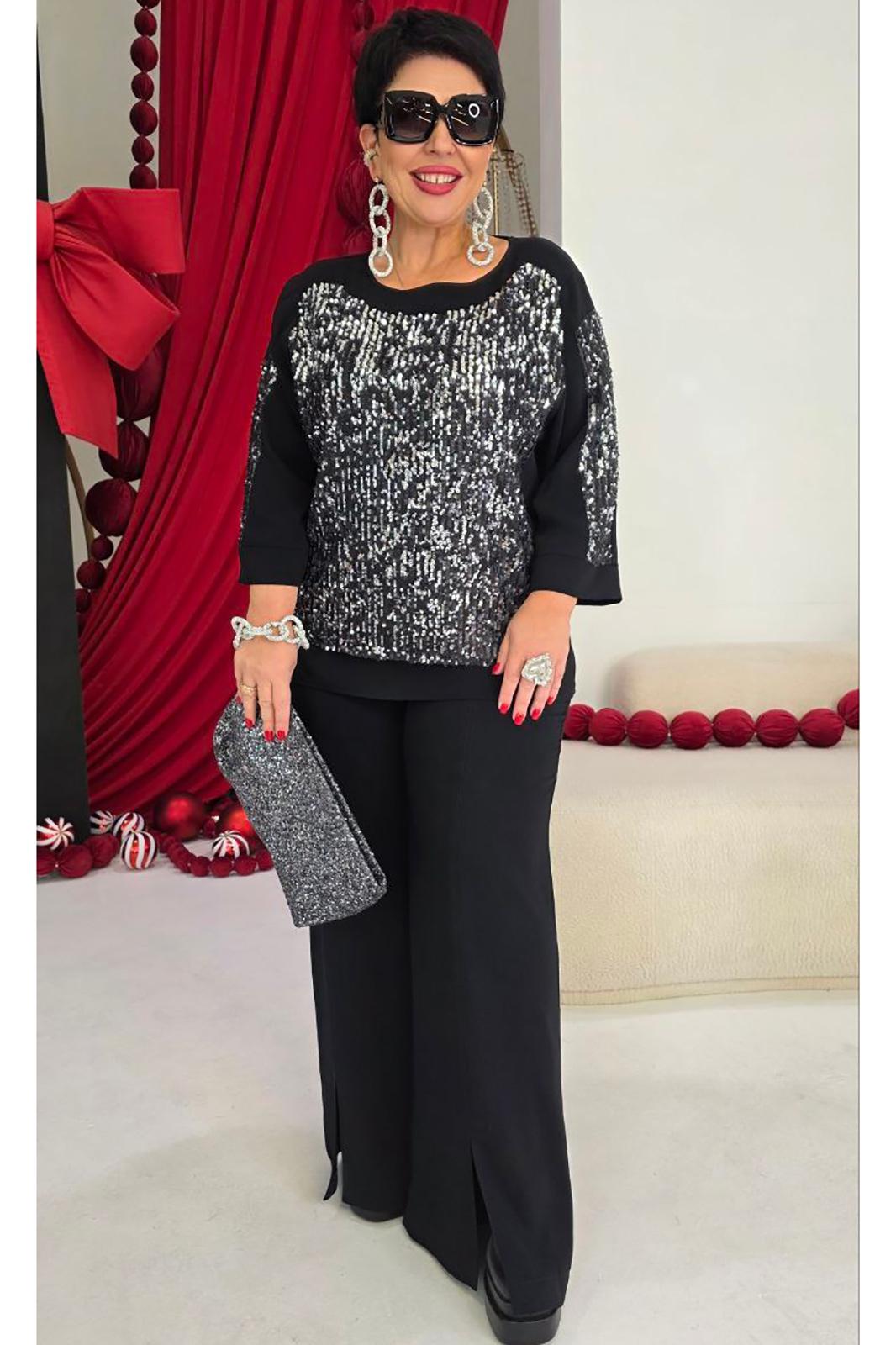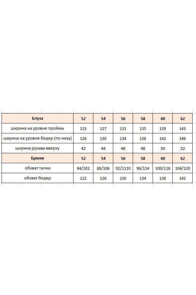 Комплект новогодний женский брючный, состоящий из блузы и брюк. Роскошный женский комплект, состоящий из полупрозрачной блузы с отделкой из ткани в пайетки и брюк - идеальный выбор для праздничного выхода! Блуза свободного силуэта, прямая к низу. Горловина в блузе округлой формы. С настрочной отделочной деталью по переду которая повторяет форму горловины. Спинка блузы без особенностей. Рукав в блузе трехшовный на центральную часть настрачивается отделочная ткань с пайетками по низу манжет. Низ прямой формы. Брюки прямого силуэта с притачным поясом с эластичной тесьмой резинкой, которая обеспечивает максимально удобную посадку на любой тип фигуры. В качестве дополнительного отделочного элемента брюк рельефная линия по переду в разутюжку с отделочными строчками. Длина блузы по спинке 64 см (р 52-56), 65 см (р 58-62). Длина рукава 44 см. Длина брюк по боковому шву 108 см.