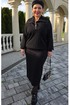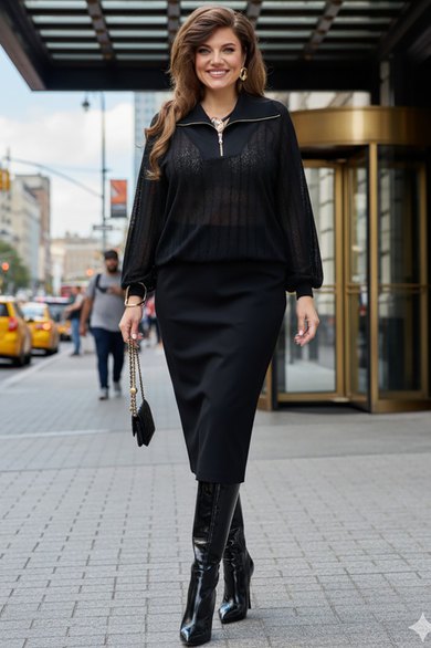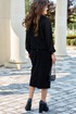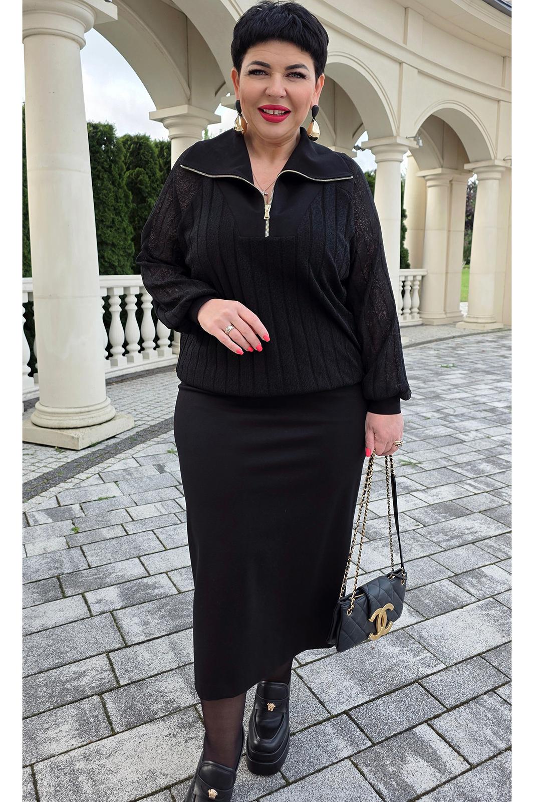Комплект женский, состоящий из джемпера и юбки. Джемпер черного цвета, из полупрозрачного материала, его фактура — эффект гофре — это складки, они играют со светом, то поглощая его, то отпуская, создавая живое, дышащее полотно. Джемпер свободного силуэта, с планкой из отделочного материала переходящей в отложной воротник с застёжкой на декоративную тесьму-молнию. Рукав в джемпере- реглан со сборкой на притачную манжету из отделочной ткани. По спинке джемпера фигурная кокетка из отделочной ткани. Низ со сборкой на эластичную тесьму-резинку. Юбка прямого силуэта, удлинённая, зауженная книзу. Пояс в юбке притачной со вставкой в бочках декоративной тесьмы-резинки для удобного прилегания. В среднем шве заднего полотнища юбки застёжка на декоративную молнию, и разрез от низа. Обращаем Ваше внимание, что фурнитура может незначительно отличаться от фото. Длина джемпера 67 см (р 50-54), 67,5 см (р 56-60), длина рукава 64 см (р 50-54), 65 см (р 56-60). Длина юбки 81 см.