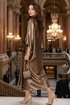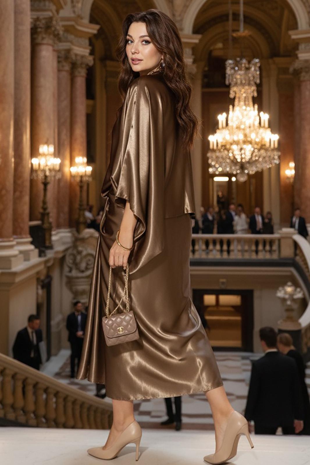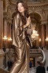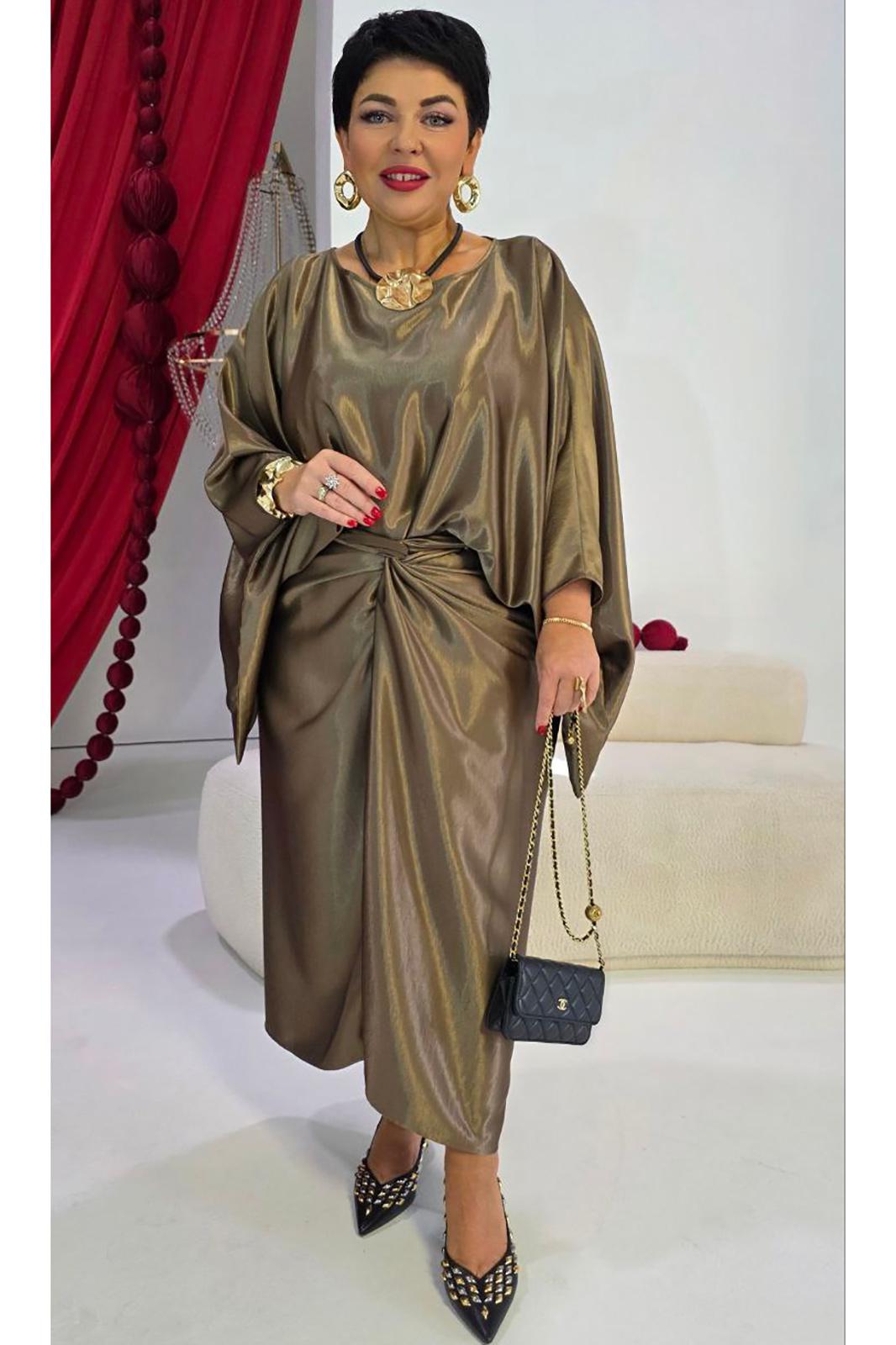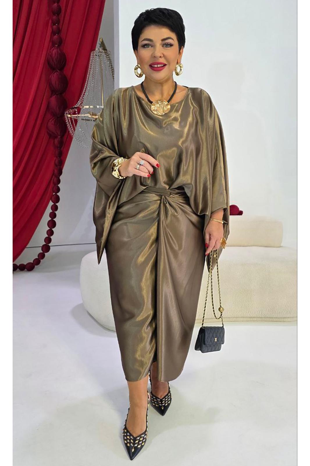 Общий образ — союз современных линий и благородного сияния. Контраст между строгой геометрией прямоугольной блузы и плавной свободой рукавов, и между богатым блеском ткани создаёт костюм, который подходит для торжественных мероприятий и вечерних встреч, сохраняя при этом эффект лёгкой воздушности и неповторимой эстетики. Это наряд, в котором каждый штрих продуман до мельчайших деталей, чтобы подчеркивать женственность и уверенность в любом световом окружении. Грациозный костюм встречает восходящую элегантность — блуза прямоугольного силуэта с рукавом кимоно и юбка миди, завязывающаяся впереди узлом, выполнены в стильном перламутрово-золотом оттенке. Блуза держится по линии плеча строго и уверенно, но её рукав-кимоно добавляет свободную плавность движению и нежную асимметрию. Головина по форме «лодочка», линия плеча спущенная. Фасон прямоугольной блузы подчеркивает минимализм, который обретает характер за счёт текстуры и сияния. Рукав-кимоно свободен в движении, но его концы и края тщательно обработаны, образуя спокойную, но выразительную линию по всей длине руки. Юбка миди завершает композицию: она облегает талию и плавно расходится к низу, не теряя движения. Завязка спереди образует аккуратный узел, который служит ярким акцентом и одновременно функциональной деталью, позволяющей регулировать посадку. Лаконичная посадка сочетается с мягким мерцанием ткани — переливы золотого и перламутра, будто собрались в узоре мелких светлячков, танцующих на поверхности материала. В оригинальности образу помогает отсутствие лишних деталей — всё в этом костюме рождает ощущение продуманной сдержанности. Длина по спинке блузы 54,5 см (р 50-54), 56,5 см (р 56-60). Длина рукава 54 см (р 50-54), 55 см (р 56-60). Длина юбки 98 см.