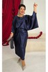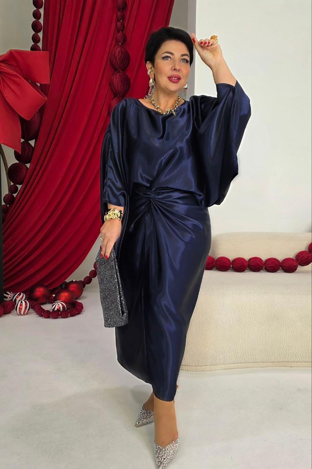 Общий образ — союз современных линий и благородного сияния. Контраст между строгой геометрией прямоугольной блузы и плавной свободой рукавов, и между богатым блеском ткани создаёт костюм, который подходит для торжественных мероприятий и вечерних встреч, сохраняя при этом эффект лёгкой воздушности и неповторимой эстетики. Это наряд, в котором каждый штрих продуман до мельчайших деталей, чтобы подчеркивать женственность и уверенность в любом световом окружении. Грациозный костюм встречает восходящую элегантность — блуза прямоугольного силуэта с рукавом кимоно и юбка миди, завязывающаяся впереди узлом, выполнены в стильном перламутровом оттенке. Блуза держится по линии плеча строго и уверенно, но её рукав-кимоно добавляет свободную плавность движению и нежную асимметрию. Головина по форме «лодочка», линия плеча спущенная. Фасон прямоугольной блузы подчеркивает минимализм, который обретает характер за счёт текстуры и сияния. Рукав-кимоно свободен в движении, но его концы и края тщательно обработаны, образуя спокойную, но выразительную линию по всей длине руки. Юбка миди завершает композицию: она облегает талию и плавно расходится к низу, не теряя движения. Завязка спереди образует аккуратный узел, который служит ярким акцентом и одновременно функциональной деталью, позволяющей регулировать посадку. Лаконичная посадка сочетается с мягким мерцанием ткани — переливы ткани, будто собрались в узоре мелких светлячков, танцующих на поверхности материала.В оригинальности образу помогает отсутствие лишних деталей — всё в этом костюме рождает ощущение продуманной сдержанности. Длина по спинке блузы 54,5 см (р 50-54), 56,5 см (р 56-60). Длина рукава 54 см (р 50-54), 55 см (р 56-60). Длина юбки 98 см.