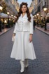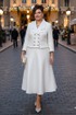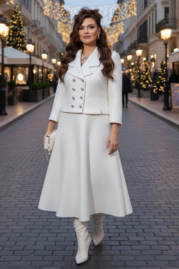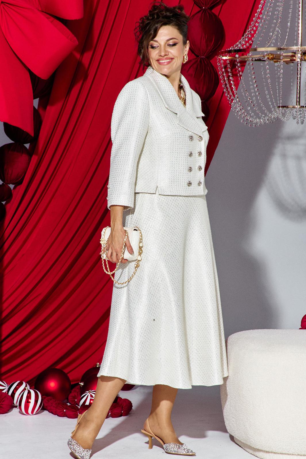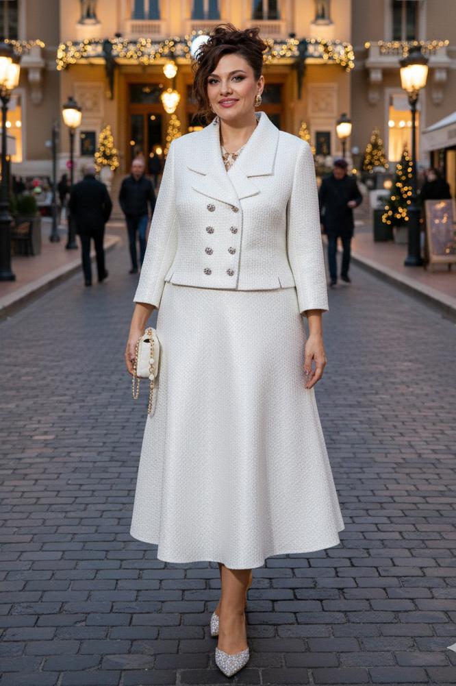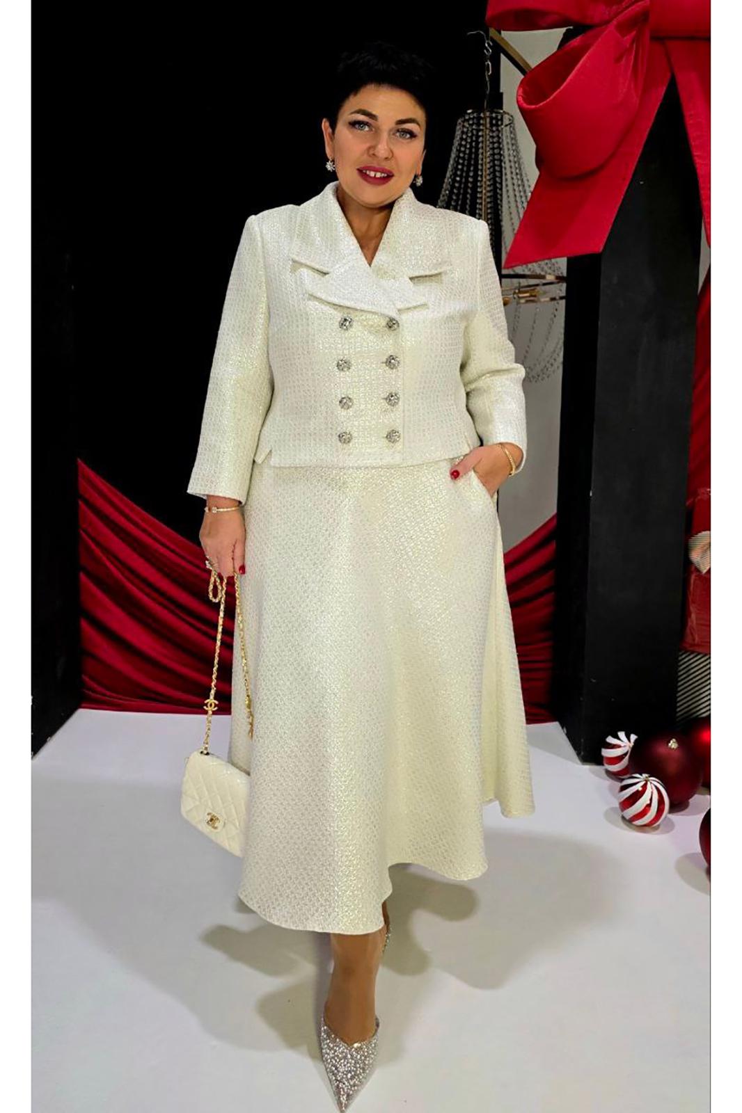 Изящный женский юбочный костюм из твида в стиле Шанель, состоящий из жакета и юбки, подчеркнет Ваш стиль, где элегантность и сдержанность сочетаются с яркой роскошью! Мерцающее на свету перламутровое напыление подчеркивает богатую фактуру твида, и создает неповторимое праздничное настроение! Рыхлая и подвижная структура позволяет твиду красиво обрисовывать фигуру, скрывая все несовершенства и подчеркивая достоинства. Костюм состоит из жакета и юбки. Жакет прилегающего силуэта, укороченный с двубортной застежкой на петли и пуговицы, воротник отложной с лацканами пиджачного типа с закругленными краями. В жакете отрезные бочки с разрезами по низу. Спинка без особенностей. Рукав втачной, одношовный, длинной 7/8. Жакет на подкладке. Юбка расклешенная с притачным поясом с резинкой по спинке, по переду наклонные карманы. В боковом шве юбки застёжка на потайную молнию и пуговицу в поясе. Юбка на подкладке. Обращаем Ваше внимание, что фурнитура может незначительно отличаться от фото. Длина жакета по спинке 49 см, длина рукава 51 см. Длина юбки 81 см.