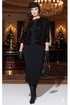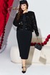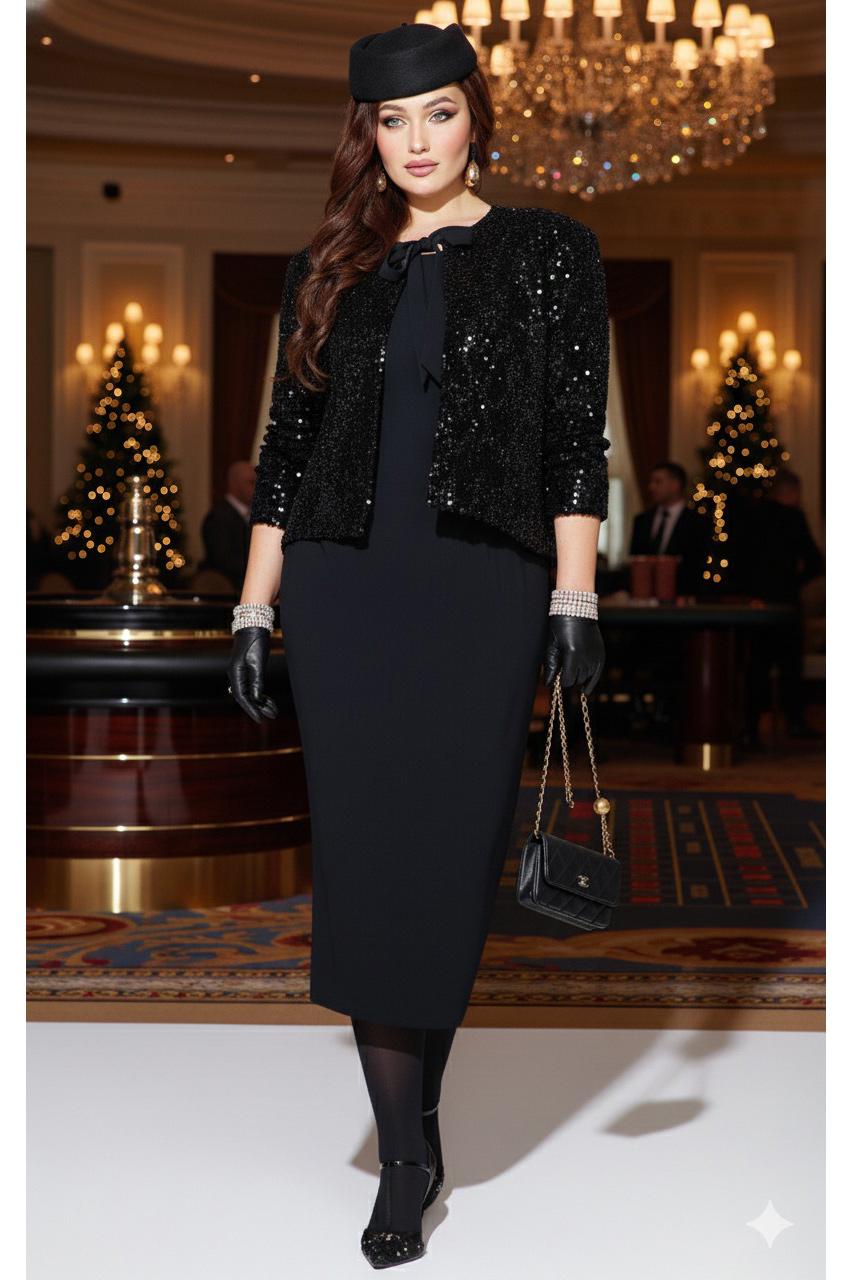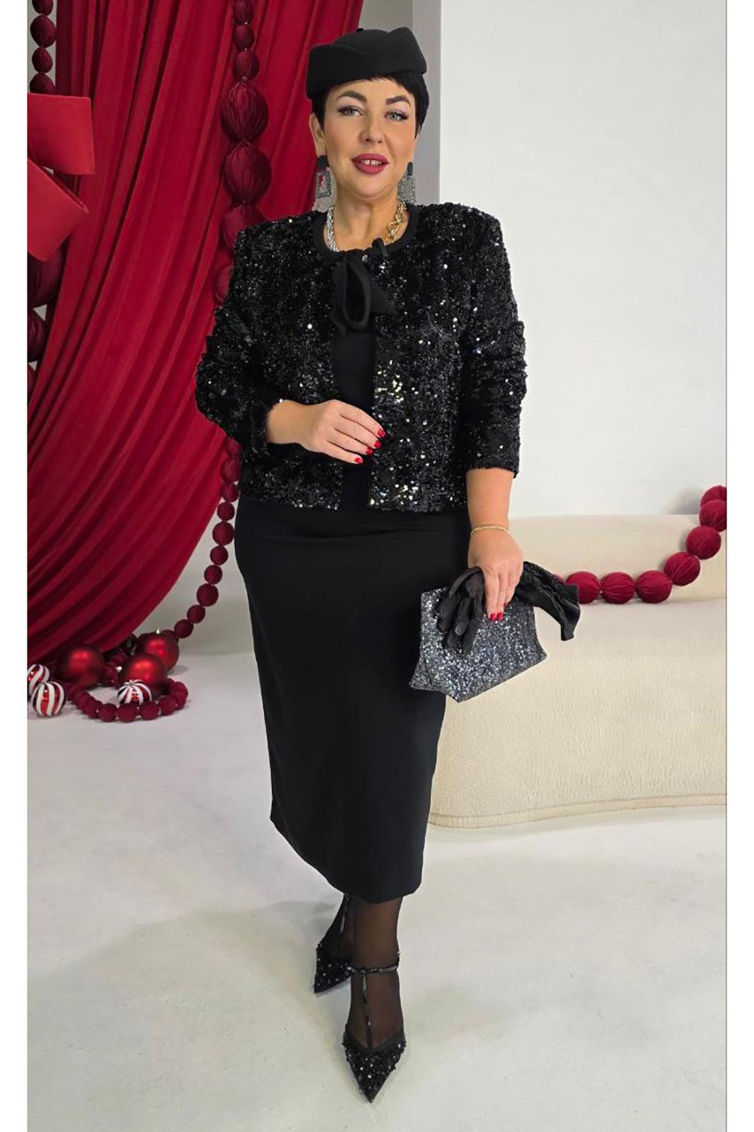 Если вы ищете идеальное сочетание стиля и комфорта, вот идеальный выбор - плательный комплект. Сочетание однотонного материала с фактурной пайеткой, придает образу интересную текстуру и современный вид, оставаясь при этом невероятно практичным. Глубокий черный цвет подчеркивает элегантность и универсальность модели, позволяя легко комбинировать ее с различными аксессуарами. Жакет (состав: 100% полиэстер, подкладка 100% полиэстер) укороченный, свободного силуэта, без застёжки, с акцентом на ровную линию плеч. Головина округлой формы с прилегающей стойкой из отделочной ткани переходящей в декоративные ленты завязывающиеся на бант. Спинка без особенностей. Рукав втачной, длинный. Жакет на подкладке. Платье (состав: 100% полиэстер) полуприлегающего силуэта, с округлой формой горловины. По переду платья нагрудные вытачки. Спинка в платье со средним швом переходящим в разрез от низа, и с талиевыми вытачками. Линия плеча в платье слегка спущенная. Длина жакета по спинке 60 см, длина рукава 60 см. Длина платья 122 см, ширина плеча 13 см (р 50-54), 14 см (р 56-60).