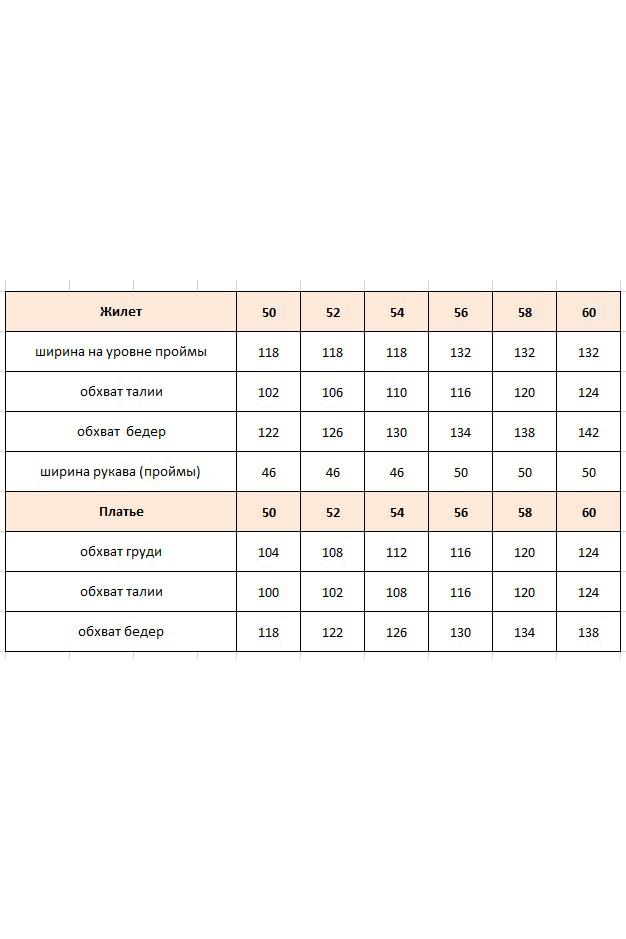 Безумно красивый и стильный плательный комплект в элегантном сочетании жилета в стиле «шанель» и однотонного платья-комбинации. Невероятно элегантный комплект станет отличным вариантом для торжественных мероприятий. Комплект женский двух предметный, состоящий из жилета и платья. Жилет удлинённый, прилегающего силуэта, с фигурной линией борта и застёжкой на декоративную кнопку по краю борта. По переду жилета талиевые вытачки, горловина завышенная — с цельнокроеной стойкой. Линия плеча в жилете увеличенная. Спинка со средним швом переходящим в отлетную шлицу от низа и талиевые вытачки. Основа ткани — роскошный твид, в который искусно вплетена тонкая люрексовая нить, придающая полотну деликатное мерцание и благородный блеск. Жилет на подкладке. Платье силуэта «рыбка» длины миди на регулируемых бретелях с драпировкой горловины – «качели». По спинке платья талиевые вытачки. Длина жилета по спинке 67 см, длина плеча 24,5 см (р 50-54), 26 см (р 56-60). Длина юбки 122 см (р 50-54), 125 см (р 56-60).