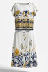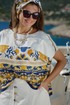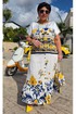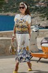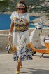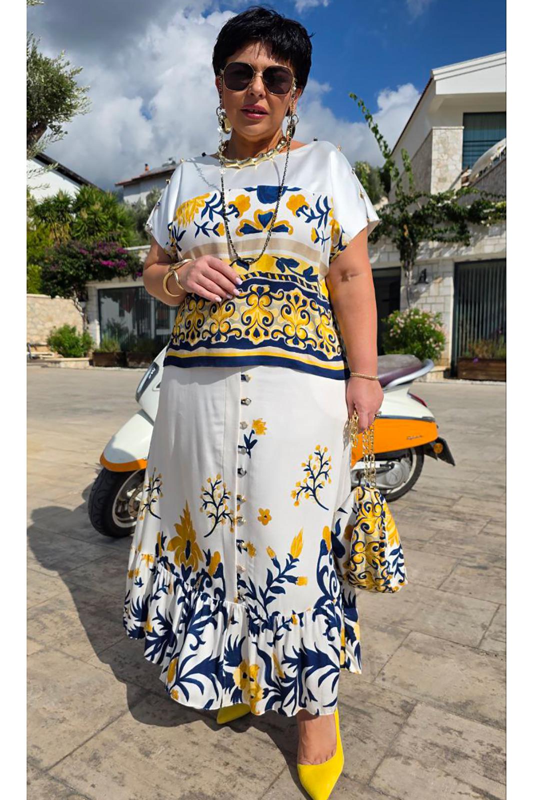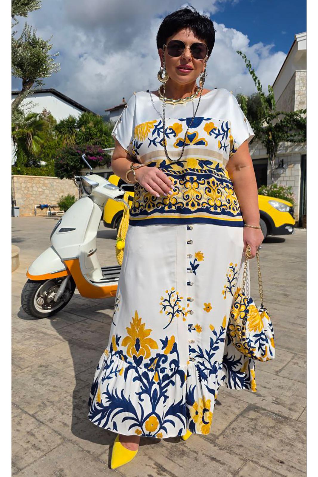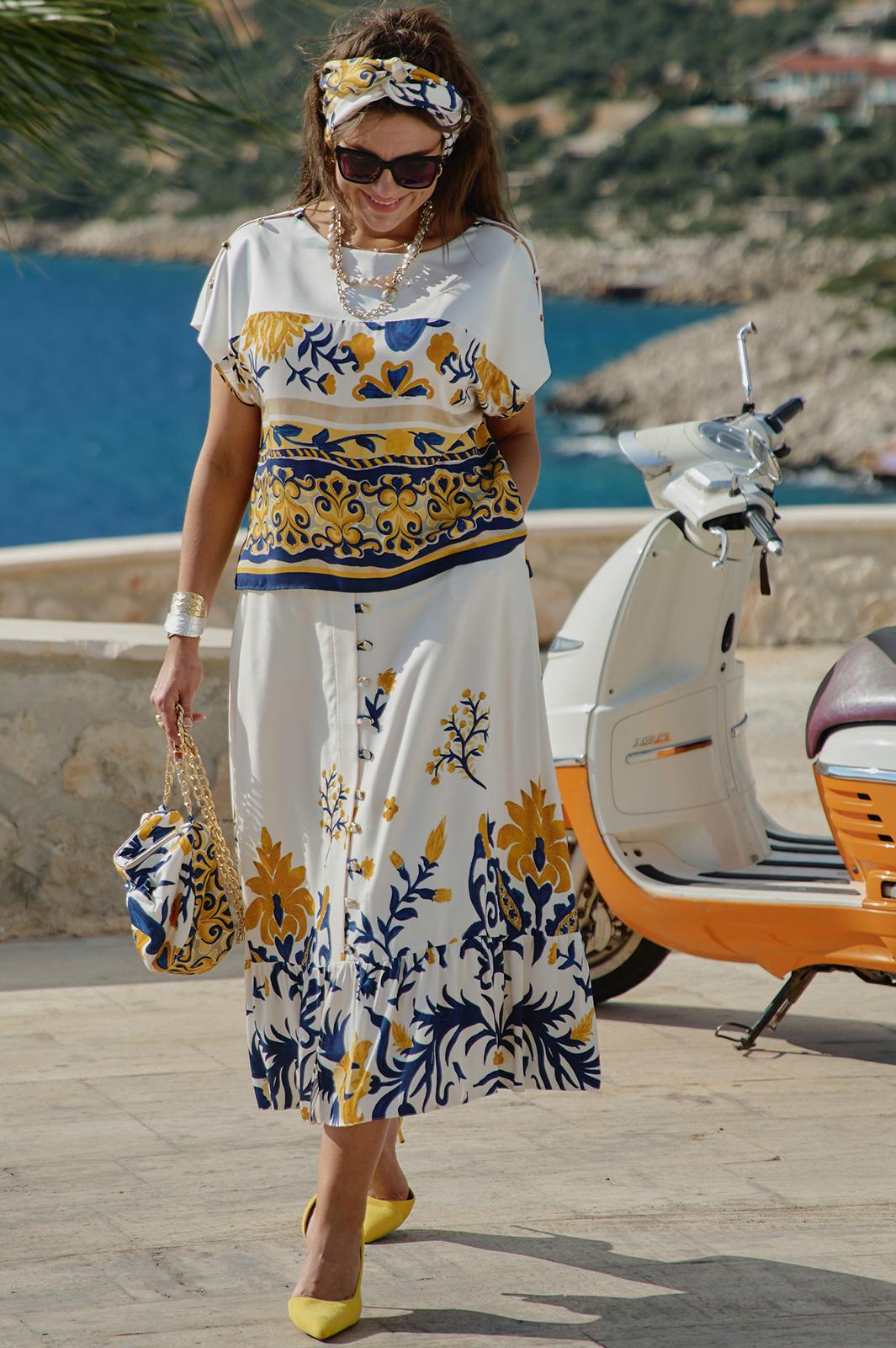 Костюм женский состоящий из блузы и юбки. Этот костюм — не просто одежда, а перенесённый на ткань кусочек итальянского лета. Яркий цветочный принт на светлой основе напоминает о залитых солнцем тосканских холмах, о внутренних двориках с терракотовыми горшками, о рынках, где горами лежат спелые овощи и фрукты. Это гимн средиземноморской радости жизни, воплощённый в блузе и юбке. Принт — это не случайный узор, а тщательно составленная композиция, вдохновлённая итальянской флорой и искусством. Блуза сконструирована так, чтобы быть одновременно удобной и изысканной. Крой — свободный, горловина округлой форм, линия плеча спущенная. По плечу декоративная застёжка в виде «навесных» петель и пуговиц, которая придаёт блузе лёгкости. По переду и спинке отрезная кокетка из однотона. В боковых швах от низа разрезы. Юбка — это продолжение блузы. Форма — трапециевидная, расширяющаяся от талии. Объём достаточный для свободы движения, но не переходящий в пышность. Длина «миди» создаёт более романтичный образ. Пояс в юбке притачной, на обтачке, по переду имитация застёжки на «навесные» петли и пуговицы. По низу юбки притачной волан со сборкой от подреза. Этот костюм для женщины, которая: любит жизнь — во всей её полноте и яркости. Ценит искусство — понимает, что одежда может быть произведением искусства. Обладает темпераментом — не боится быть заметной, но делает это со вкусом.
