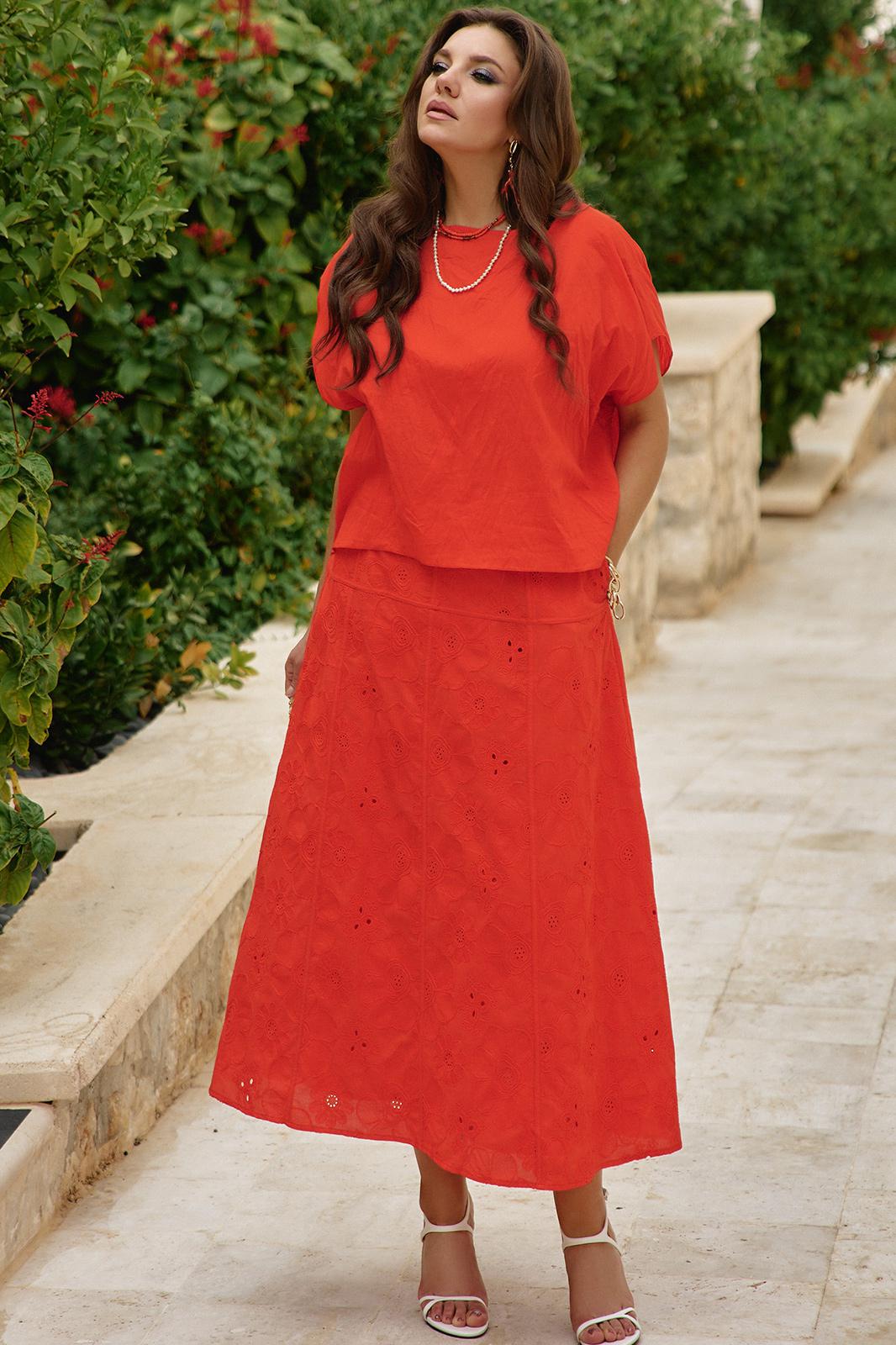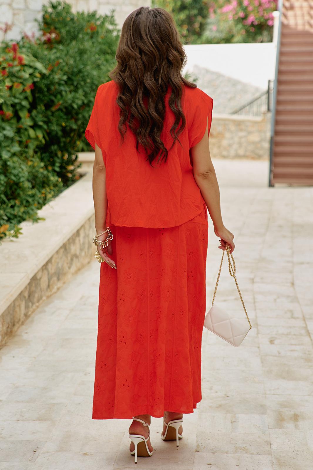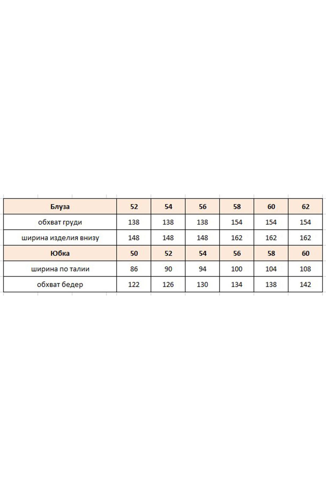 Костюм женский, состоящий из блузы и юбки умело сочетает в себе элегантность и яркость, создавая незабываемый образ. Летний костюм из асимметричной блузы с мятым эффектом и юбки с вышивкой ришелье — это больше, чем просто одежда. Это заявление о стиле, искусство сочетания противоположностей и гимн летней легкости. Он подходит для любой ситуации, где женщина хочет чувствовать себя уверенно, элегантно и современно — от делового офиса до романтического свидания. Костюм, в котором каждая деталь рассказывает историю, а каждое движение становится частью перформанса. Блуза свободного силуэта, бросает вызов традиционной симметрии, предлагая игру форм. Горловины в блузе с смещённым ассиметричным вырезом. По переду диагональный подрез. Рукава в блузе цельнокроеные, с углублённой проймой, ассиметричные по длине. Однотонный материал блузы с преднамеренной небрежностью: искусственная помятость — не хаос, а тщательно продуманный беспорядок, тактильная глубина — ткань хочется трогать, ощущать ее неровности. Юбка длины «миди», трапециевидного силуэта. Классическая форма, переосмысленная: юбка расширяется от бедер — создавая тем самым летящий, расклешенный низ, не сковывает движения, а следует за телом. Трапециевидный силуэт юбки создаёт баланс объемов — уравновешивает асимметричный верх, удлиняя пропорции — тем самым визуально стройнит фигуру. Юбка выполнена из тонкой, деликатной ткани с удивительным рисунком ришелье. Каждая деталь этого узора проработана с большой тщательностью, его ажурные линии и изящные формы искусно вписываются в общую концепцию, добавляя образу нотку романтики и утонченности. В качестве дополнительной декоративной отделки по переднему и заднему полотнищу юбки идут отделочные канты. В боковых швах юбки карманы. В среднем шве кокетки по спинке застёжка на потайную молнию. Юбка на подкладке. Длина блузы 60 см (р 50-54), 61,5 см (р 56-60). Длина юбки 91 см.