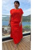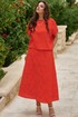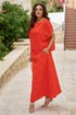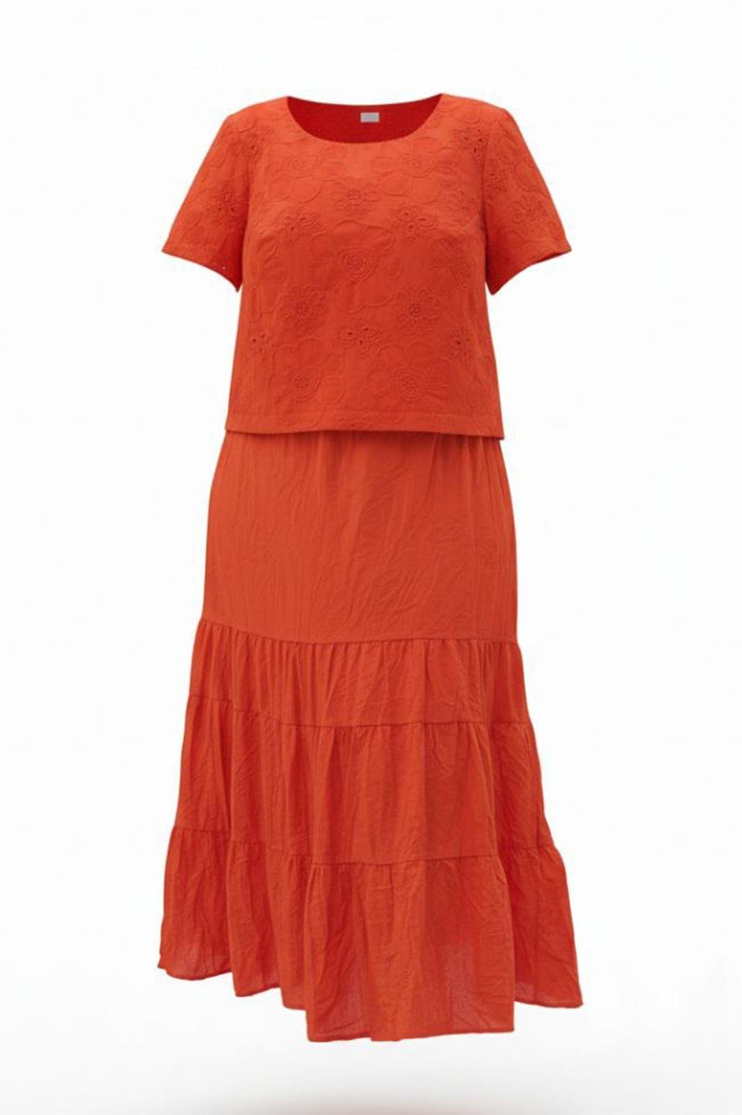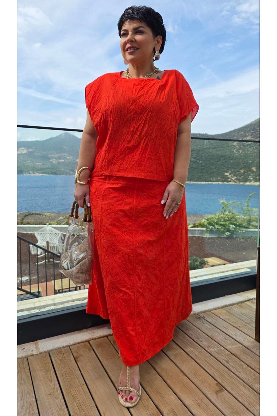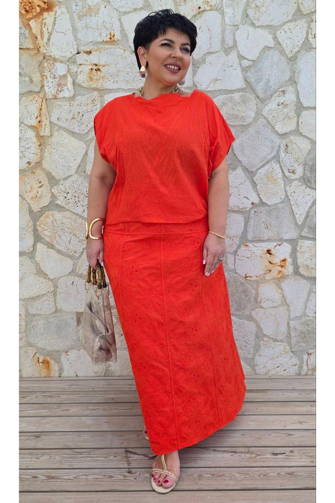 Костюм женский, состоящий из блузы и юбки умело сочетает в себе элегантность и яркость, создавая незабываемый образ. Летний костюм из асимметричной блузы с мятым эффектом и юбки с вышивкой ришелье — это больше, чем просто одежда. Это заявление о стиле, искусство сочетания противоположностей и гимн летней легкости. Он подходит для любой ситуации, где женщина хочет чувствовать себя уверенно, элегантно и современно — от делового офиса до романтического свидания. Костюм, в котором каждая деталь рассказывает историю, а каждое движение становится частью перформанса. Блуза свободного силуэта, бросает вызов традиционной симметрии, предлагая игру форм. Горловины в блузе с смещённым ассиметричным вырезом. По переду диагональный подрез. Рукава в блузе цельнокроеные, с углублённой проймой, ассиметричные по длине. Однотонный материал блузы с преднамеренной небрежностью: искусственная помятость — не хаос, а тщательно продуманный беспорядок, тактильная глубина — ткань хочется трогать, ощущать ее неровности. Юбка длины «миди», трапециевидного силуэта. Классическая форма, переосмысленная: юбка расширяется от бедер — создавая тем самым летящий, расклешенный низ, не сковывает движения, а следует за телом. Трапециевидный силуэт юбки создаёт баланс объемов — уравновешивает асимметричный верх, удлиняя пропорции — тем самым визуально стройнит фигуру. Юбка выполнена из тонкой, деликатной ткани с удивительным рисунком ришелье. Каждая деталь этого узора проработана с большой тщательностью, его ажурные линии и изящные формы искусно вписываются в общую концепцию, добавляя образу нотку романтики и утонченности. В качестве дополнительной декоративной отделки по переднему и заднему полотнищу юбки идут отделочные канты. В боковых швах юбки карманы. В среднем шве кокетки по спинке застёжка на потайную молнию. Юбка на подкладке. Длина блузы 60 см (р 50-54), 61,5 см (р 56-60). Длина юбки 91 см.