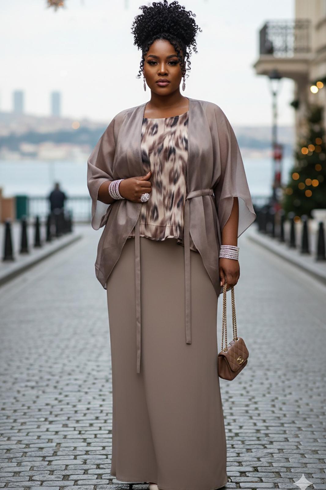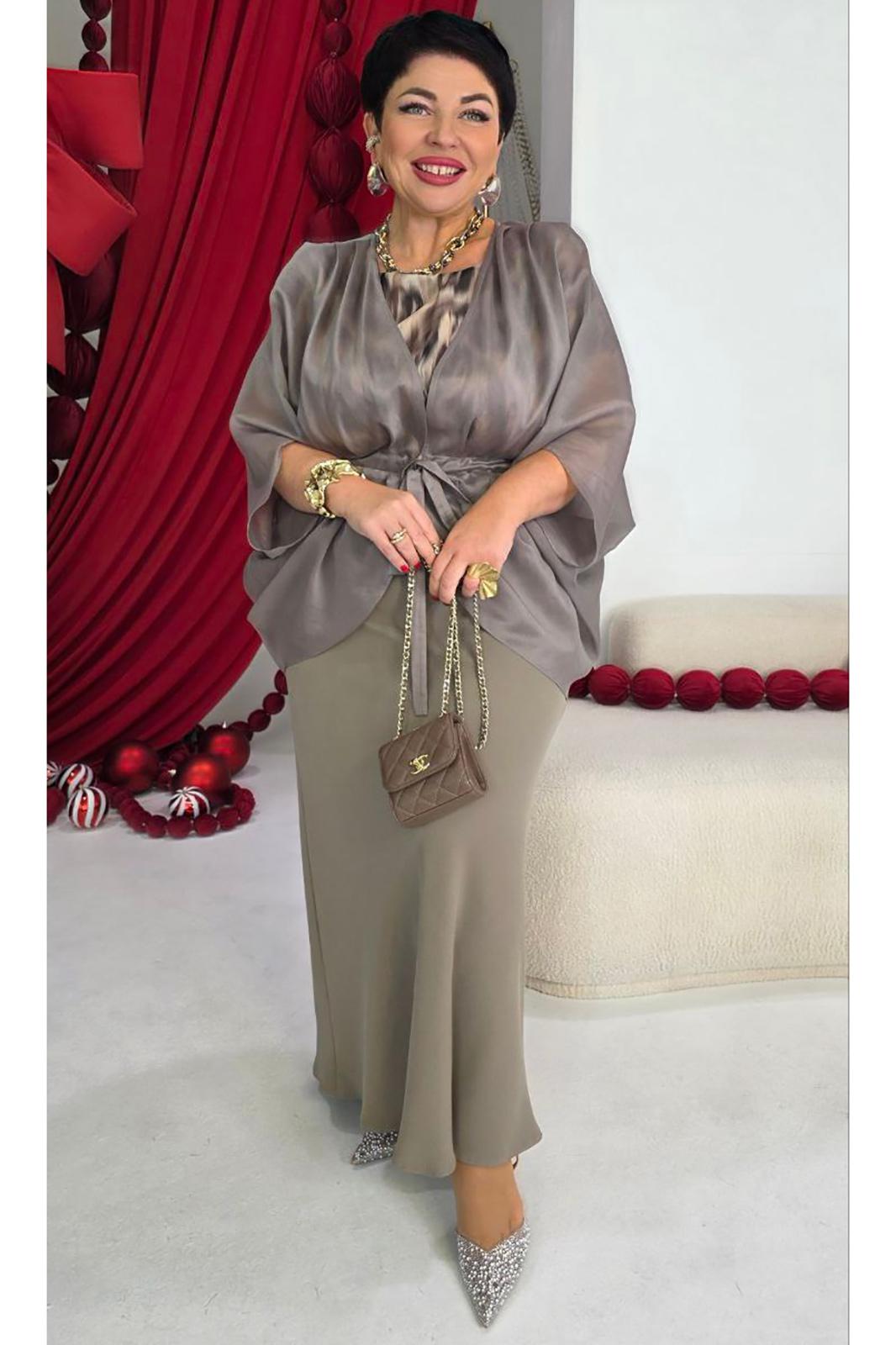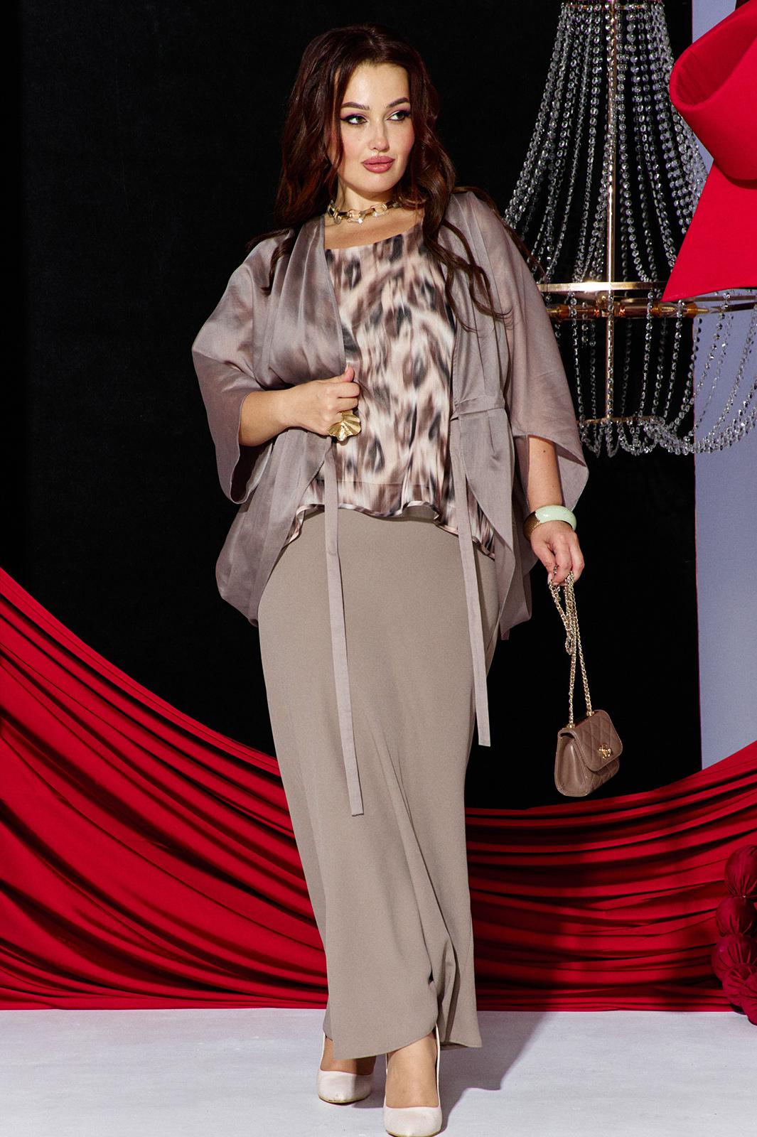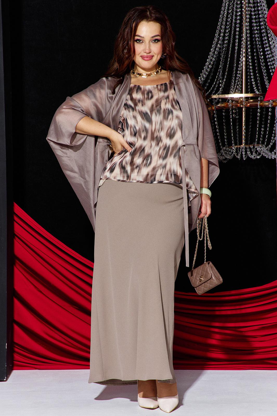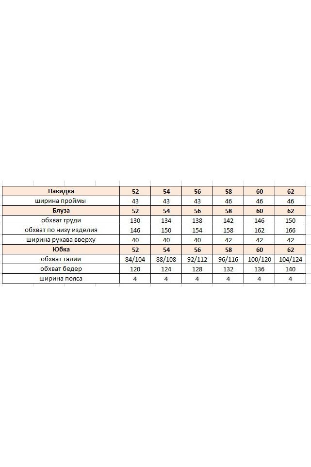 Очаровательный юбочный комплект, состоящий из вуалевой накидки шифонового топа и удлинённой юбки по косой. Максимально романтичный образ для праздничного выхода. Мягкая свободная овального силуэта-накидка под пояс прекрасно подчеркнёт все ваши достоинства и скроет все недостатки. По переду накидки и плечу лёгкие складки. Спинка по низу с удлинением и средним швом. Струящийся шифоновый топ с оригинальным принтом на подкладке и округлой горловиной. Юбка удлинённая с небольшим расклешением по косой. Юбка на застёжку молния и притачной пояс с эластичной тесьмой на задней части, для максимальной посадки на различные типы фигур. Длина спинки накидки 71 см, длина рукава 60 см (р 52-56), 61 см (р 58-62). Длина блузы 70 см (р 52-56), 71 см (р 58-62), ширина плеча 24 см (р 52-56), 26 см (р 58-62). Длина юбки 98 см.