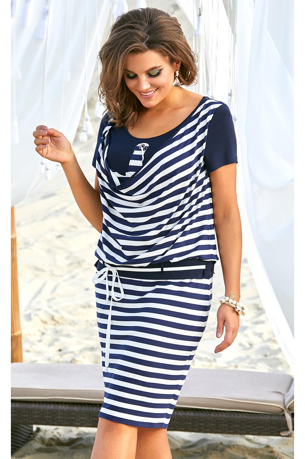 Классное яркое платье для летних денёчков! Белая полоска смотрится смело и скрывает недостатки. Фурнитура и декор подобраны в морской тематике и создают Ваше настроение! Платье выполнено из эластичной ткани, прямого силуэта с подрезом по заниженной линии талии. Лиф выполнен двухслойным: на нижней детали расположены нагрудные вытачки, аппликация с декоративными элементами, верхняя деталь - ассиметричная с перекрутом у плеча, в линию подреза вставлен декоративный пояс и шнур с наконечниками. Верхняя часть спинки двухслойная, в линию подреза вставлен пояс. Рукав втачной. Длина рукава 17 см (р-р 48-54), 18 см (р-р 54-62). Длина платья 105 см (р-р 48-54), 107 см (р-р 56-58), 109 см (р-р 60-62).