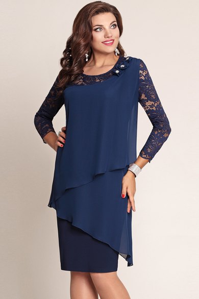 Платье женское, состоящее из двух частей. Нижняя часть полуприлегающего силуэта. Верхняя часть представляет собой накидку прямого силуэта из шифона. Накидка двухслойная с асимметричным низом. В области горловины переда асимметричная кокетка из кружева. В области левого плеча по переду и спинке заложены односторонние складки. Рукав втачной одношовный из кружева. Длина 50 см. Горловина переда декорирована фантазийными цветами из шифона. Длина платья от 104 до 110 см в зависимости от размера