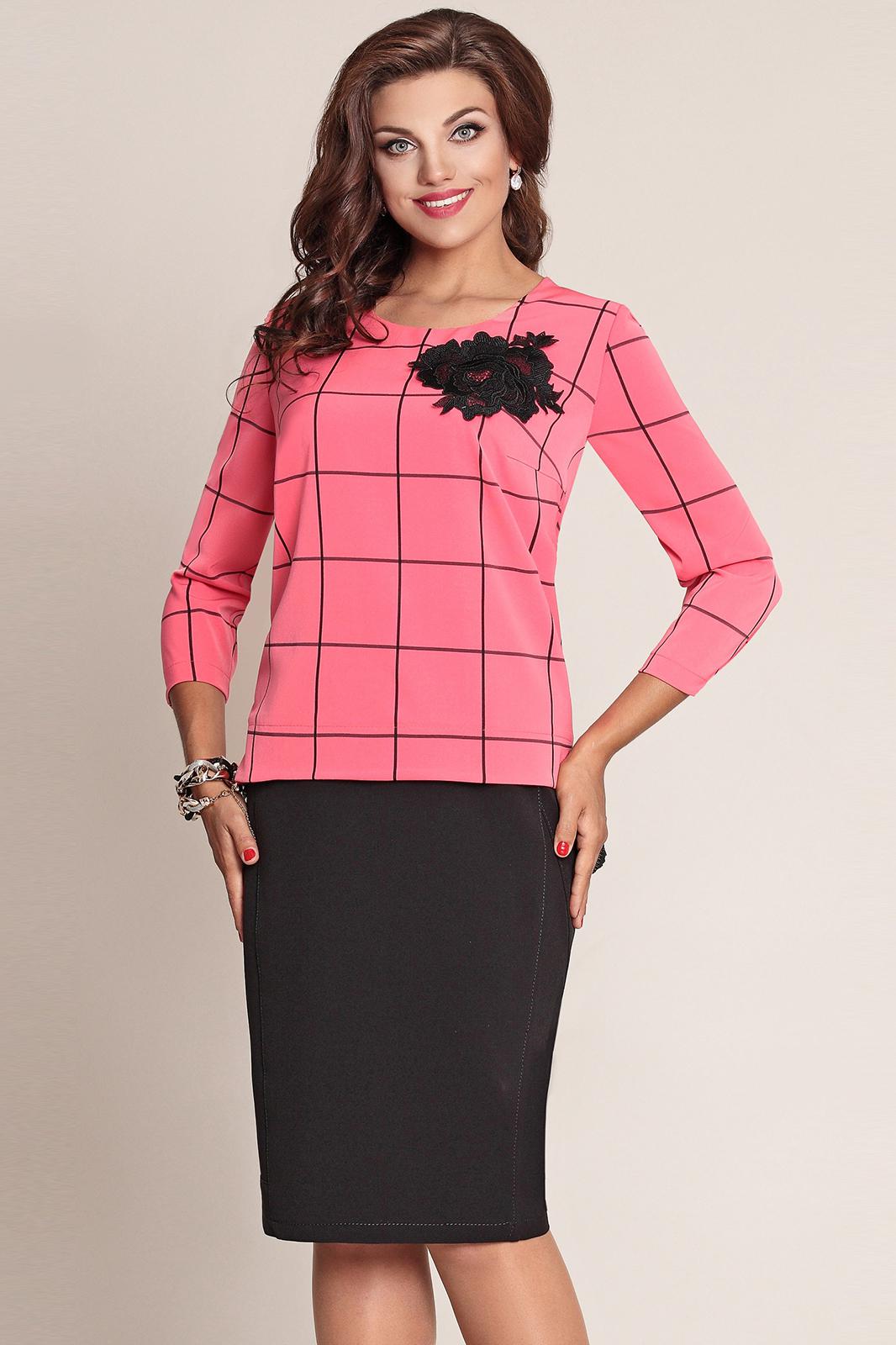 Платье женское состоящее из двух частей. Нижняя часть представляет собой юбку с фигурными рельефами по переду и вертикальными рельефами и средним швом со шлицей по спинке. Верхняя часть представляет собой блузон прямого силуэта с горловиной круглой формы, без застежки. Низ блузона удлинен по спинке. В среднем шве спинки - встречная складка. Рукав втачной одношовный Длина рукава 50 см. По переду в области горловины настрочен цветок из кружева. По спинке декором служит тесьма с кружевом, настроченная вдоль среднего шва и украшенная декоративными пуговичками.Блузон и юбка выполнены из разных тканей. Длина платья от 104 до 110 см в зависимости от размера