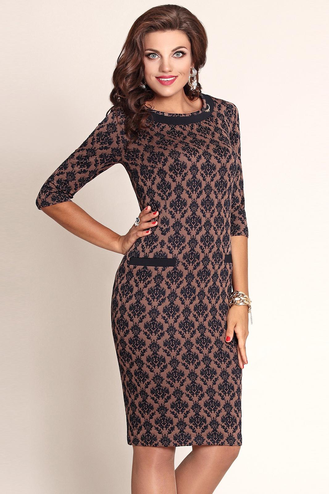Отличное платье с модным принтом для любого случая жизни! Выгодная цветовая гамма подойдёт для любого типажа и возраста. Полуприталенный силуэт отлично подчеркнет достоинства фигуры. Вырез- лодочка с темной в тон основе ткани вставкой, украшенной декоративным элементом. Рукав втачной ¾. Ткань - уютный мягкий трикотаж.