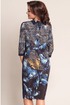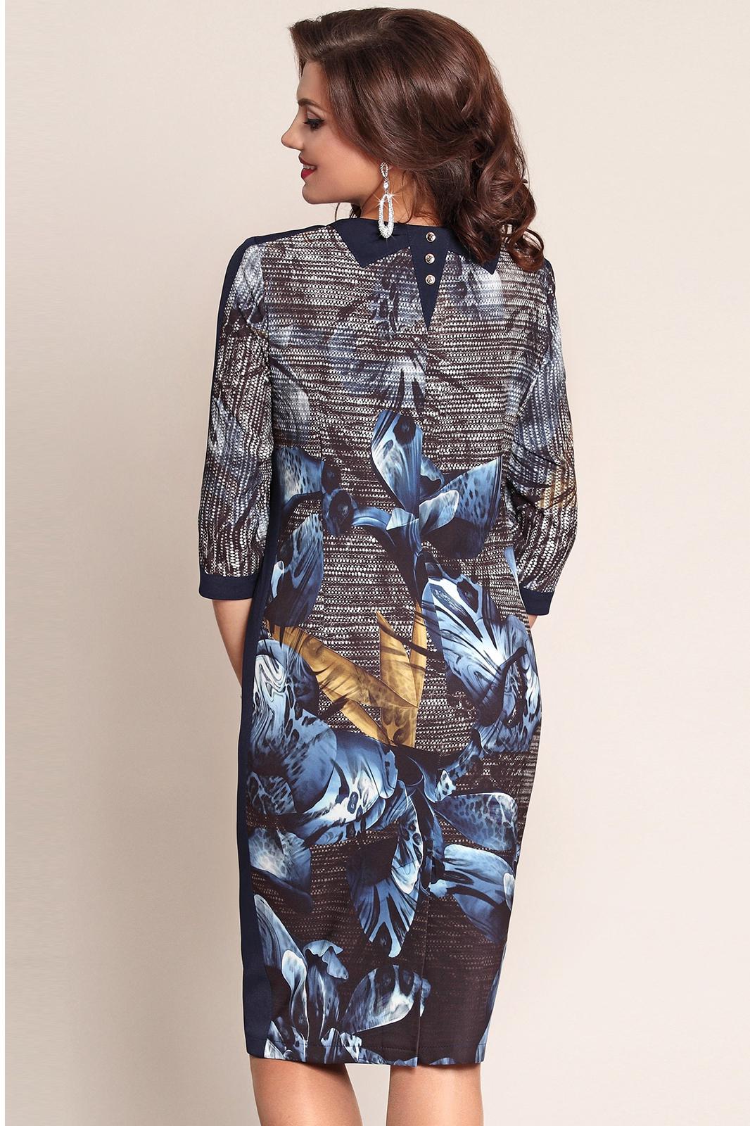 Платье женское прилегающего силуэта. По переду подрезы, идущие от центра груди к бочкам. В подрезах расположены внутренние карманы. Горловина круглой формы. В верхней части платья кокетка фигурной формы. Спинка имеет бочки, средний шов со шлицей и талиевые вытачки. Плечевые кокетки, V-образная вставка у горловины и бант, вставленный в эти детали, образуют отделочный декоративный элемент. V-образная вставка декорирована пуговичками под золото. Рукав втачной с вертикальными параллельными подрезами по центру и фигурным низом. Длина платья от 104 до 110 см в зависимости от размера