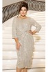 Платье длины миди прилегающего силуэта с круглой горловиной и втачными рукавами длиной 3/4. По переду платье украшает драпировка в виде декоративного узла. На юбке - имитация запаха.