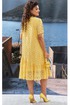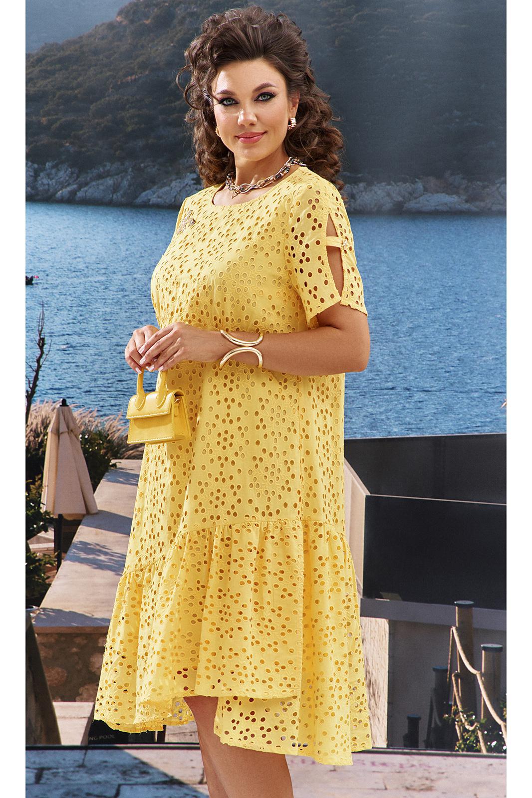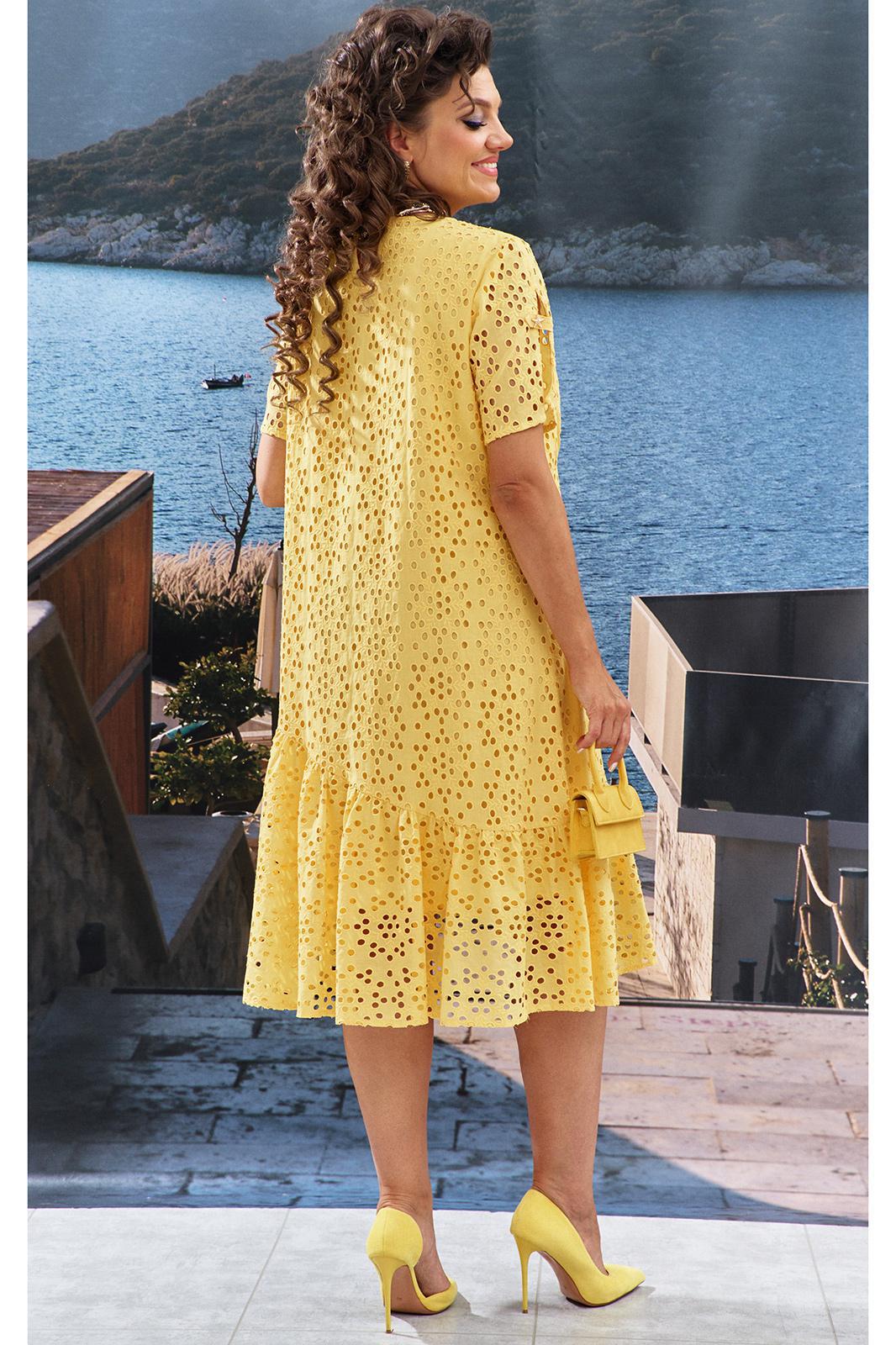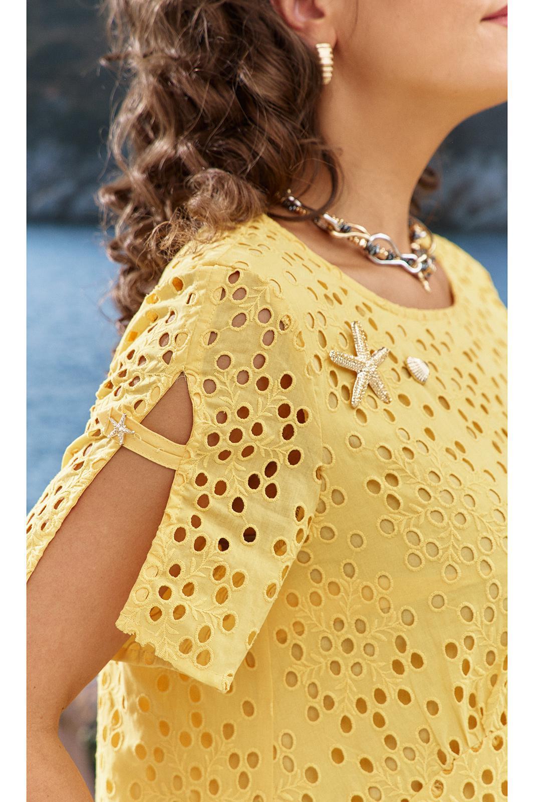 Желтый цвет этого платья — это не просто оттенок, это настоящее настроение. Оно не оставит равнодушными ни вас самих, ни окружающих, призывая ценить каждый момент лета. Вышивка ришелье на хлопке придаст вашему образу игривости и легкости, создает кокетливый и романтичный образ! Платье А-силуэта с ассиметричным подрезом по низу и сборкой волана от подреза. Горловина в платье округлой формы, по переду платья, ниже уровня груди, фигурные подрезы со сборкой. По горловине спинки платья не глубокий V-образный вырез с декоративным элементом в виде петли фиксирующейся декоративной пуговицей. Рукав в платье втачной, короткий, со средним швом переходящим в разрез с декоративным элементом в виде петли фиксирующейся декоративной пуговицей. По низу платья ассиметричный волан со сборкой от подреза и небольшим запахом по переду. В качестве дополнительного отделочного декоративного элемента по переду платья пришивные элементы в виде брошей. Обращаем Ваше внимание, что фурнитура может незначительно отличаться от фото. Длина платья 114 см, длина рукава 24 см.