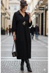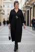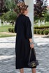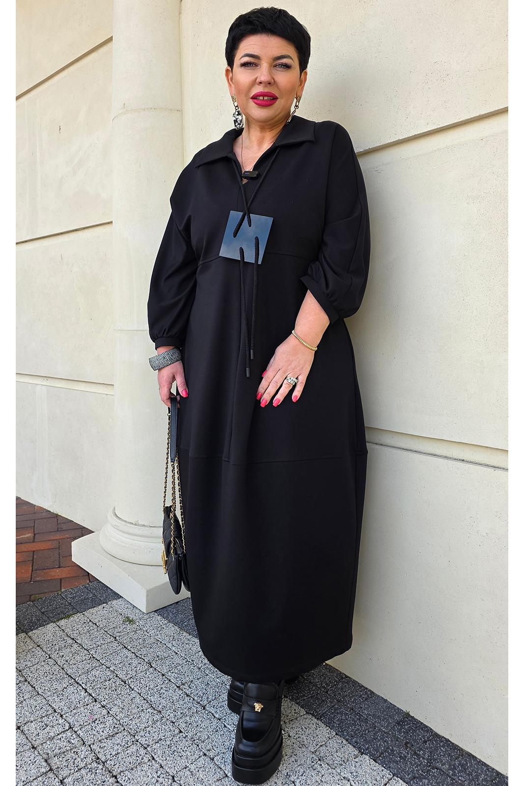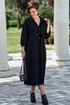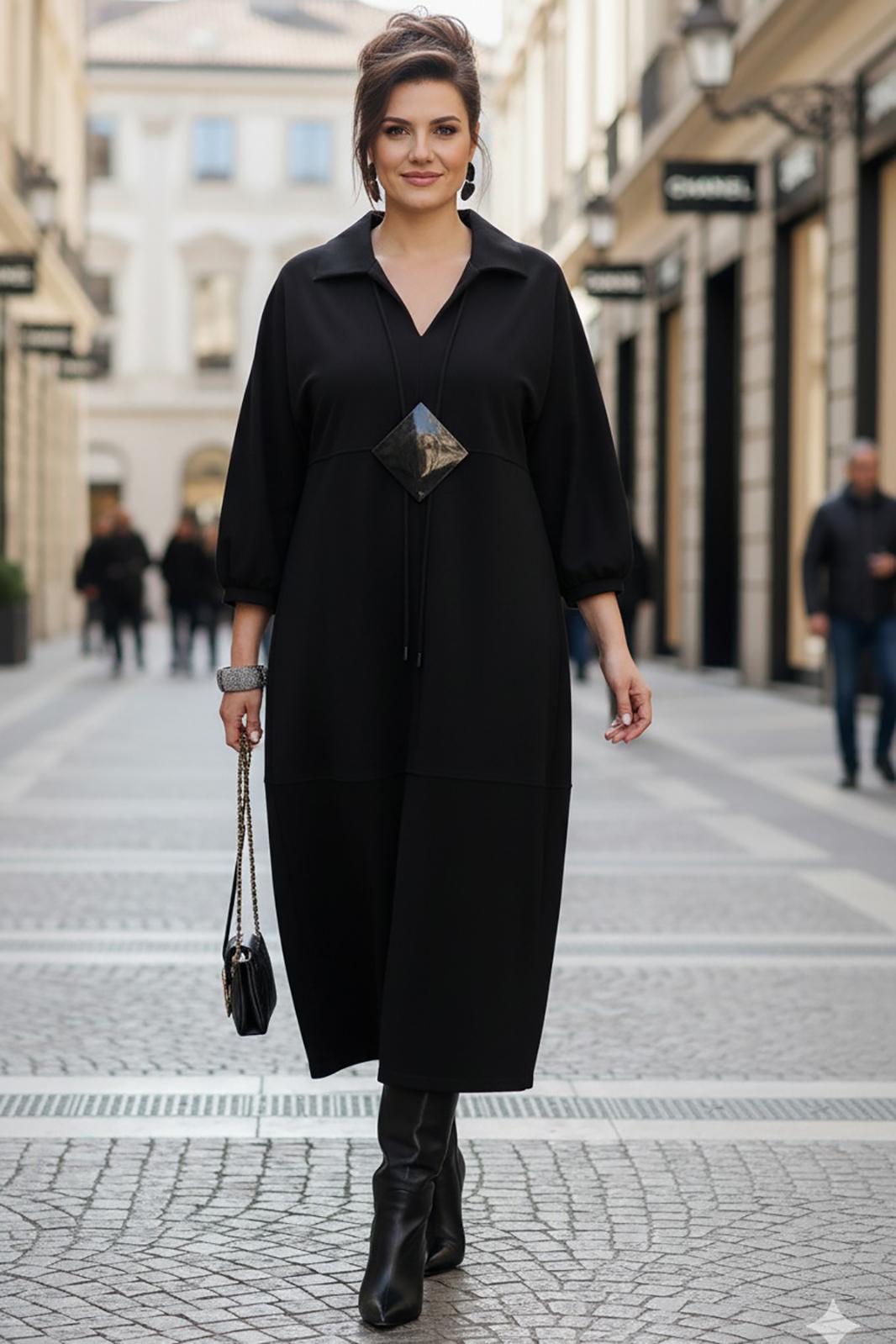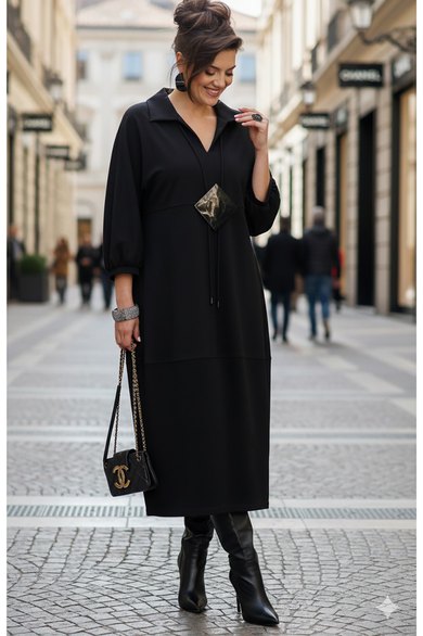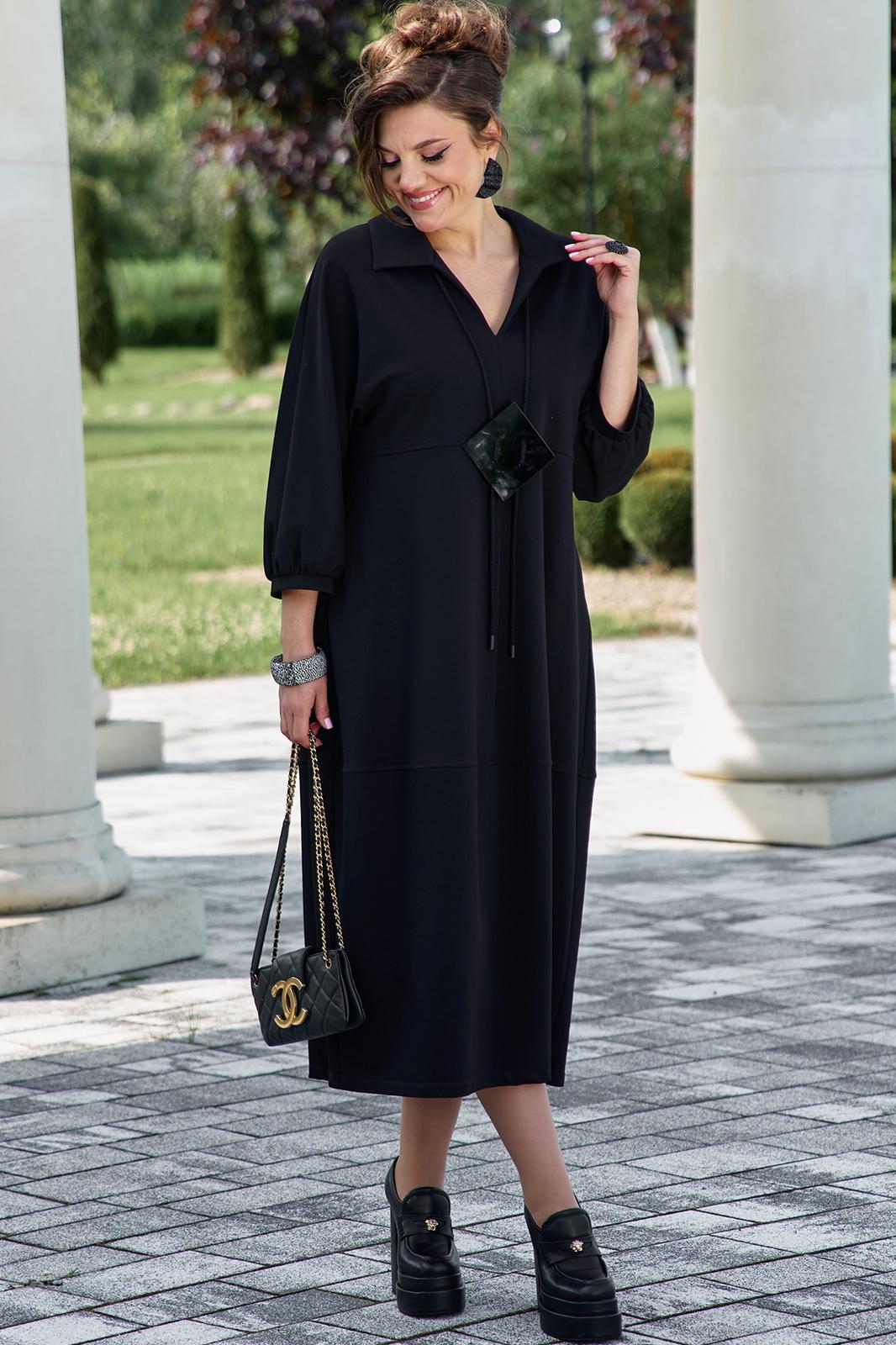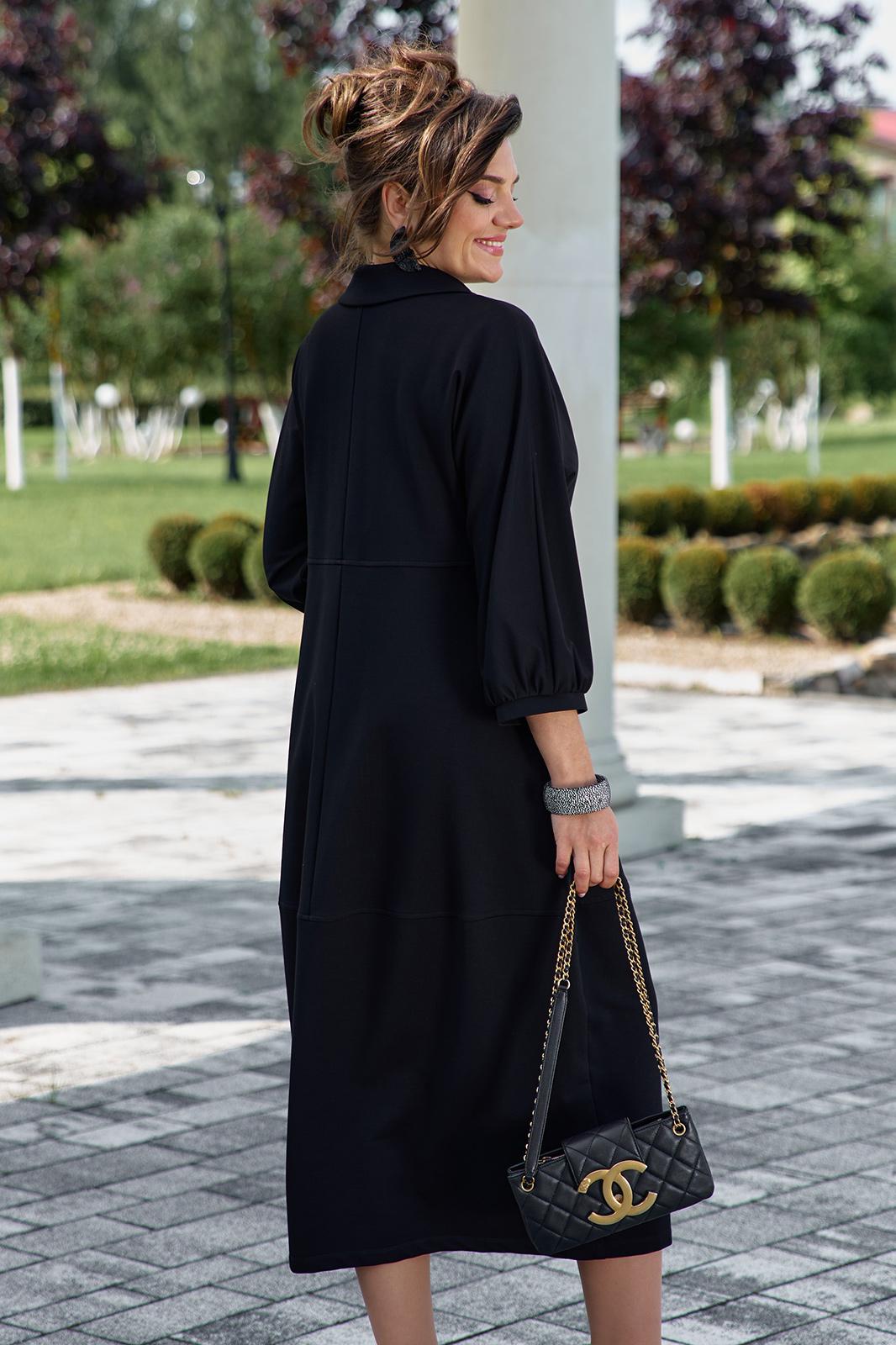 Представляем вашему вниманию элегантное платье миди в насыщенном чёрном оттенке, который актуален в любом сезоне. Выполненное из мягкой, струящейся ткани, оно обеспечивает приятные ощущения при носке и безупречную посадку. Свободный крой платья напоминающий собой форму «купола» слегка заужается к низу придает силуэту изящество и позволяет ему деликатно ниспадать по фигуре. V-образный вырез горловины, дополненный отложным воротником, придает платью классический и в то же время современный вид. Линия талии завышенная, лиф платья двойной, со средним швом. Рукав в платье цельнокроеный со сборкой на манжету, добавляют образу непринужденности и объема. Горизонтальный шов, расположенный примерно на уровне бедер, создает интересный структурный акцент. В боковых швах карманы. В качестве дополнительного декоративного элемента в комплекте с платьем идёт украшение ручной работы. Длина платья 125 см., длина рукава 62,5 см (р 52-56), 64,5 см (р 58-62).