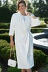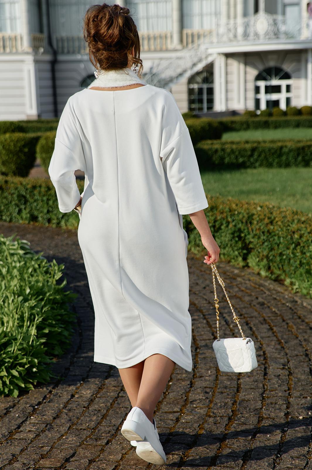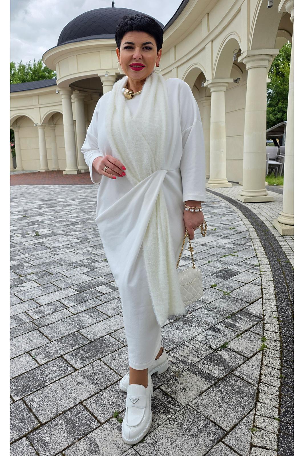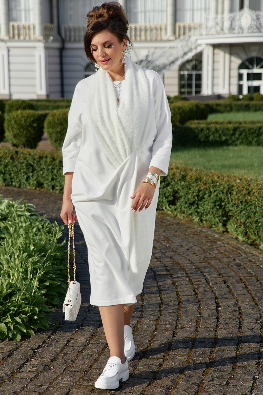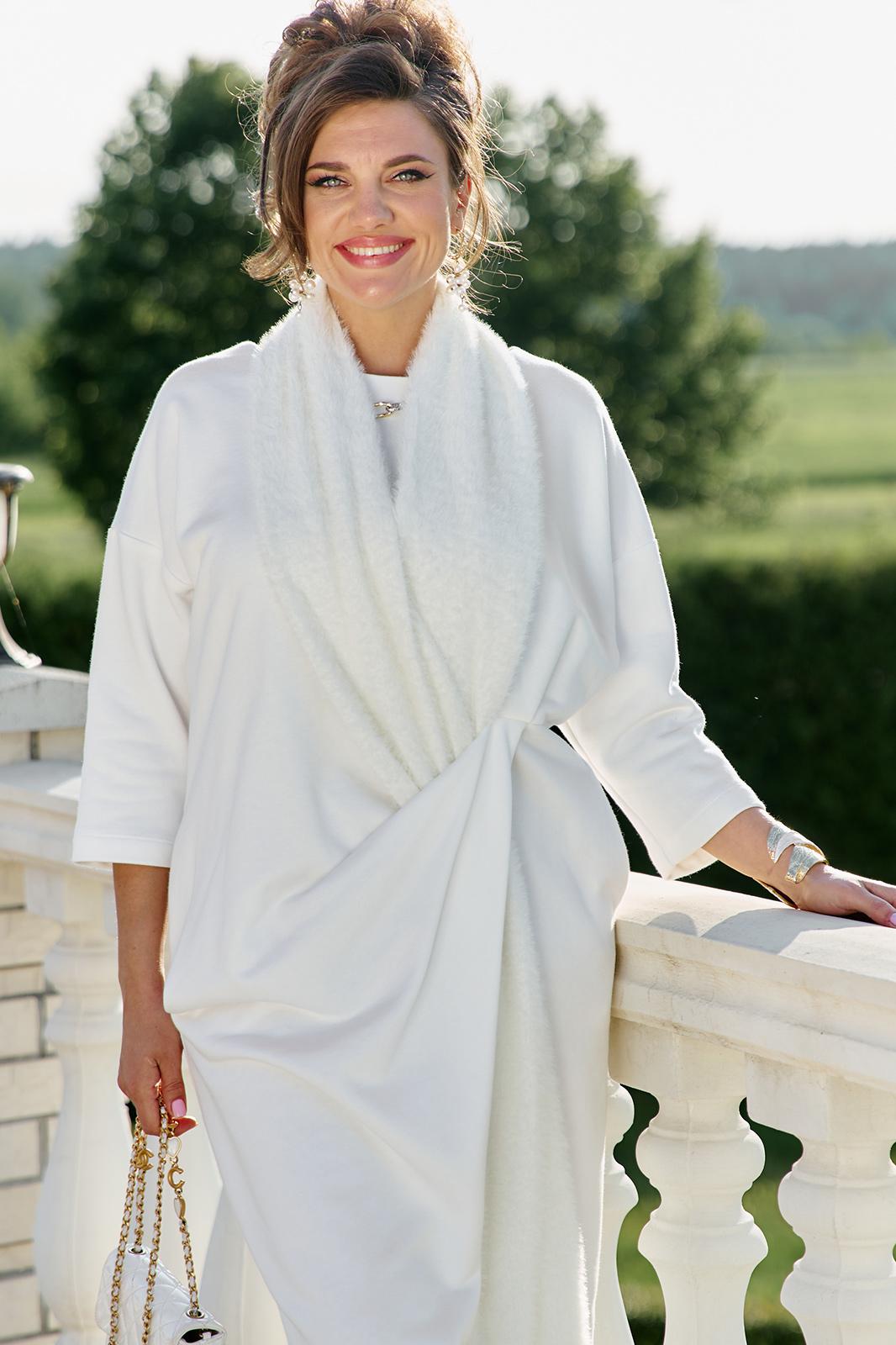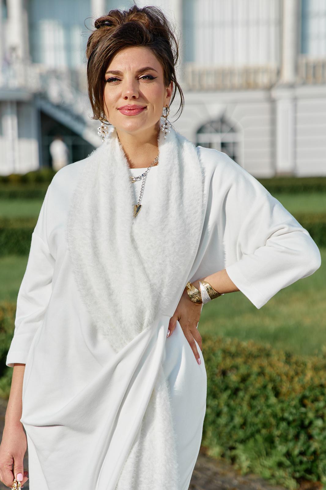 Если Вы ищете идеальное сочетание стиля и комфорта, вот идеальный выбор. Мы специально подобрали качественную и тактильно приятную ткань, которая хорошо держит свою форму, создавая ощущение легкости и свободы движения. Платье свободного силуэта, слегка заужается к низу, с округлой формой горловины, линия плеча спущенная. Главная интрига кроется в декоративной складке в подрезе по переду. Это тщательно продуманный декоративный элемент. Эта складка — свидетельство высокого искусства кройки; она добавляет глубину и динамику лаконичному фасону, создавая иллюзию движения даже в неподвижности. Спинка в платье со средним швом. Рукав в платье втачной, длиной 7/8. Но кульминацией образа становится отдельный декоративный элемент. Шарф, идущий в комплекте, драпируется на шее, являясь частью наряда. Он создаёт завершающий образ. Вместе с платьем они создают диалог текстуры и формы, тем самым завершая образ. Гладкое, платье служит идеальным холстом для струящейся драпировки шарфа. Длина платья 116 см (р.52-56), 117 см (р.58-62), длина рукава 31 см (р.52-56), 30 см (р.58-62).