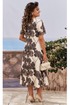 Это не платье, а находка для лета из легкой, приятной к телу ткани. Этот летний наряд идеально уместен как на вечерней прогулке по набережной, так и на встрече с друзьями в кафе. Прогулка в таком наряде принесет вам не только ощущение комфорта, но и уверенность в собственной неотразимости. Удивительной красоты цветочный принт и А-силуэт создают кокетливый и романтичный образ! Платье длины «миди», А-силуэта, полуприлегающее. Горловина в платье округлой формы, рукав в платье цельнокроеный. По переду платья из бокового шва фигурный рельеф заканчивающийся разрезом. В качестве дополнительного отделочного элемента по переду платья- имитация застёжки на петли-пуговицы, пуговицы обтянуты в тон платья, что придаёт образу завершённости. Спинка в платье со средним швом.