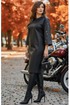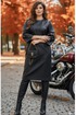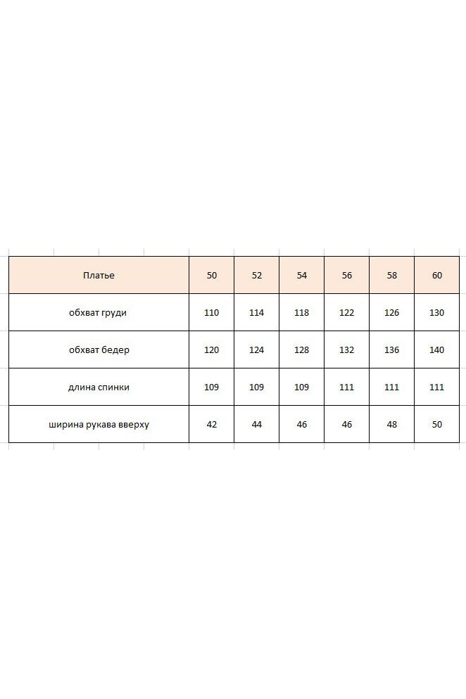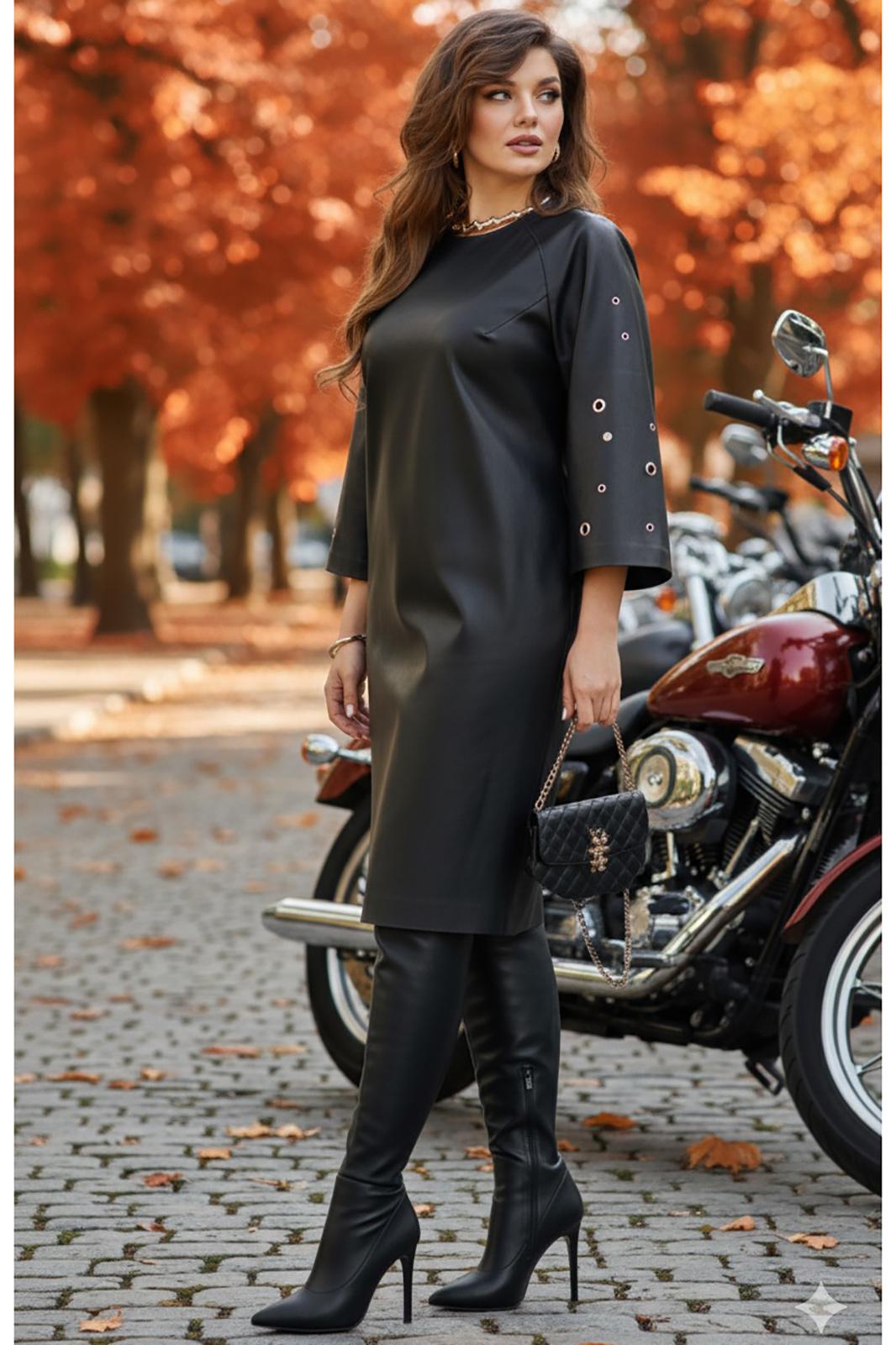 Платье полуприлегающего силуэта с округлой формой горловины. По переду платья нагрудные вытачки. По спинке застёжка на декоративную тесьму молнию в среднем шве платья и разрезом от низа. Рукава становятся главным акцентом: ряд люверсов и кнопок, выстроенных словно доспехи, придают образу дерзкий, почти урбанистический шик. Рукав в платье реглан, расширяется к низу, длиной 7/8. В боковых швах платье карманы. Длина платья 109 см (р 50-54), 111 см (р 56-60). Длина рукава 61 см.