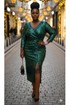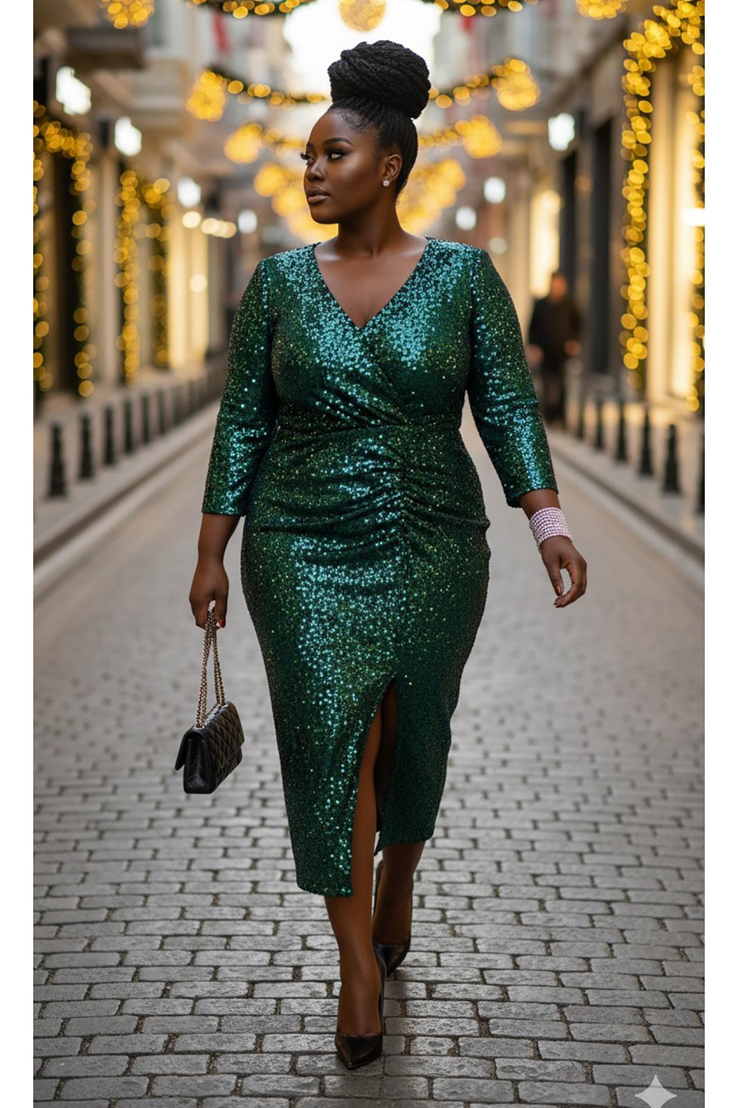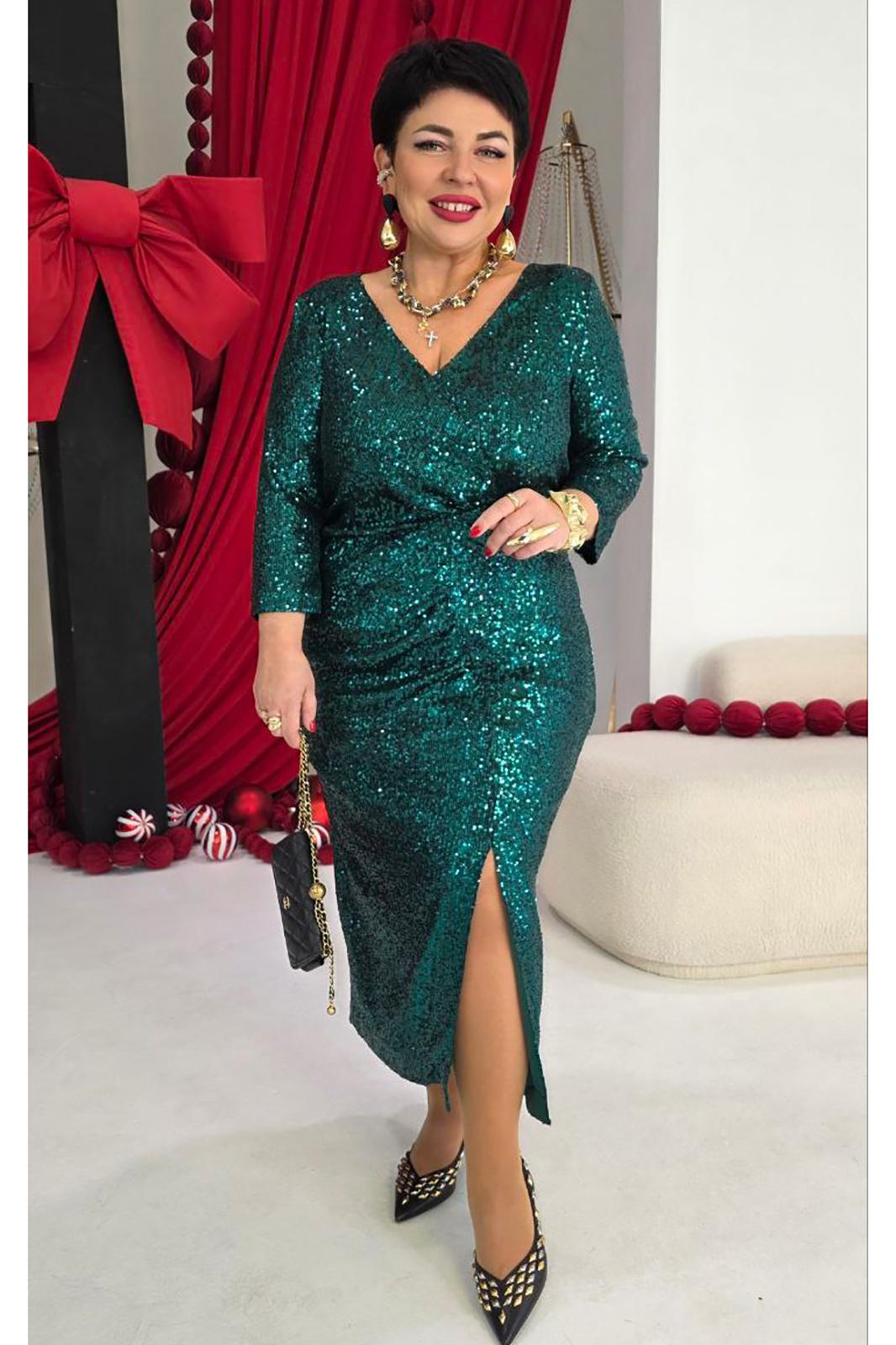 Это вечернее платье изумрудно-зеленого цвета в пайетку, с мерцающим эффектом - завораживают! Пайетки позволяют своей обладательнице выделиться из толпы, привлечь восхищенные взгляды и быть в центре внимания на любом мероприятии. Платье прилегающего силуэта, длины миди. По переду платья фигурный подрез по талии, V-образный вырез по горловине, а также вертикальный рельеф со сборкой переходящий в разрез от низа, который добавляет образу динамики. Рукав в платье втачной, длиной 7/8. По спинке платья талиевые вытачки. На талии по переду платья ткань слегка присобрана, что подчеркивает фигуру. Это платье - отличный выбор для праздничных мероприятий или вечеринок. Платье на подкладке. Длина платья 117 см, длина рукава 46 см.
