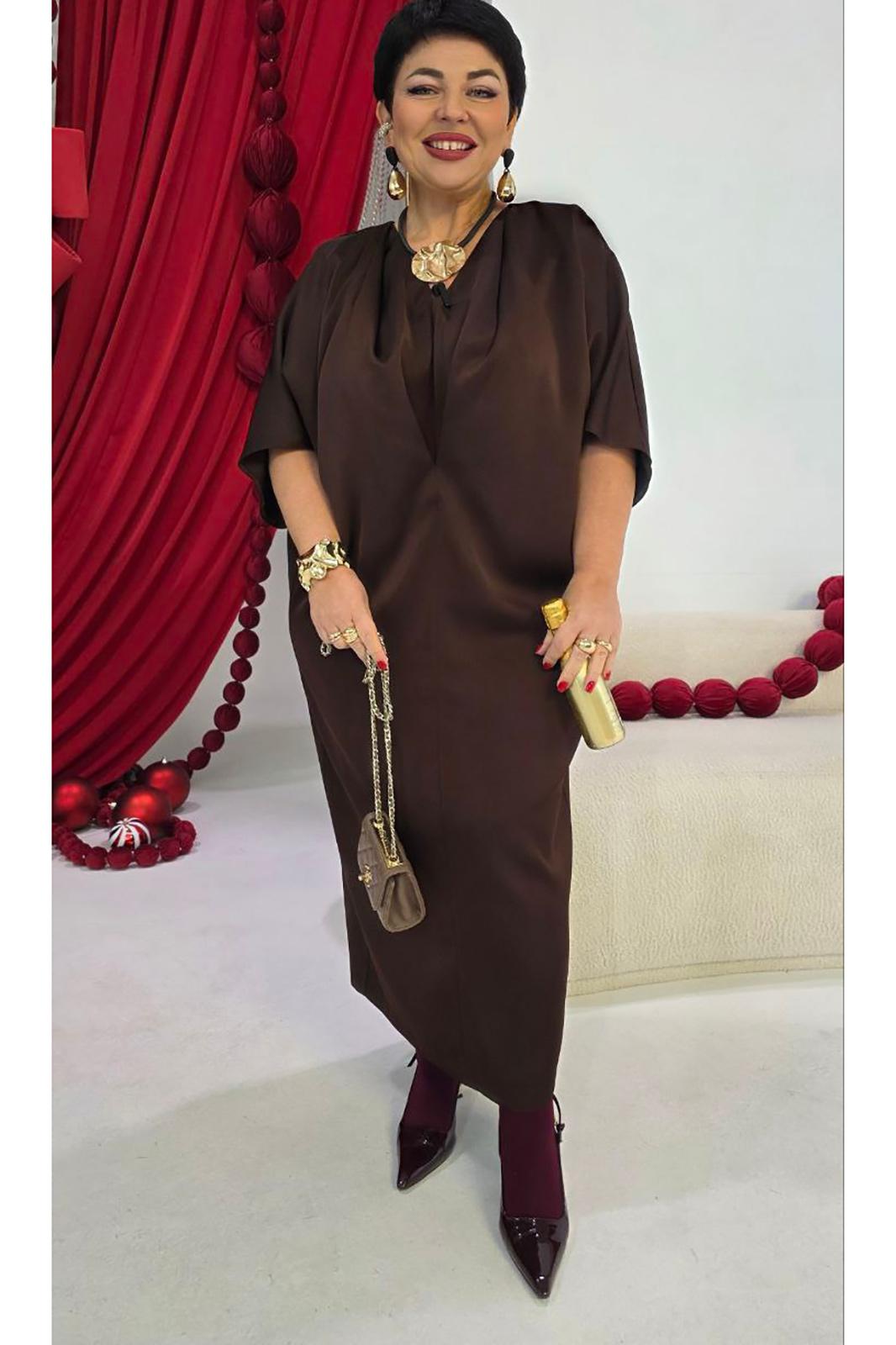 Это платье — олицетворение силы и изящности: ярко, но не кричаще. Уверенный, волнующий наряд для торжественных мероприятий и важных встреч. Силуэт «летучая мышь» мягко обтекает фигуру, создавая плавный переход между линией плеч и линией талии, затем свободно распускается по бокам, позволяя ткани играть волной при каждом движении. Вырез горловины V-образной формы подчёркивает изящную шею, а рукава добавляют образу лёгкую драматичность и женственность. По переду платья средний шов, с застроченной складкой выше уровня талии переходящую в складку по плечу. Спинка в платье со средним швом с разрезом от низа. Рукав в платье цельнокроеный со щеловидным вырезом проймы. Длина платья 123 см, длина рукава 48 см (р 52-56), 48,5 см (р 58-62).