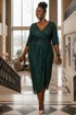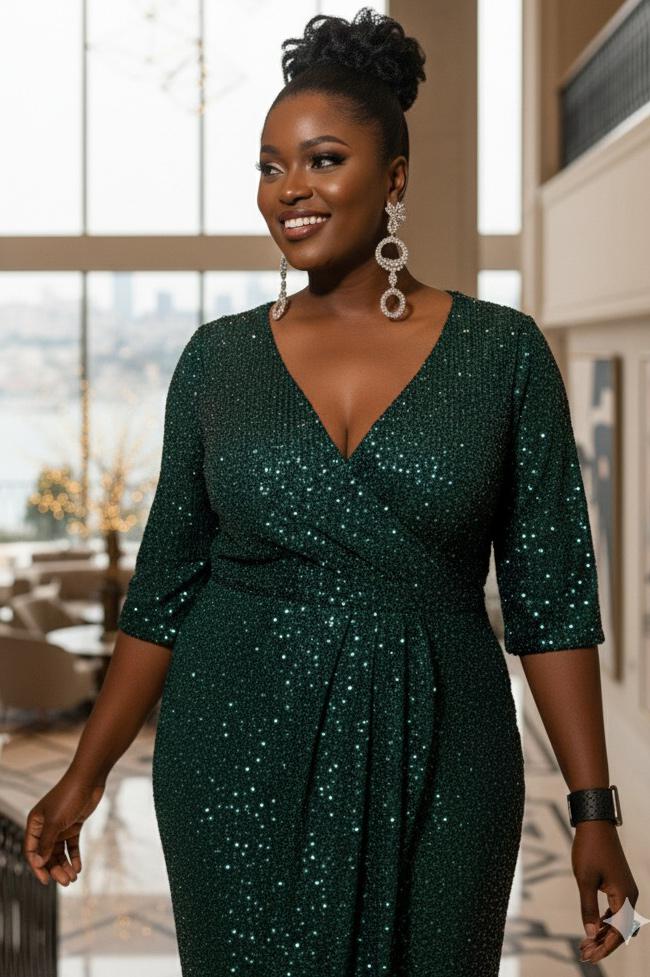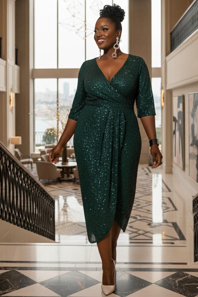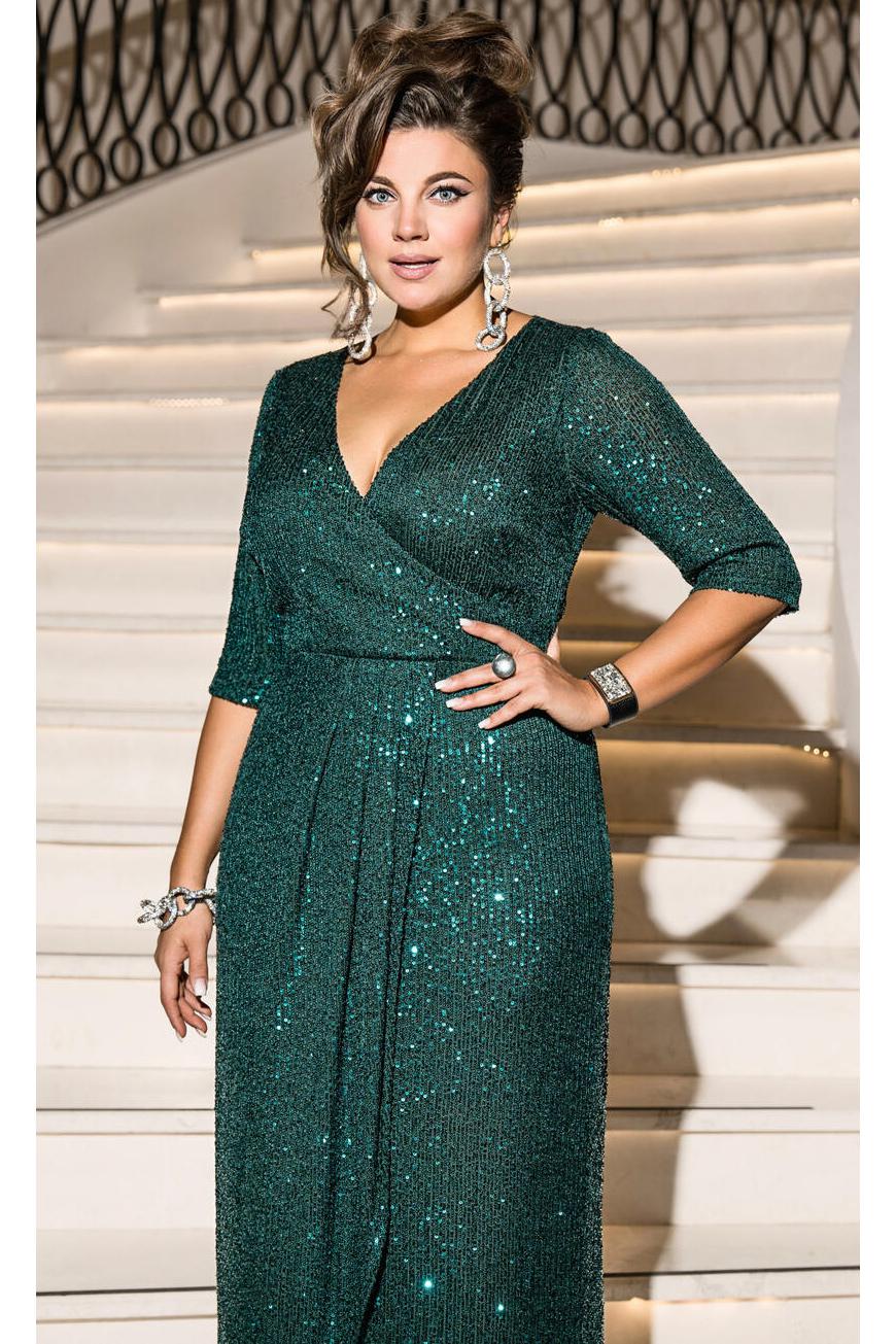 Притягательное вечернее платье из нарядной ткани в пайетку с лифом «на запах» прекрасно подойдет для вечерних образов, а также станет стильным и лаконичным женственным нарядом. Прилегающий силуэт платья с V-образным вырезом горловины подчеркнет достоинства фигуры, а разрез изящно приоткроет ноги и вытянет весь силуэт. Платье отрезное по талии с лифом и с заложенными складками по юбке платья «на запах». Спинка платья отрезная по талии с застёжкой на потайную молнию в среднем шве. Рукав втачной, одношовный длиной ¾. Платье на подкладке. Длина платья от высшей точки плечевого шва до низа 131 см (р. 52-56), 132 см (р. 58-60). Длина рукава 39 см (р. 52-56), 40 см (р. 58-60).