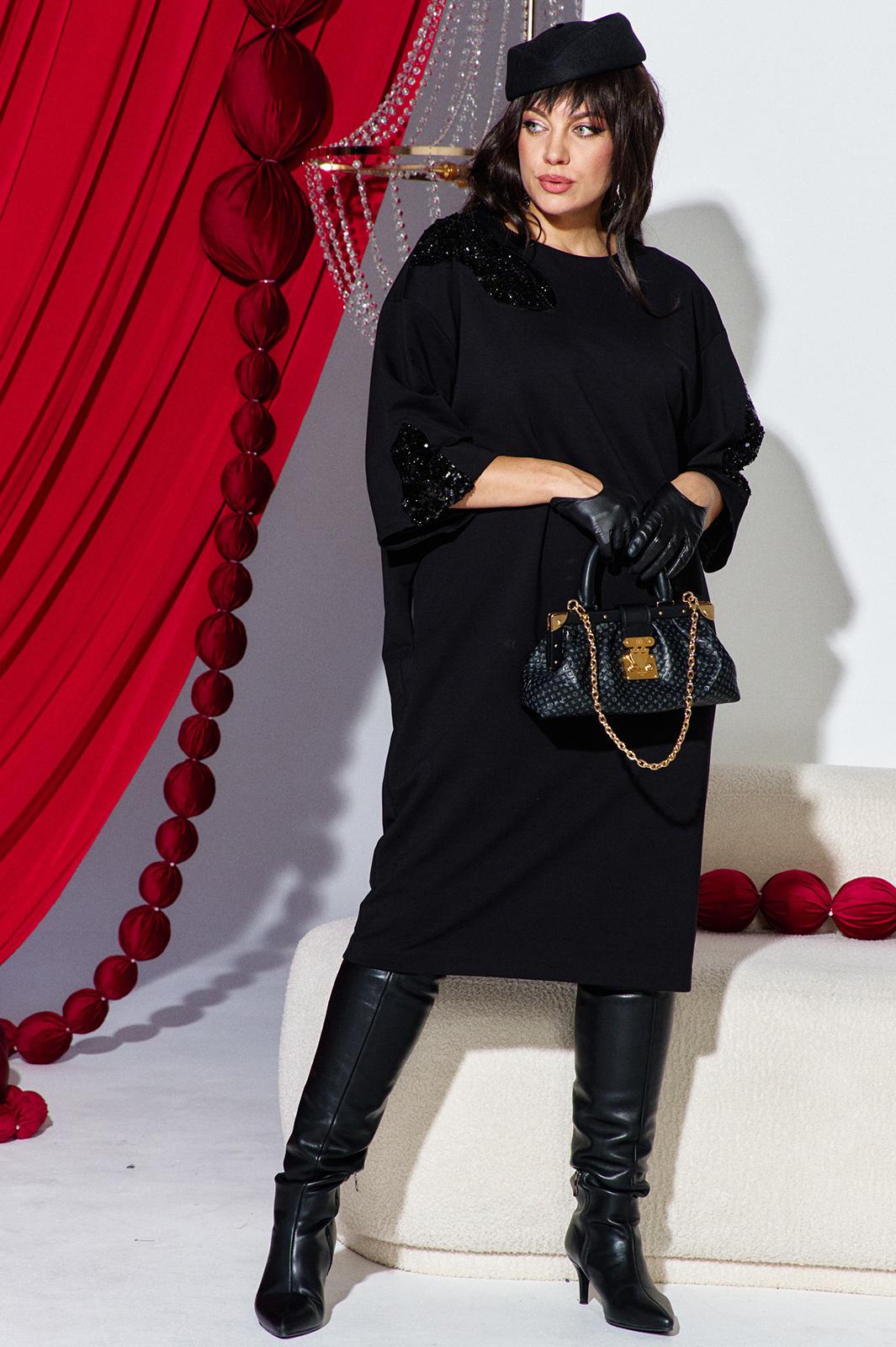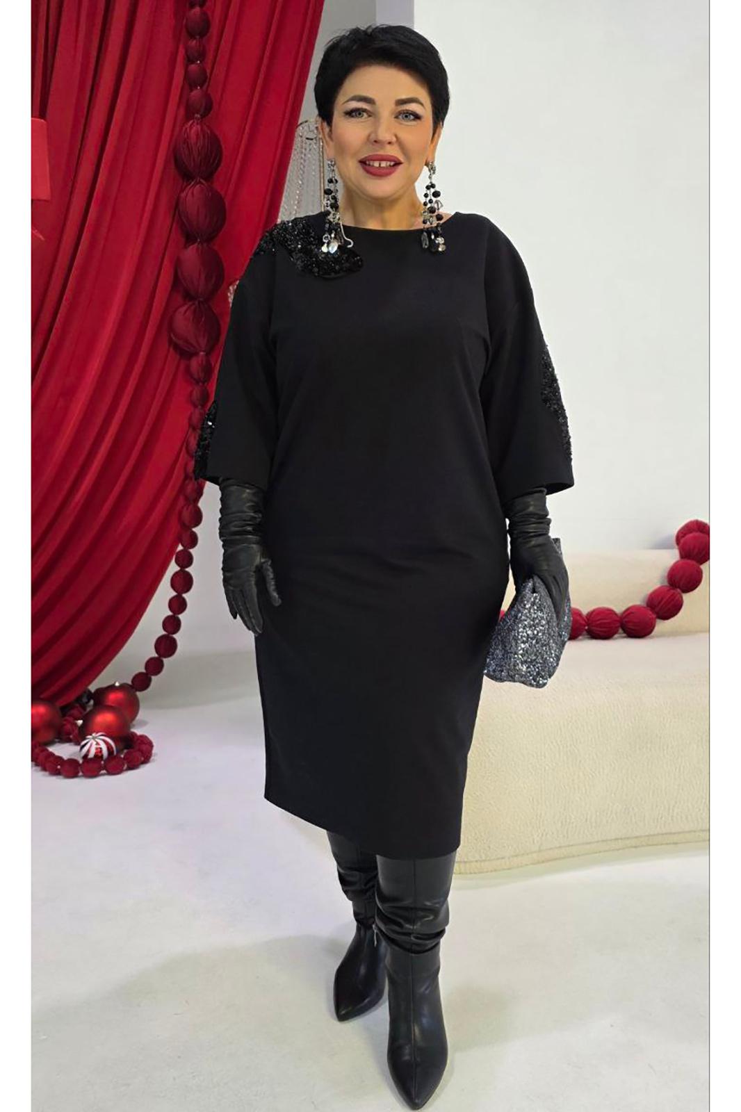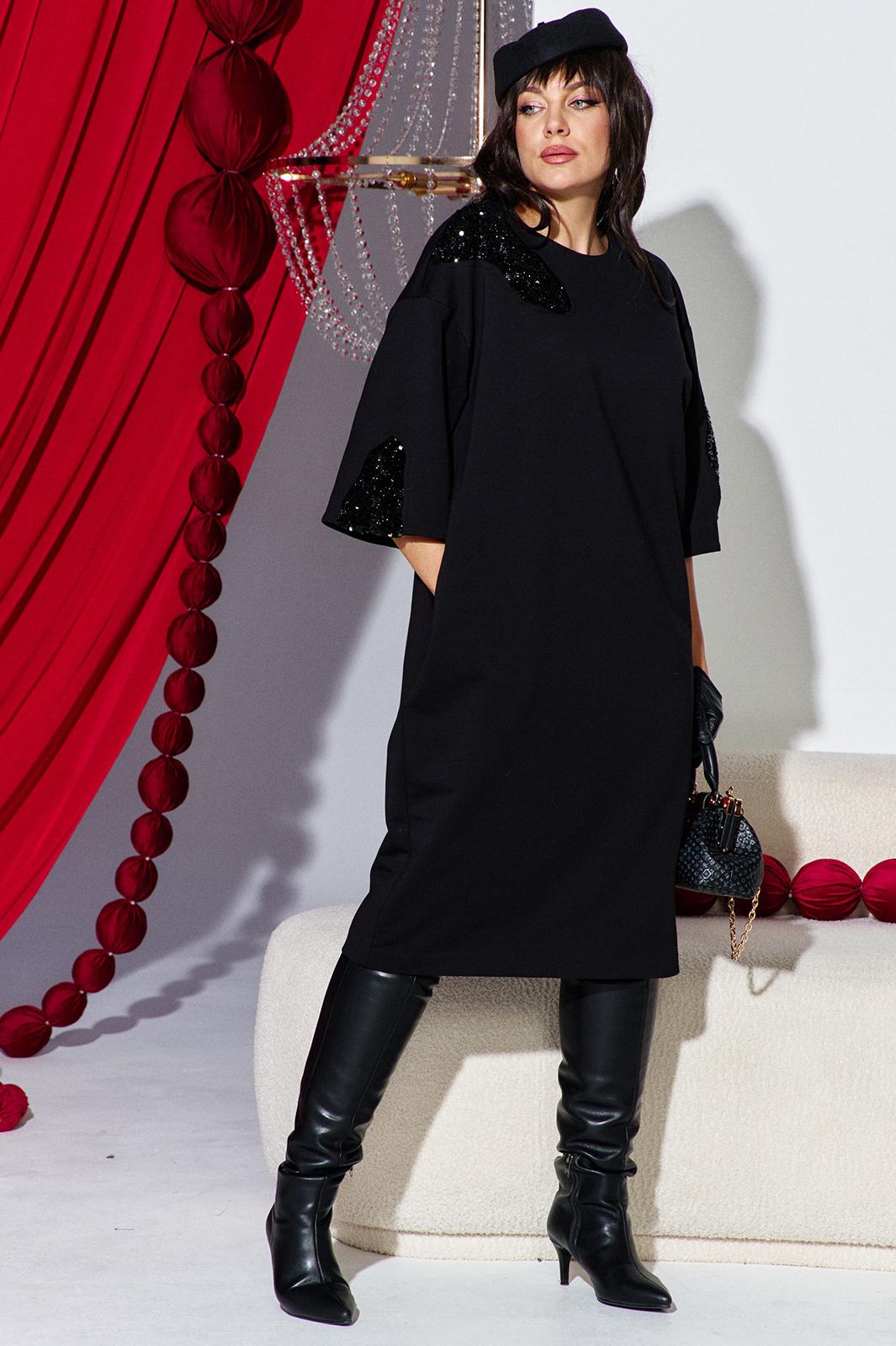 Если Вы ищете идеальное сочетание стиля и комфорта, вот идеальный выбор. Мы специально подобрали качественную и тактильно приятную ткань, которая хорошо держит свою форму, создавая ощущение легкости и свободы движения. Отделочные вставки из мерцающей пайетки в тон основной ткани добавляют образу акцентные нотки. Платье свободного силуэта с округлой формой горловины, линия плеча спущенная. По переду платья декоративная вставка из отделочного материала- пайеток. Спинка в платье с средним швом. Рукав втачной, длиной 7/8. В качестве дополнительного декоративного элемента в рукавах ассиметричные вставки из пайеток. Главной особенностью в изделии является эффект необработанных срезов, который добавляет образу дерзости. Длина платья 105 см (р 50-54), 107 см (р 56-60), длина рукава 32 см.