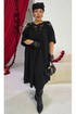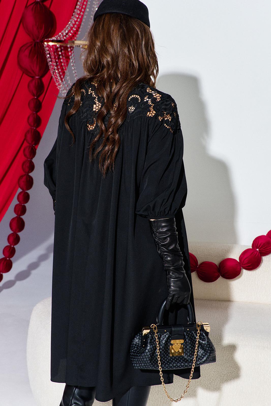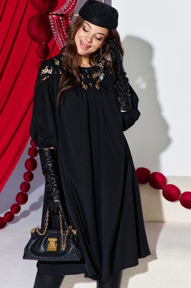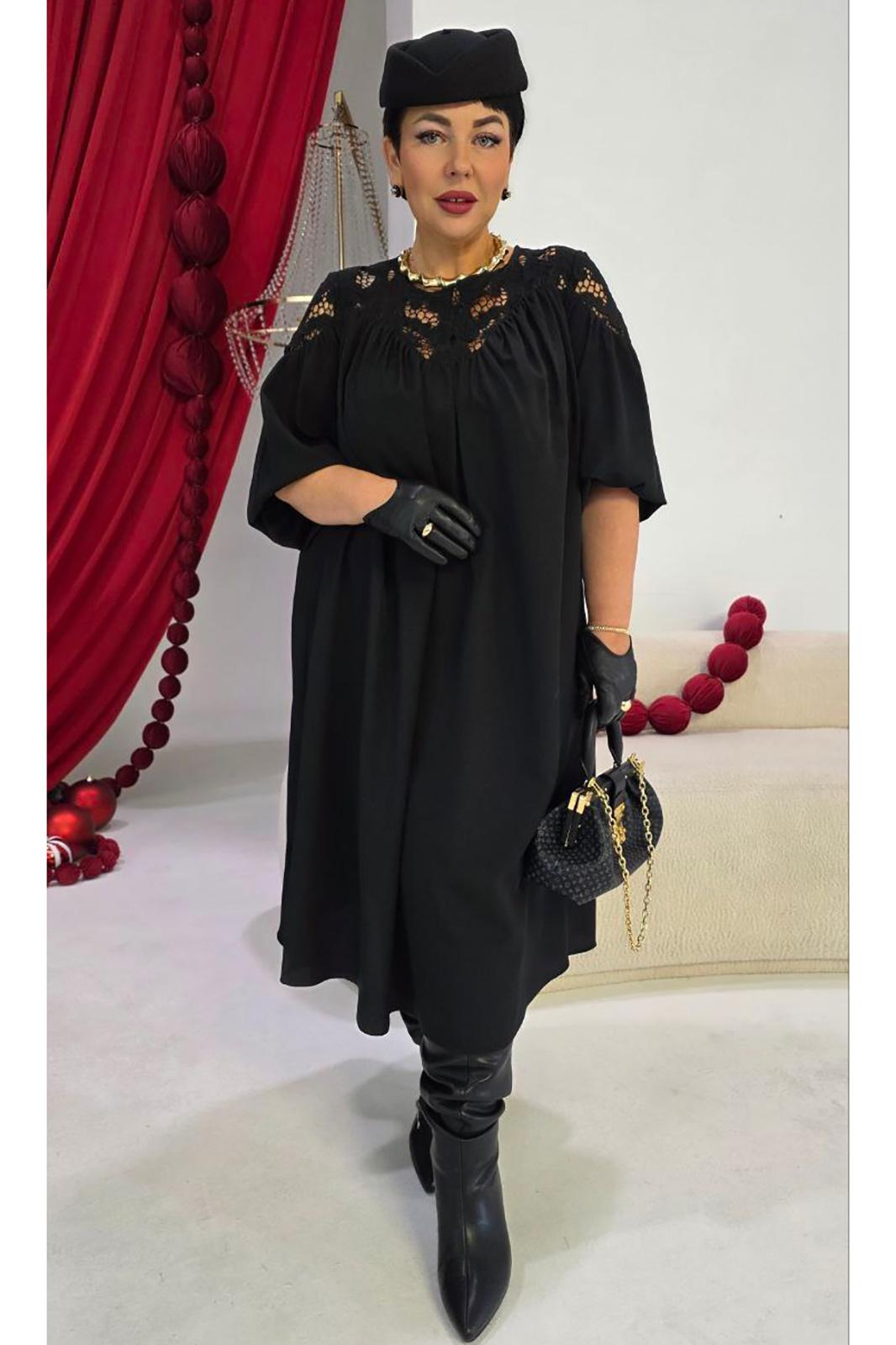 Шикарное женское платье классического черного цвета со вставками из кружева, которые делают Ваш образ нарядным и изысканным. В данном платье Вы будете неотразимы как на праздничной вечеринке, так и в вечернем выходе. Платье трапециевидного силуэта, который создаёт игривое настроение за счёт лёгкости ткани и силуэта модели. Горловина в платье округлой формы, по переду и спинке платья фигурный подрез со сборкой и вставкой из отделочной ткани гипюра. Рукав в платье втачной, длиной ¾ с декоративной вставкой из отделочной ткани-гипюра, со сборкой по низу на манжет. По спинке платья фигурный подрез со вставкой из отделочной ткани – гипюра, вырез капелька с застёжкой на декоративную петлю-пуговицу. Платье на подкладке. Длина платья 107 см, длина рукава 46 см.