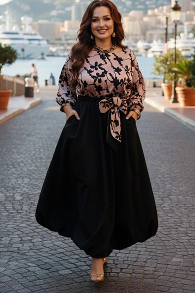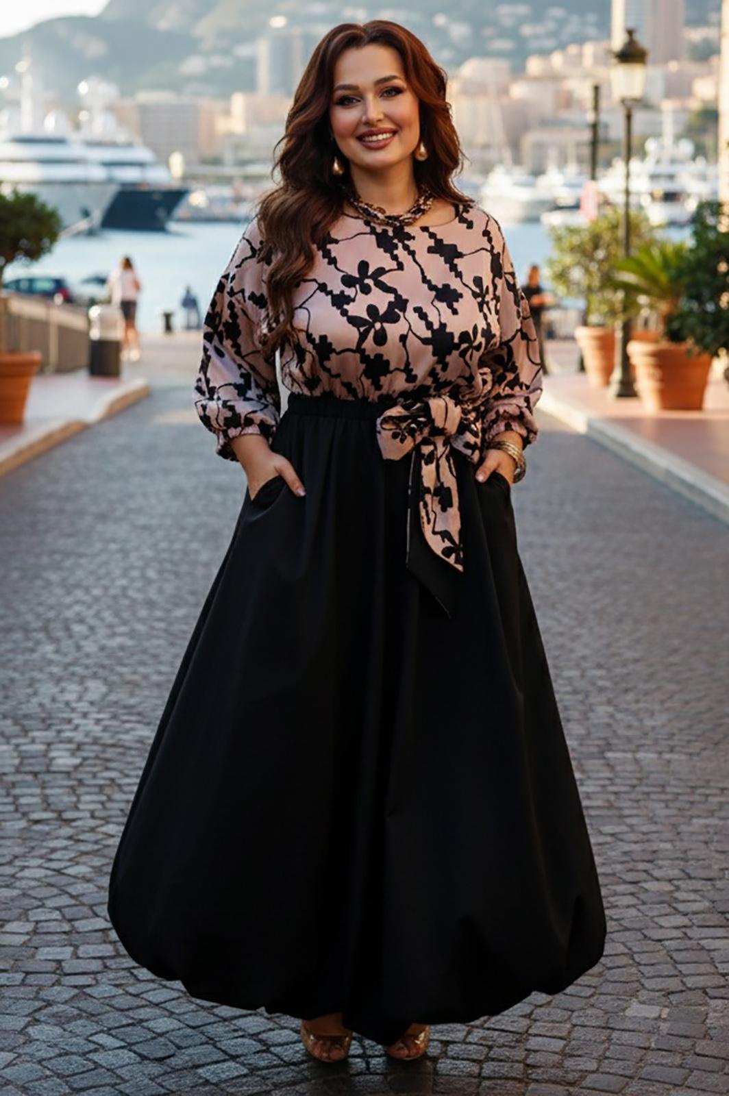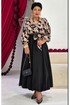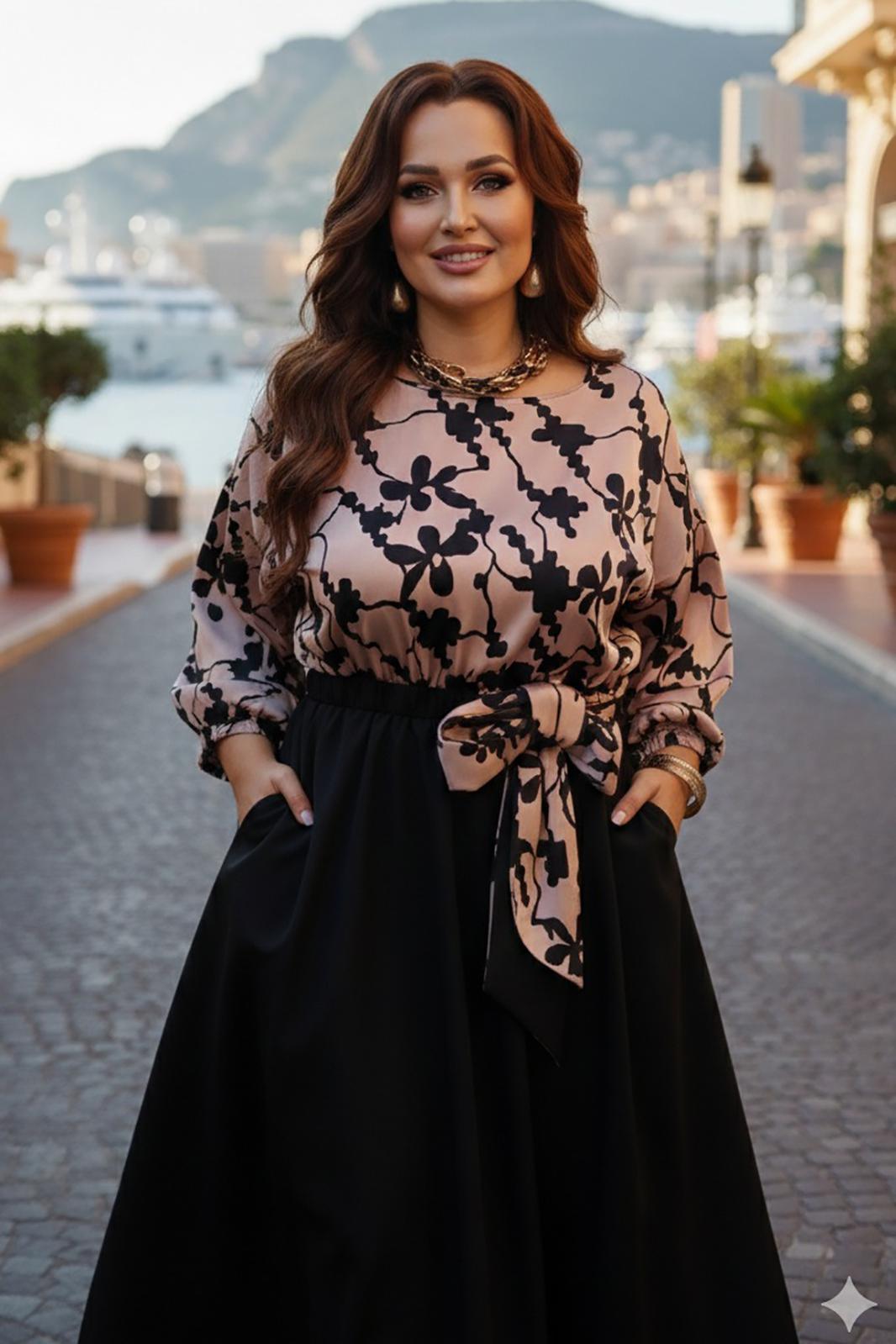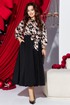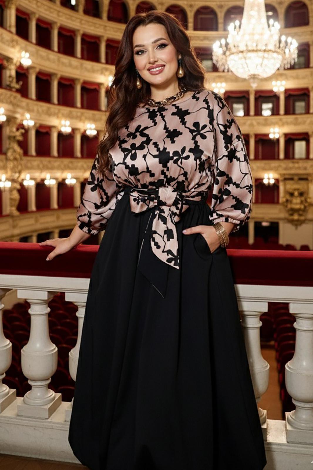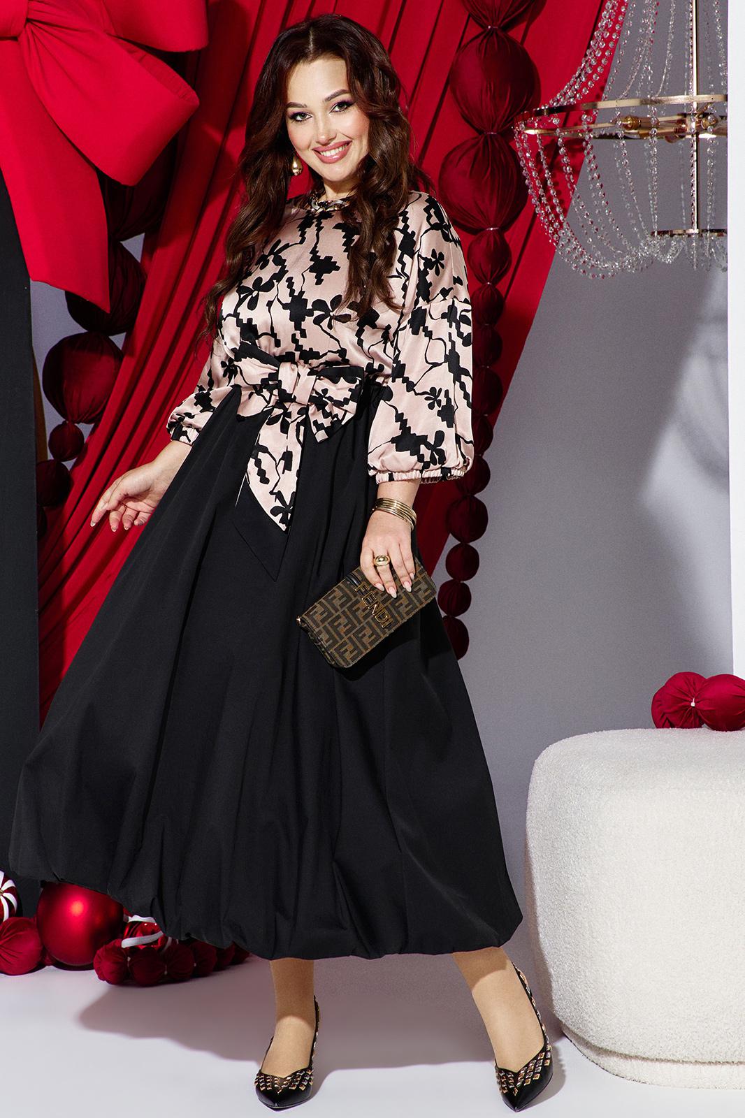 Невероятно красивое и элегантное платье отвечает всем требованиям вечернего наряда! Сочетание тканей разных фактур и дизайнов в одной модели - тренд сезона. Для лифа с мягкими присборенными рукавами мы выбрали пластичный атлас, а формоустойчивую тафту - для создания модной юбки «баллон». Сдержанный блеск атласа с деликатным принтом подчеркивает глубину тона черной тафты. Платье отрезное по талии, с круглой горловиной. Рукав длиной 7/8 со спущенной проймой и сборкой по низу на резинку. Длинная юбка «баллон» собирается по талии на эластичную ленту в отрезном поясе. По поясу платье декорировано бантом в виде съемной броши. Длина платья 129 см (р 48-52), 130 см (р 54-58). Длина рукава 31 см.