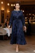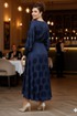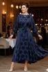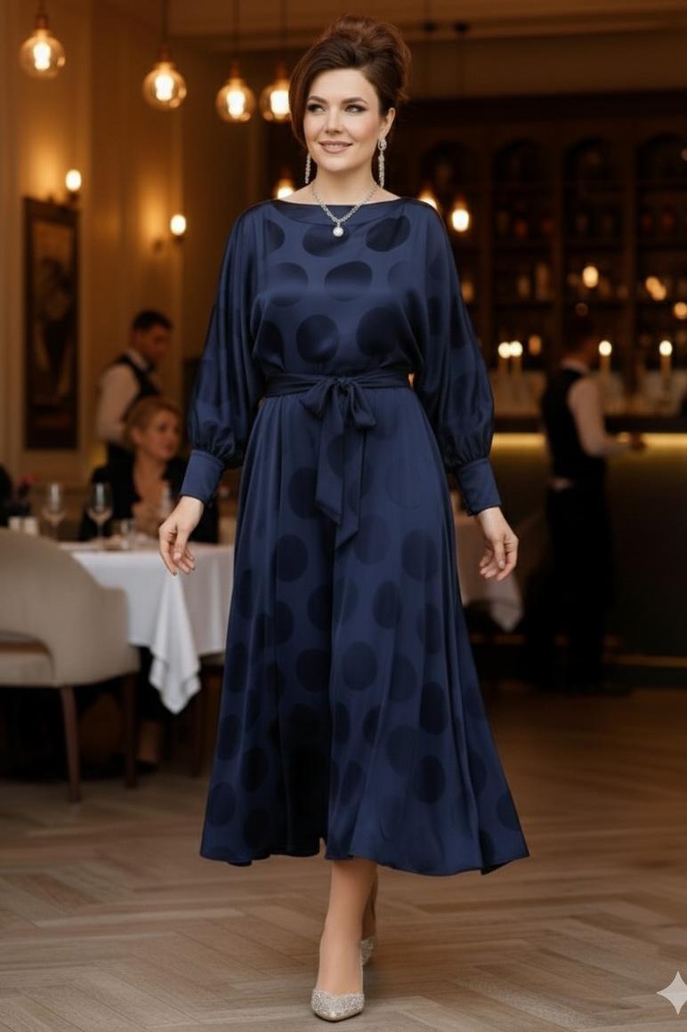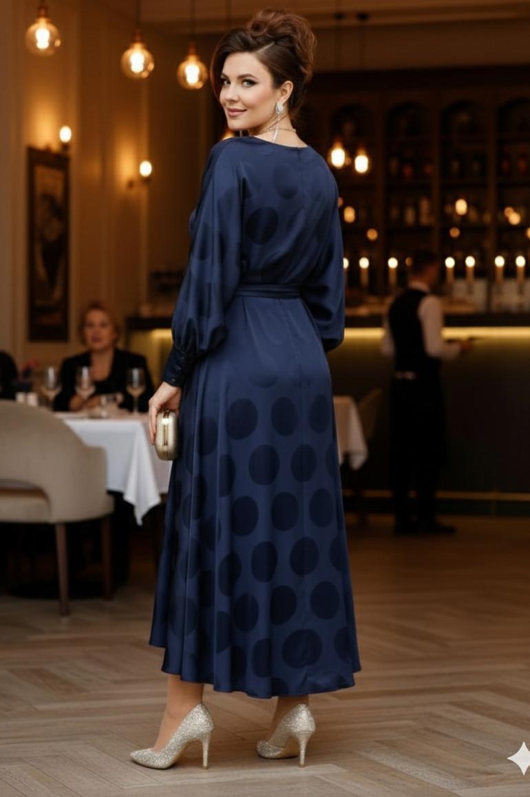 Элегантное вечернее платье-миди выполнено из благородного шелковистого материала насыщенного темно-синего оттенка. Платье отрезное по талии, с широкими рукавами-баллон на высоких манжетах, что придает силуэту воздушность и драматичность. Главным декоративным элементом является глянцевый принт в крупный горох, создающий эффектный визуальный объем и фактуру. Вырез-лодочка акцентирует линию ключиц, а талия подчеркнута изящным съемным поясом из основной ткани, позволяющим регулировать посадку. Подол платья имеет асимметричную длину (хай-лоу), которая мягко струится и красиво развивается при движении, открывая щиколотки и демонстрируя обувь. Материал платья обладает роскошным атласным блеском, который великолепно отражает свет, подчеркивая глубину цвета и богатство изделия. Этот фасон идеально подходит для создания праздничного, торжественного образа, маскируя недостатки и подчеркивая достоинства фигуры. В боковом шве платья застёжка на потайную тесьму-молнию. Длина платья 134 см, длина рукава 61,5 см.