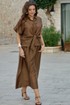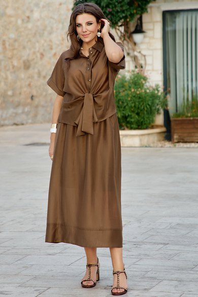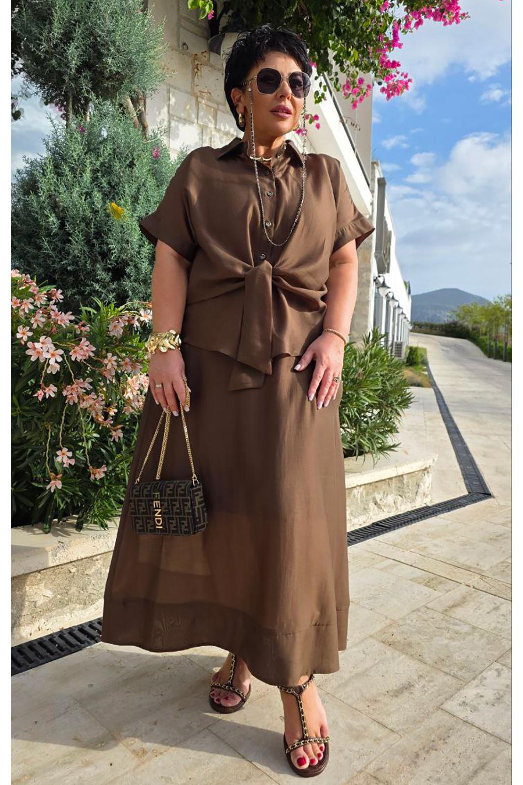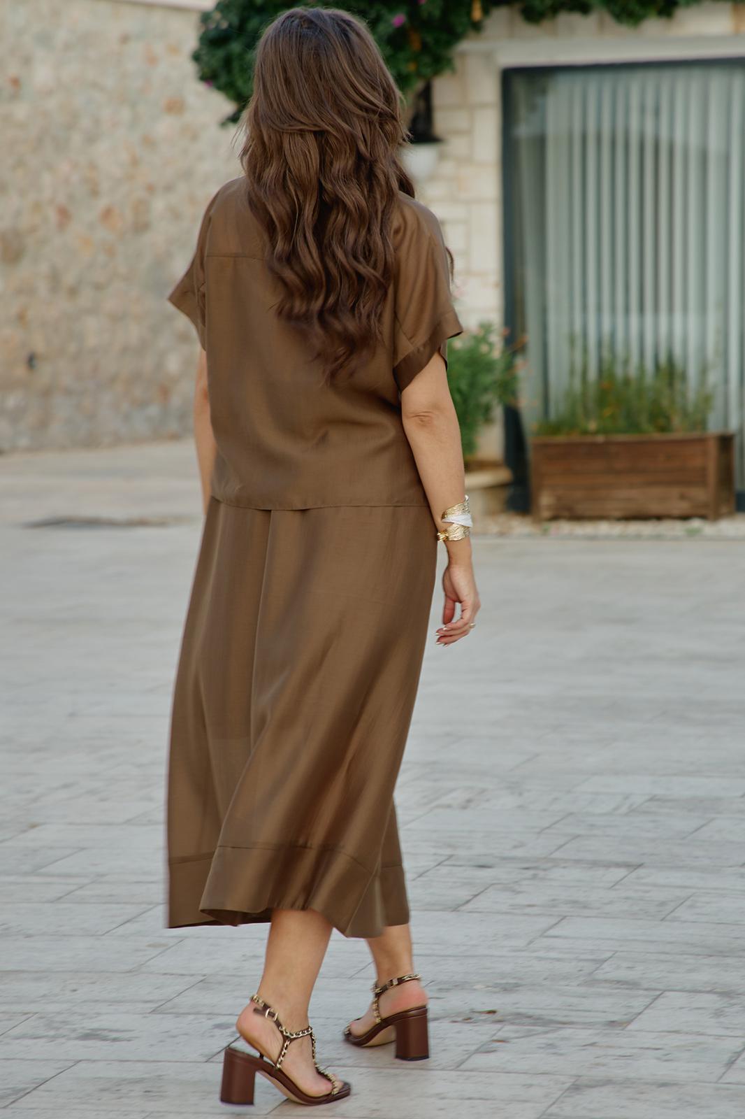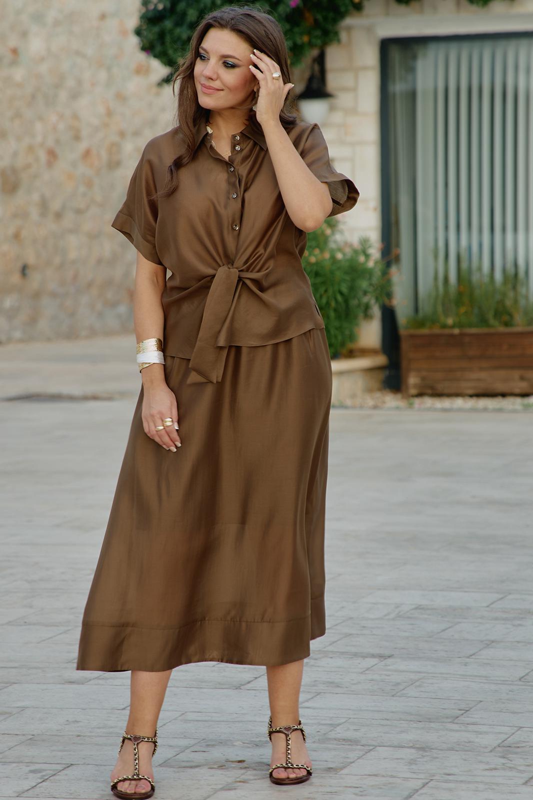 Юбка-трапеция из полупрозрачной ткани — это воплощение летней легкости и грации, ее силуэт расширяется от узкой линии талии мягко расходится к подолу, создавая воздушный объем, который танцует при каждом шаге. Ее полупрозрачность и благородный цвет позволяют создавать образы от нежно-романтичных до смело-городских. Ключ к успеху — баланс: воздушность юбки уравновешивается более структурированным верхом, а теплый шоколадный оттенок становится идеальной базой для любых цветовых акцентов. Юбка трапециевидного силуэта. Её форма одновременно структурирована и свободна: чёткие линии кроя сочетаются с текучестью материала. Длина юбки — до середины икры или чуть ниже, позволяя демонстрировать изящные лодыжки и удобную летнюю обувь. При ходьбе юбка образует красивые волны, её полы расходятся, обнажая мгновениями ногу, чтобы тут же снова сомкнуться в элегантном движении. Пояс в юбке притачной, на эластичной тесьме-резинке, что обеспечивает максимально удобную посадку на любой тип фигуры, по низу притачная деталь в сгиб в виде планки. Юбка на подкладке. Длина юбки 87 см.
