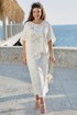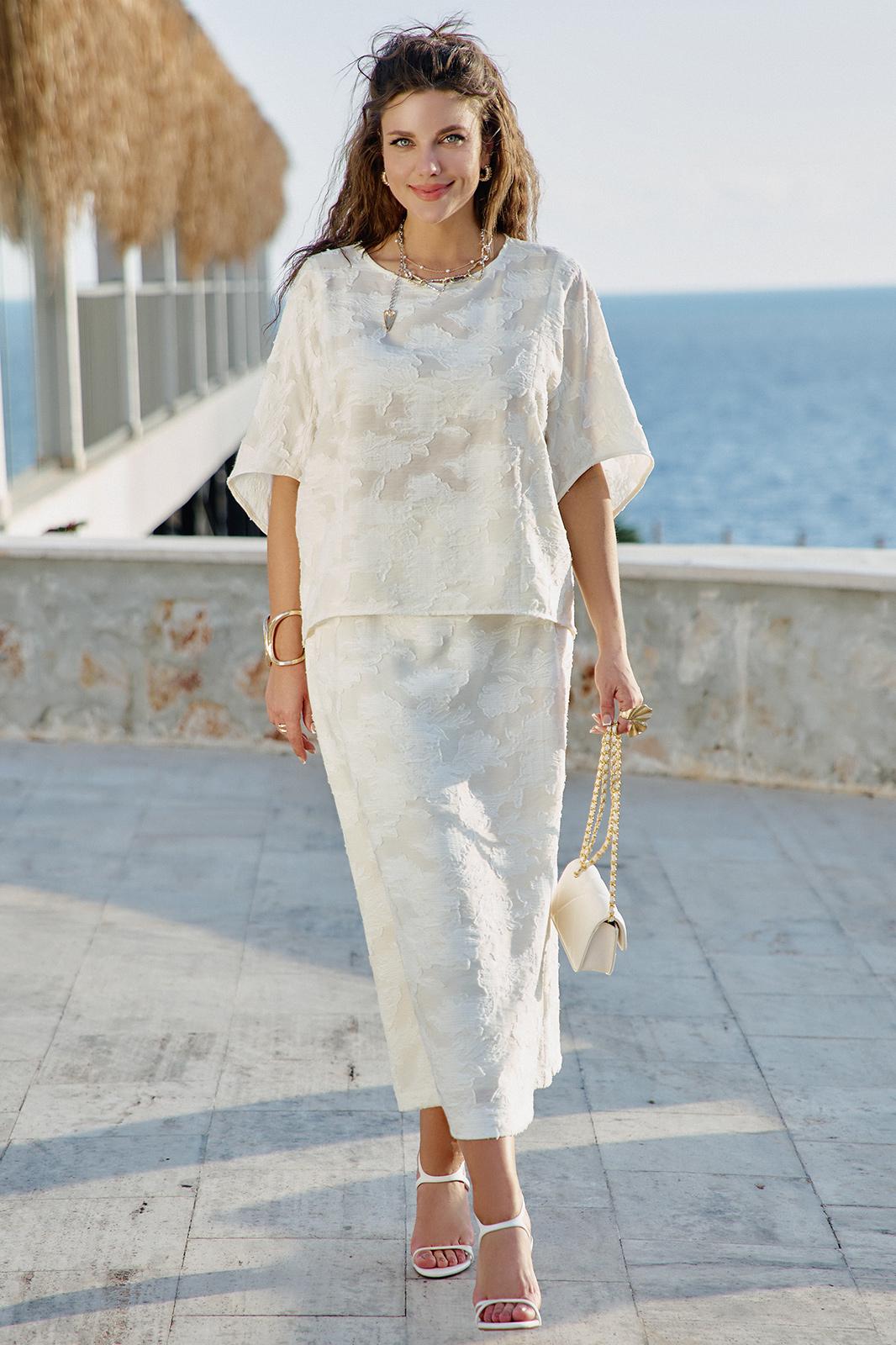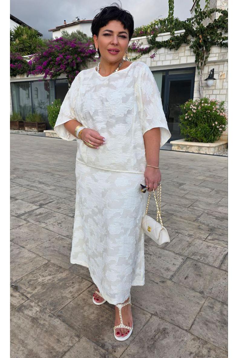 Юбка А-силуэта молочного оттенка с фактурным принтом — это выбор женщины, которая: ценит элегантность в движении — а не статичную красоту, любит тактильные ощущения — наслаждается прикосновением ткани, предпочитает мягкую женственность — без агрессивных линий, обладает вкусом к деталям — замечает красоту в текстурах, не боится быть заметной — но делает это изящно. В мире, где часто приходится выбирать между комфортом и стилем, эта юбка предлагает и то, и другое — свободу движения и утончённость линий, практичность кроя и художественность фактуры. Это не просто предмет гардероба — это заявление о подходе к жизни: можно быть одновременно и сильной, и нежной, и современной, и романтичной, и простой, и сложной. Юбка длины миди — это воплощение элегантной непринужденности. Она опускается ровно до середины икры, открывая изящные щиколотки. Юбка расклешенная, длины миди с притачным поясом со вставкой эластичной тесьмы-резинки в бочках. По спинке юбки застёжка на потайную молнию и пуговицу в поясе. Юбка на подкладке. Длина юбки 84 см.