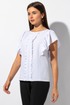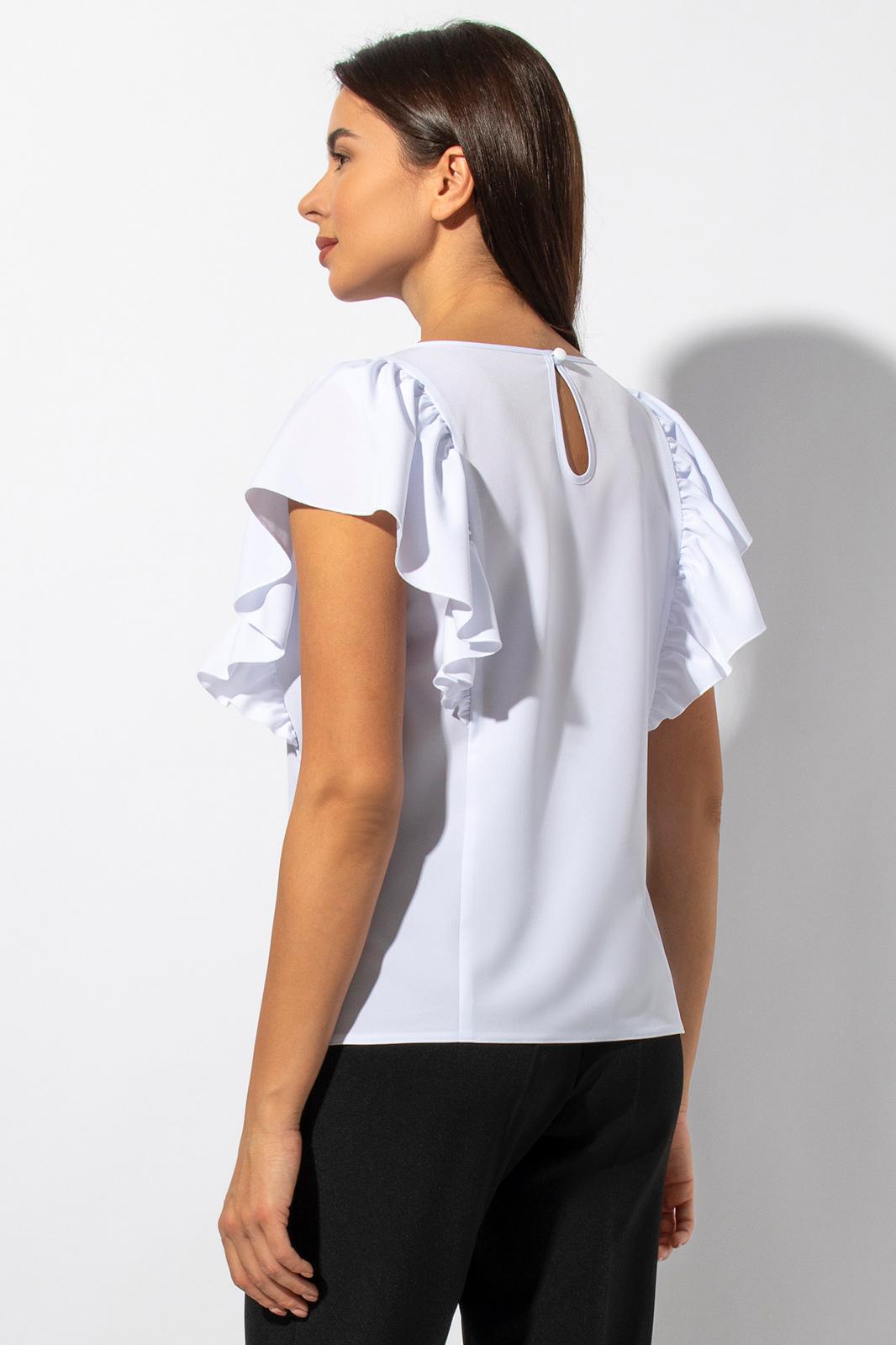 Блуза женская, свободного силуэта, с застежкой капелькой по спинке, на пуговку. Передняя часть с нагрудными выточками, вертикальными рельефами и декоративной планкой с рюшами. Спинка с вертикальными рельефами. По переду и спинке в рельеф вставлена присборенное крылышко. Горловина и пройма окантованы. Длина изделия: (р.44, 46, 48) - 57см. Длина изделия: (р.50, 52, 54) - 59см.