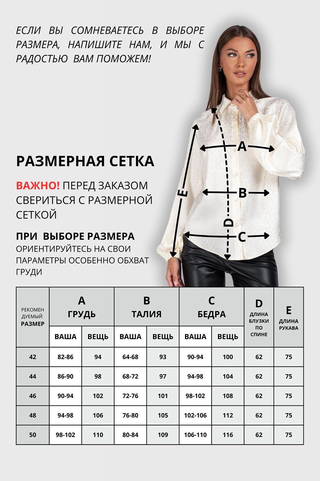 Блузка выполнена из благородной ткани, напоминающей плотный шифон, шёлк или лёгкий атлас — она приятна на ощупь, непрозрачна и практически не мнётся. Сдержанную элегантность фасона оживляет стильный леопардовый принт, добавляющий образу ноту смелости и актуальности. Эта нарядная и универсальная вещь создана для создания идеального силуэта: её можно носить под заправку для безупречного делового стиля или оставить навыпуск для более свободного и модного образа. Благодаря своему элегантному фасону, блузка станет безусловным фаворитом как для офиса, так и для торжественного события.