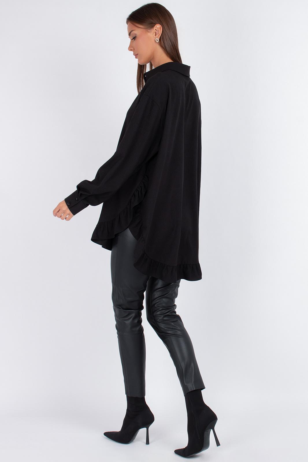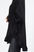 Модель имеет прямой свободный силуэт со спущенным плечом — сидит мягко, не сковывая движений. Перед из двух частей с застежкой на 7 пуговиц создает классическую основу, а главный сюрприз ждет внизу: по низу переда и спинки добавлена притачная рюша. Эта деталь преображает свободную блузку, делая ее кокетливой и нарядной.