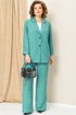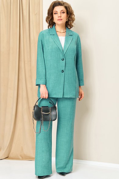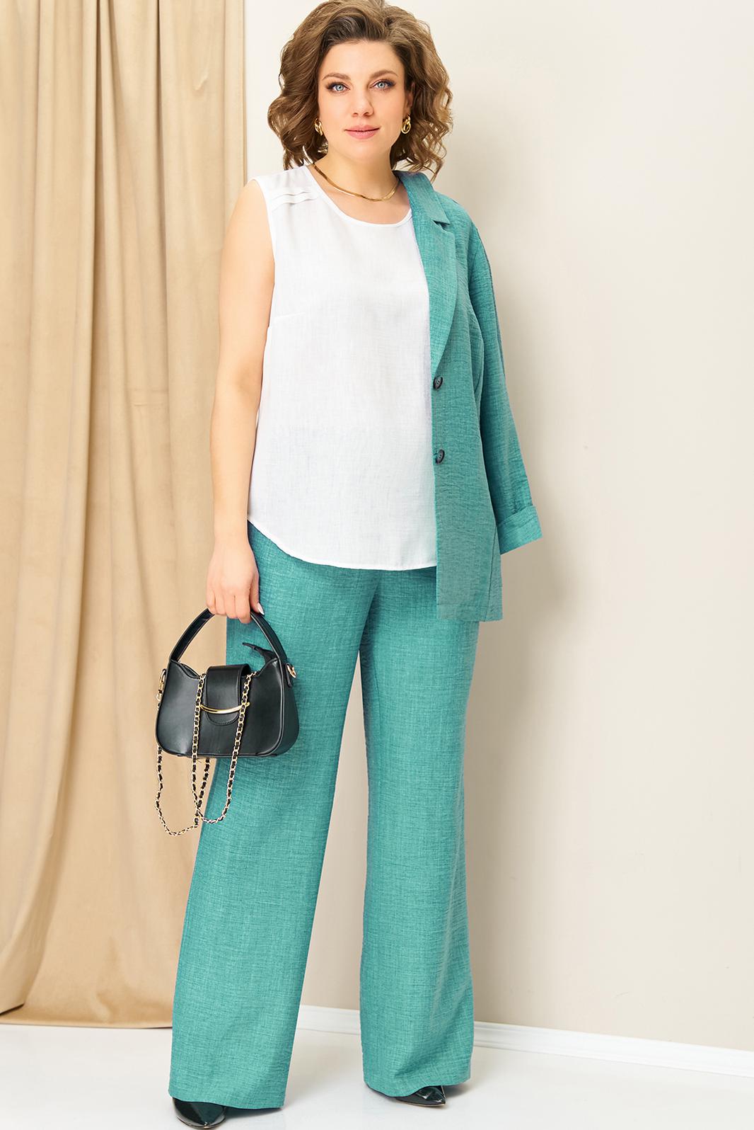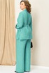 Элегантный комплект- тройка из легкого текстиля. Жакет без подкладки с застежкой на пуговицы, с разрезами по бокам и съемным поясом. Длина жакета по центру спинки- 71см. Рукав жакета втачной, с отворотом. Длина рукава- 56см. Брюки прямые с высокой посадкой, с притачным поясом на резинке. Длина брюк по боковому шву- 100 см. Хлопковая блуза без рукавов с полукруглым низом и складками на плече. Длина блузы по спинке- 65 см. Изысканная брошь в комплекте изделия.