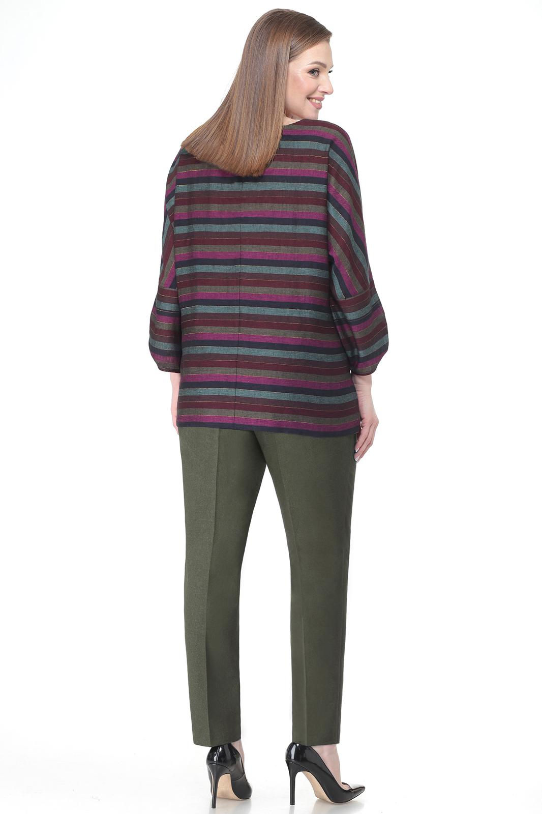 Блузка прямого силуэта с цельнокроеным рукавом из легкой натуральной ткани на основе льна. Длина рукава регулируется патой. Длина блузки по центру спинки- 67см. Брюки зауженные с высокой посадкой, с притачным поясом на резинке. Длина брюк по боковому шву- 98см.