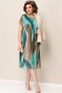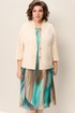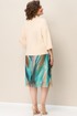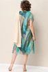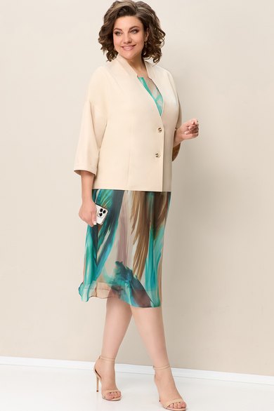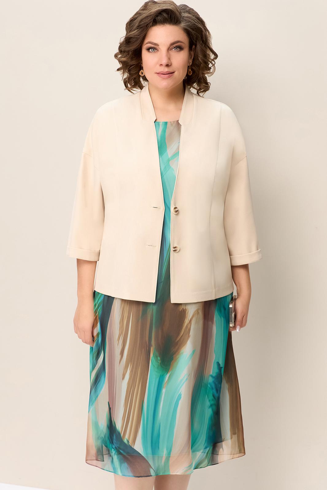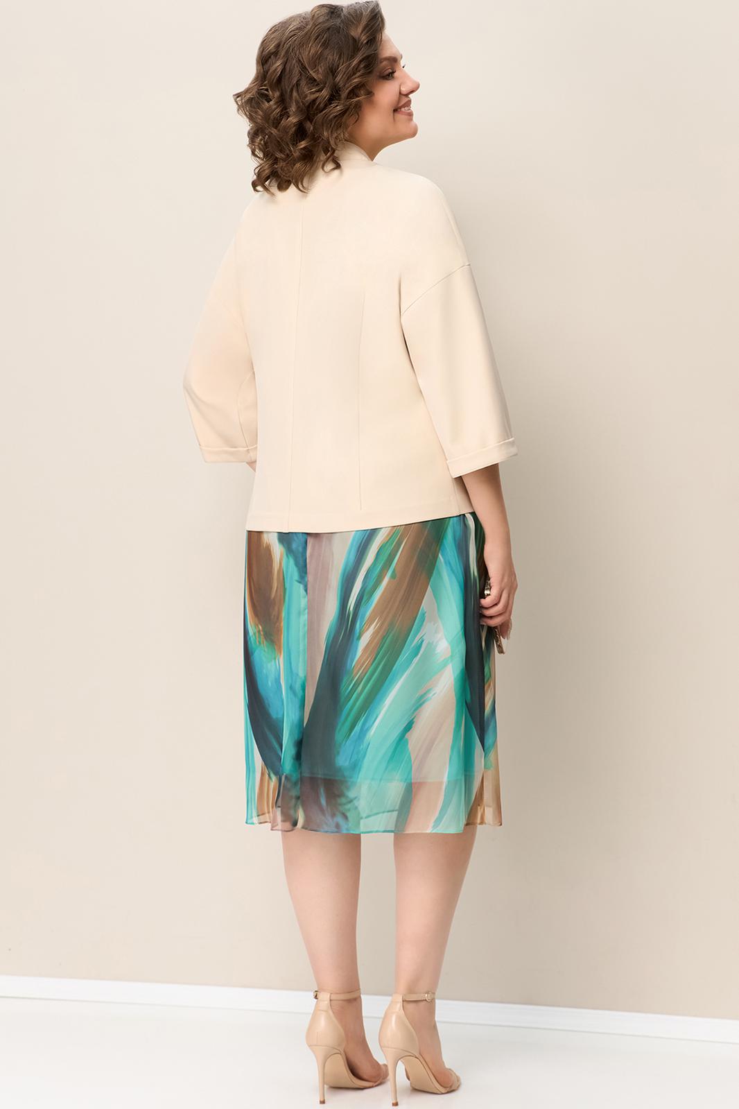 Стильный нарядный комплект из жакета из легкого текстиля и летящего платья из шифона. Жакет прямого силуэта с воротником полустойка, без подкладки. Длина жакета по центру спинки- 61см. Застежка спереди на две пуговицы. Рукав спущенный с подворотом, длина рукава- 47см. Легкое платье полуприлегающего силуэта с небольшим расклешением книзу. Рукав платья короткий спущенный. Длина платья по спинке-110 см.